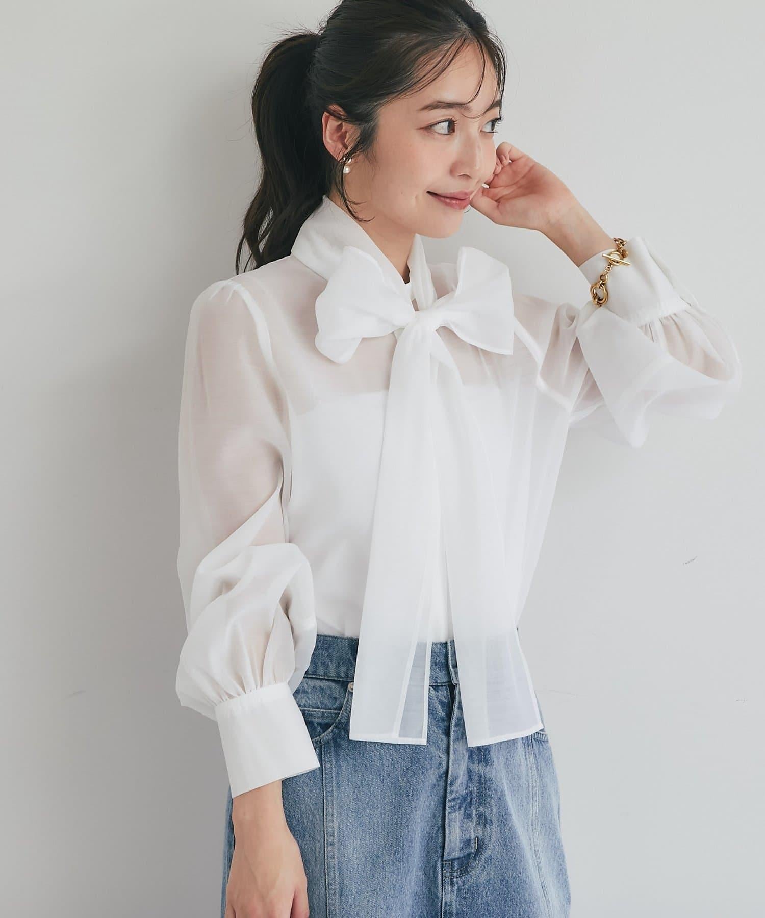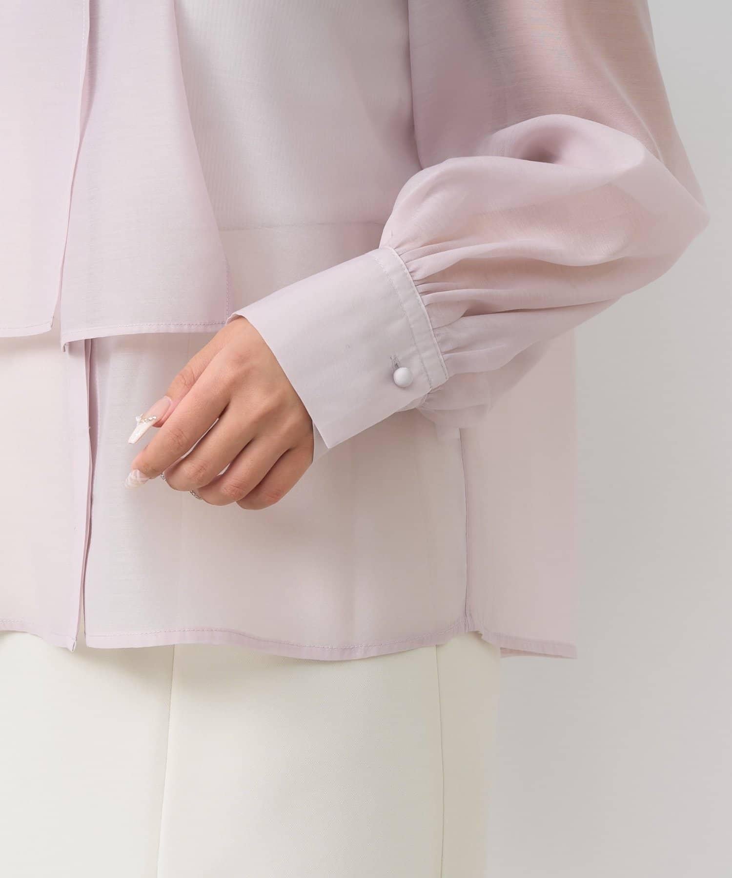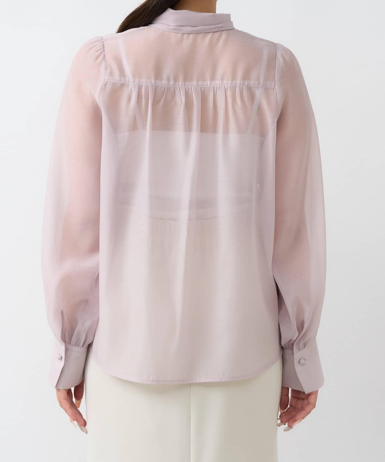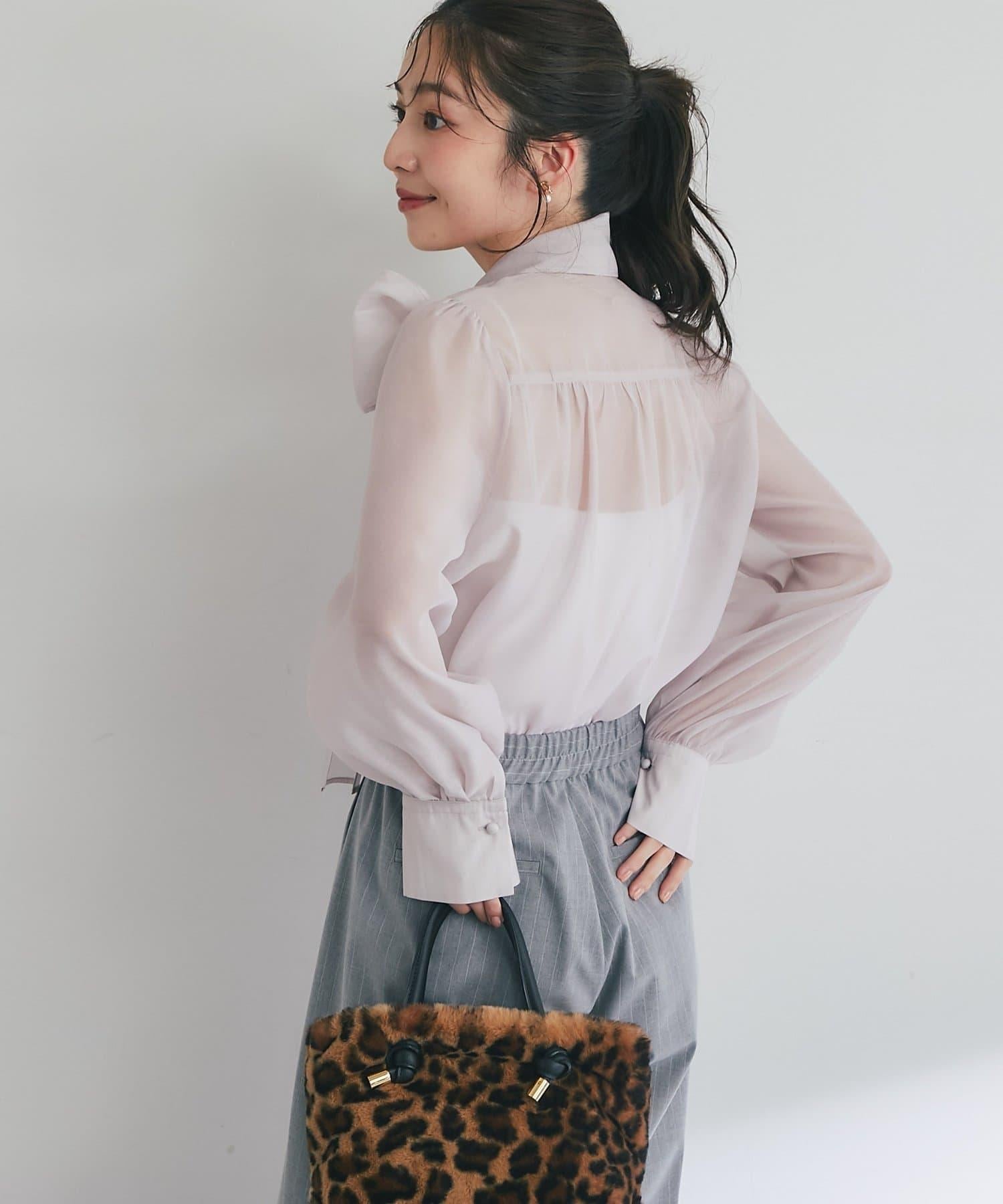 帶有大蝴蝶結領結設計的透視上衣既迷人又優雅。