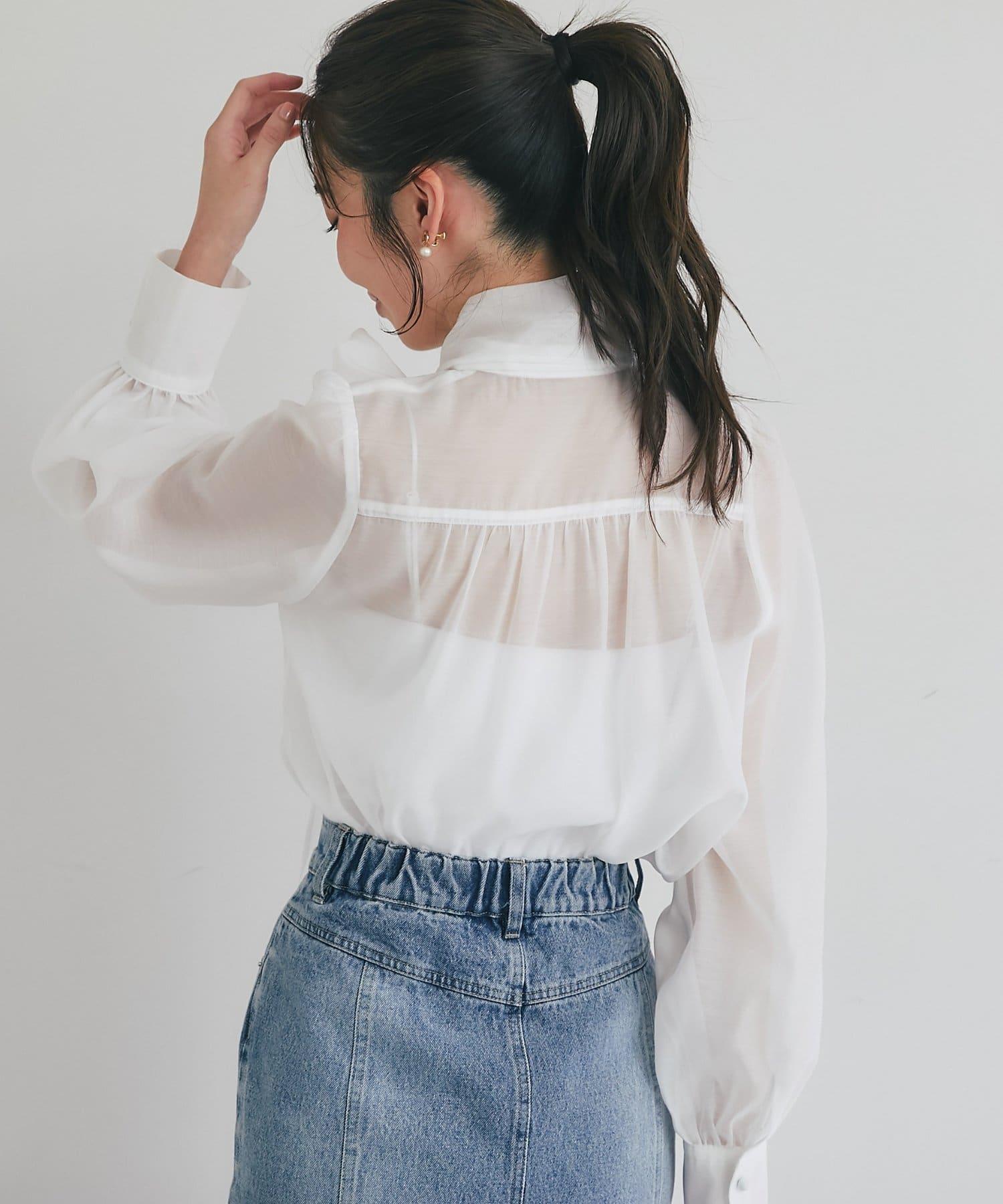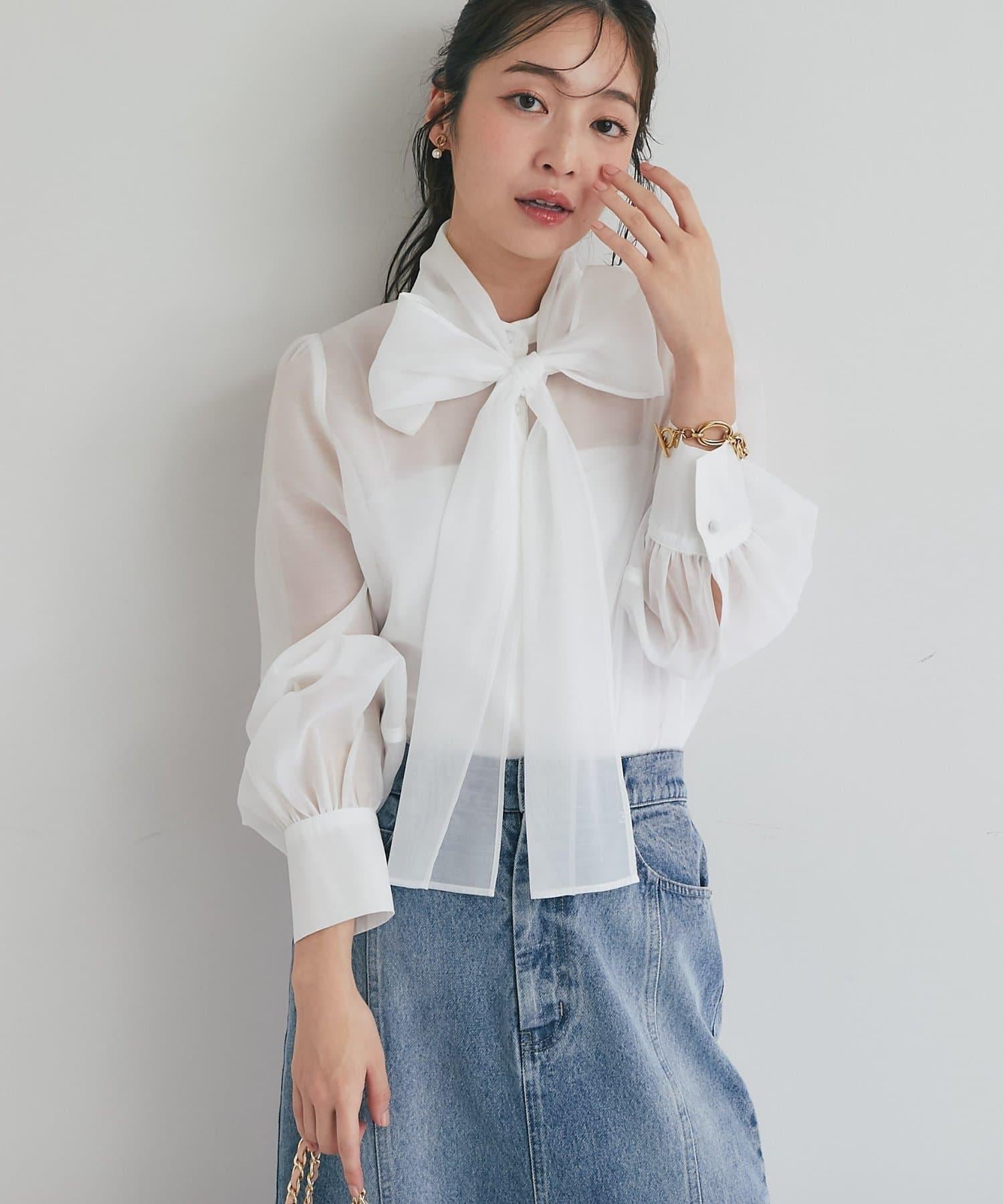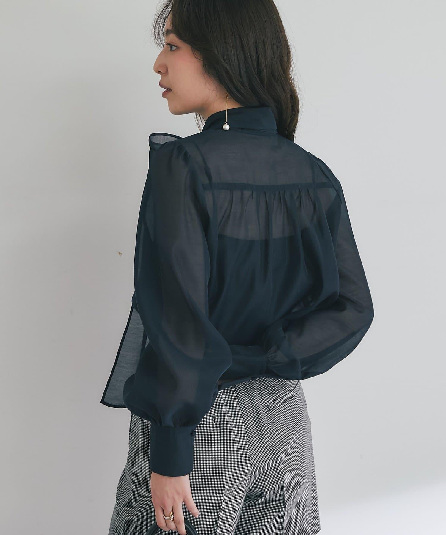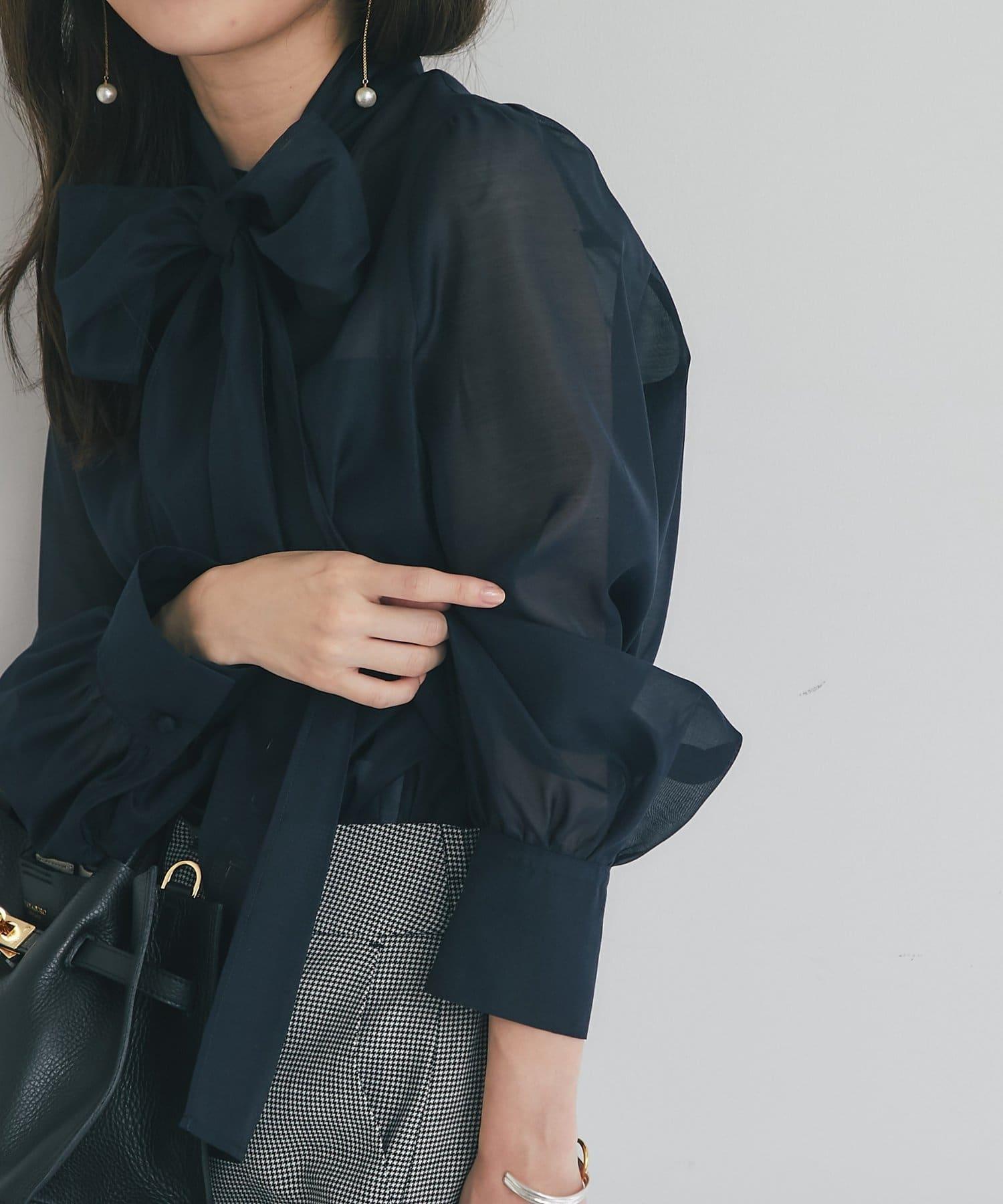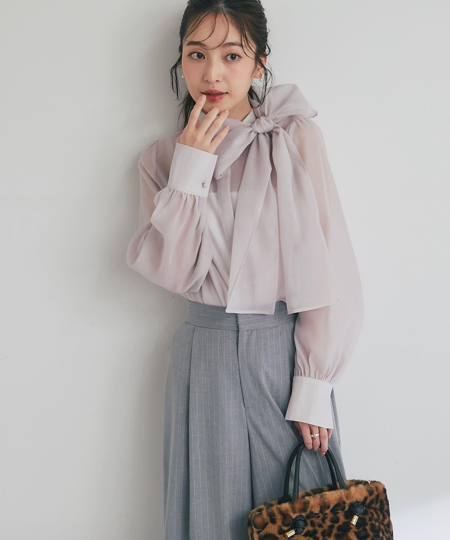 帶有大蝴蝶結領結設計的透視上衣既迷人又優雅。