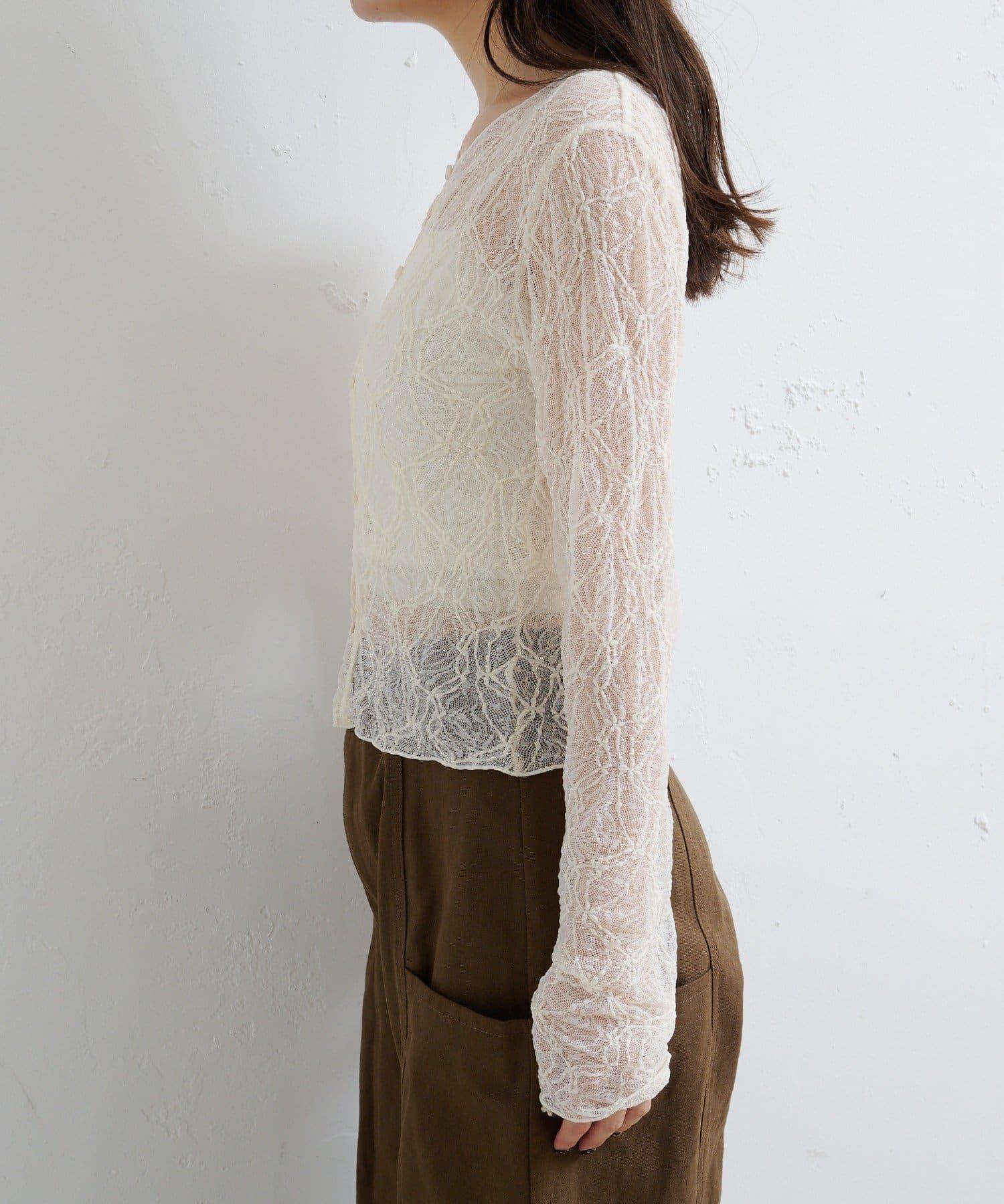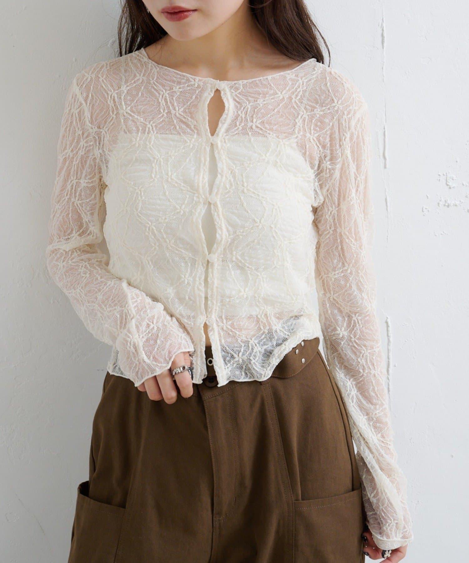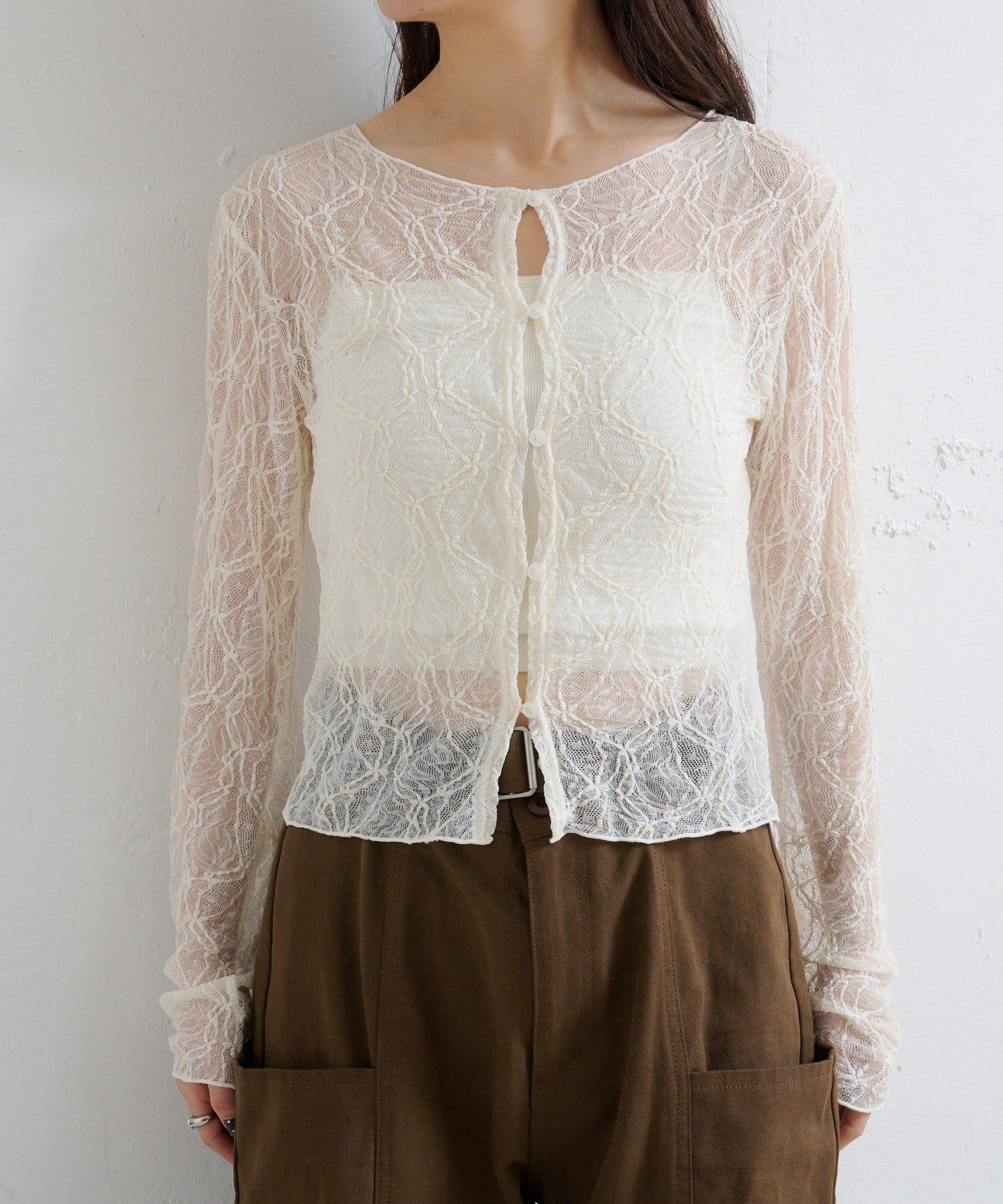 這款雙面透視開衫採用精緻的蕾絲面料,盡顯女性柔美氣質。