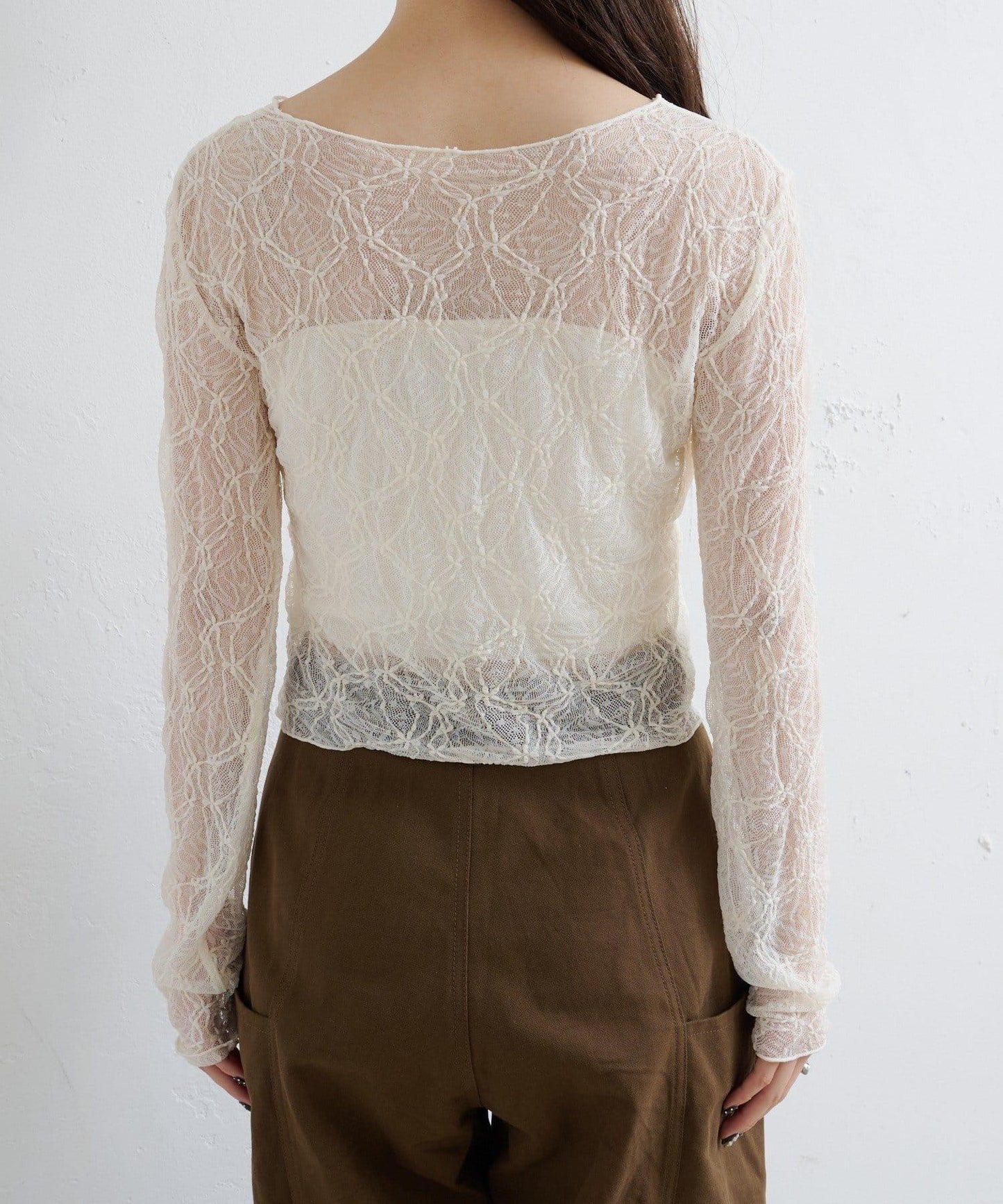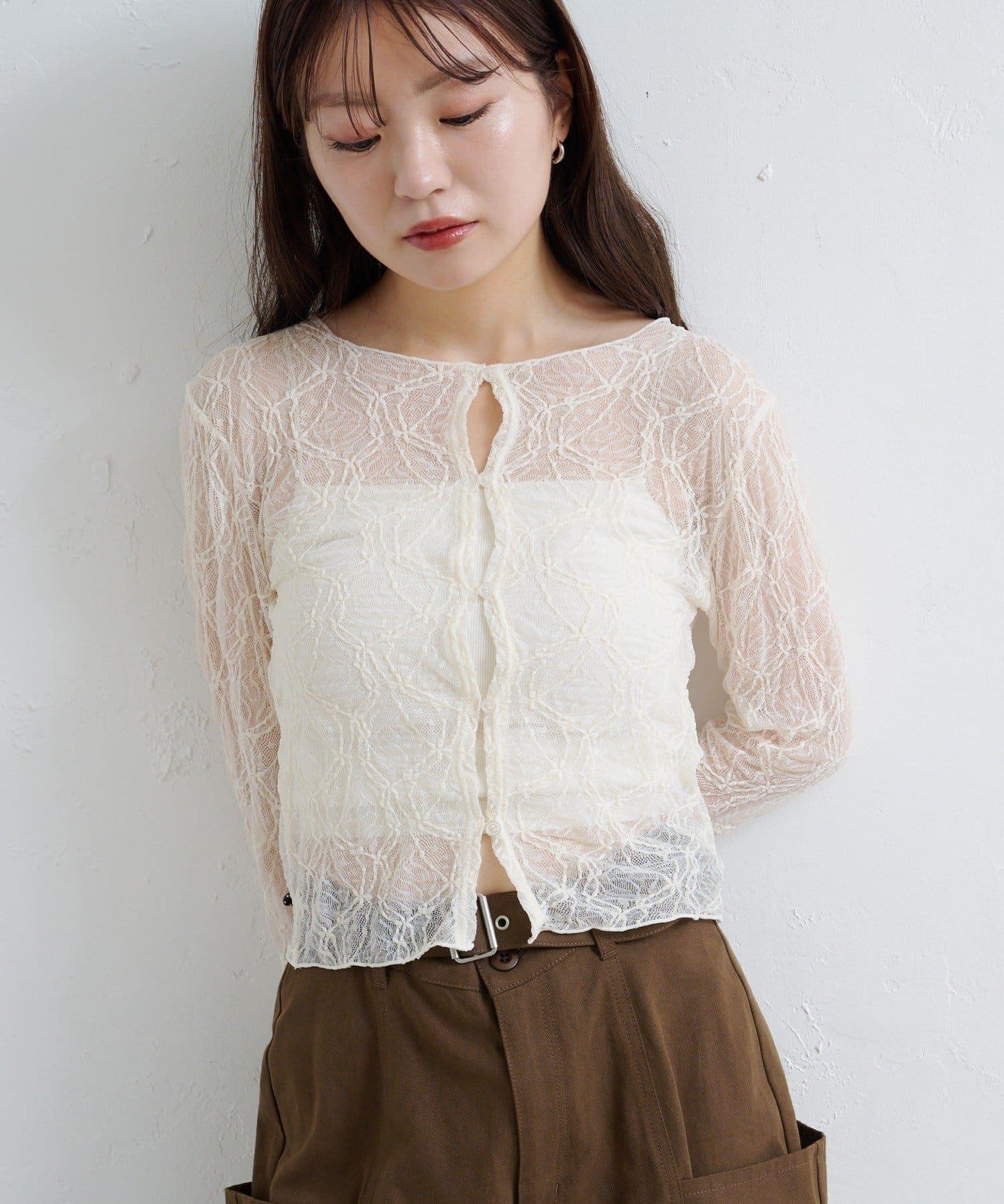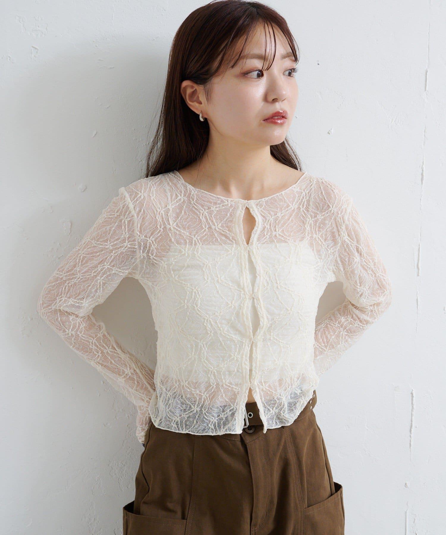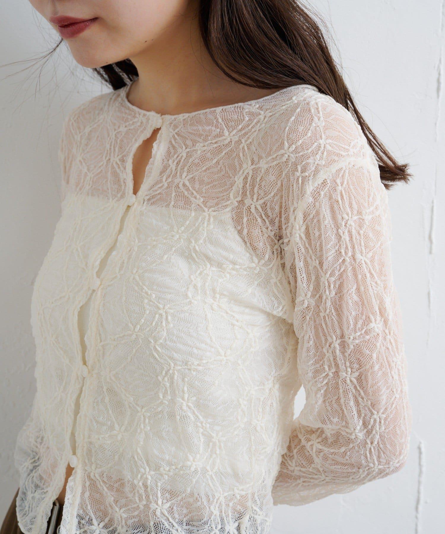 這款雙面透視開衫採用精緻的蕾絲面料,盡顯女性柔美氣質。