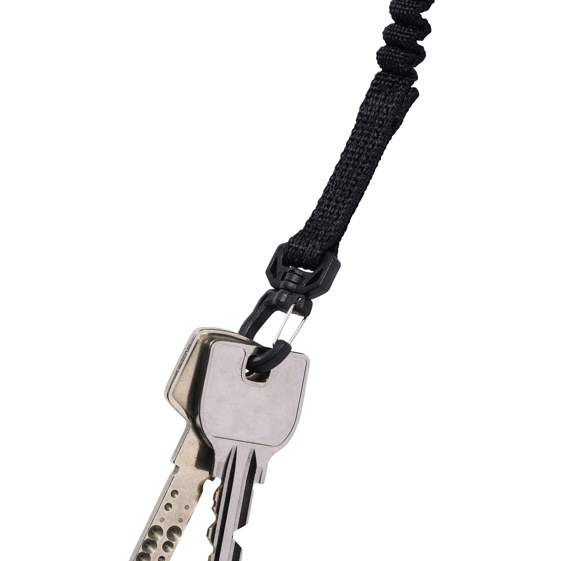 用於攜帶錢包和鑰匙的多功能揹帶。波浪形部分由高彈性材料製成,可拉伸至原長度的兩倍,為打開鑰匙和取出錢包提供巧妙的支撐。該揹帶可通過一個按扣輕鬆固定在腰帶或包上。