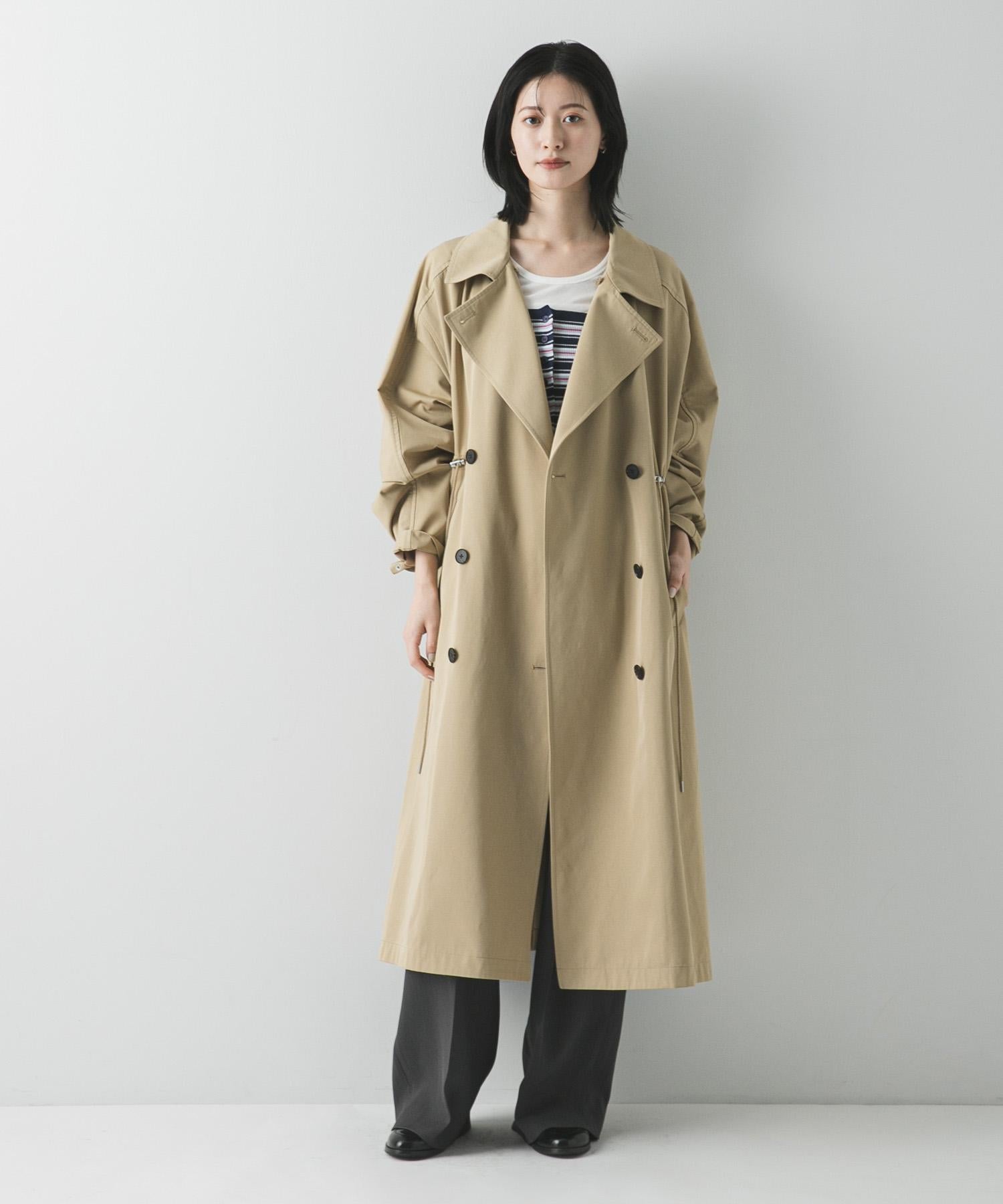 採用柔軟、回彈性好的面料製成。 既保持了經典的風衣氛圍,又不失輕盈舒適的魅力。整潔的雙排扣設計和長款設計營造出良好的體積感和垂直線條。