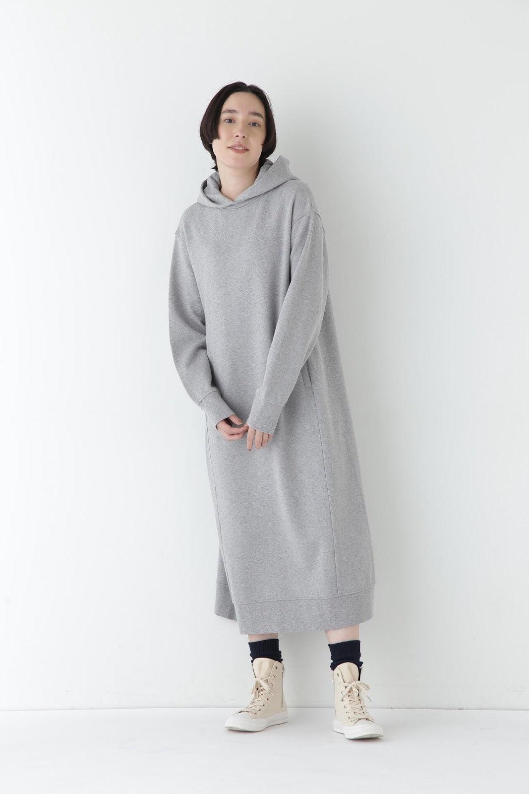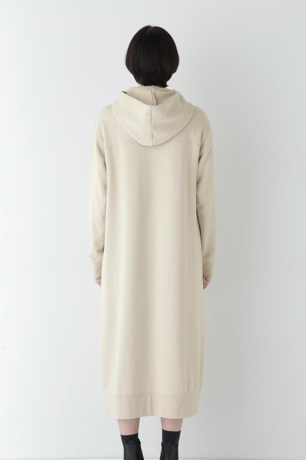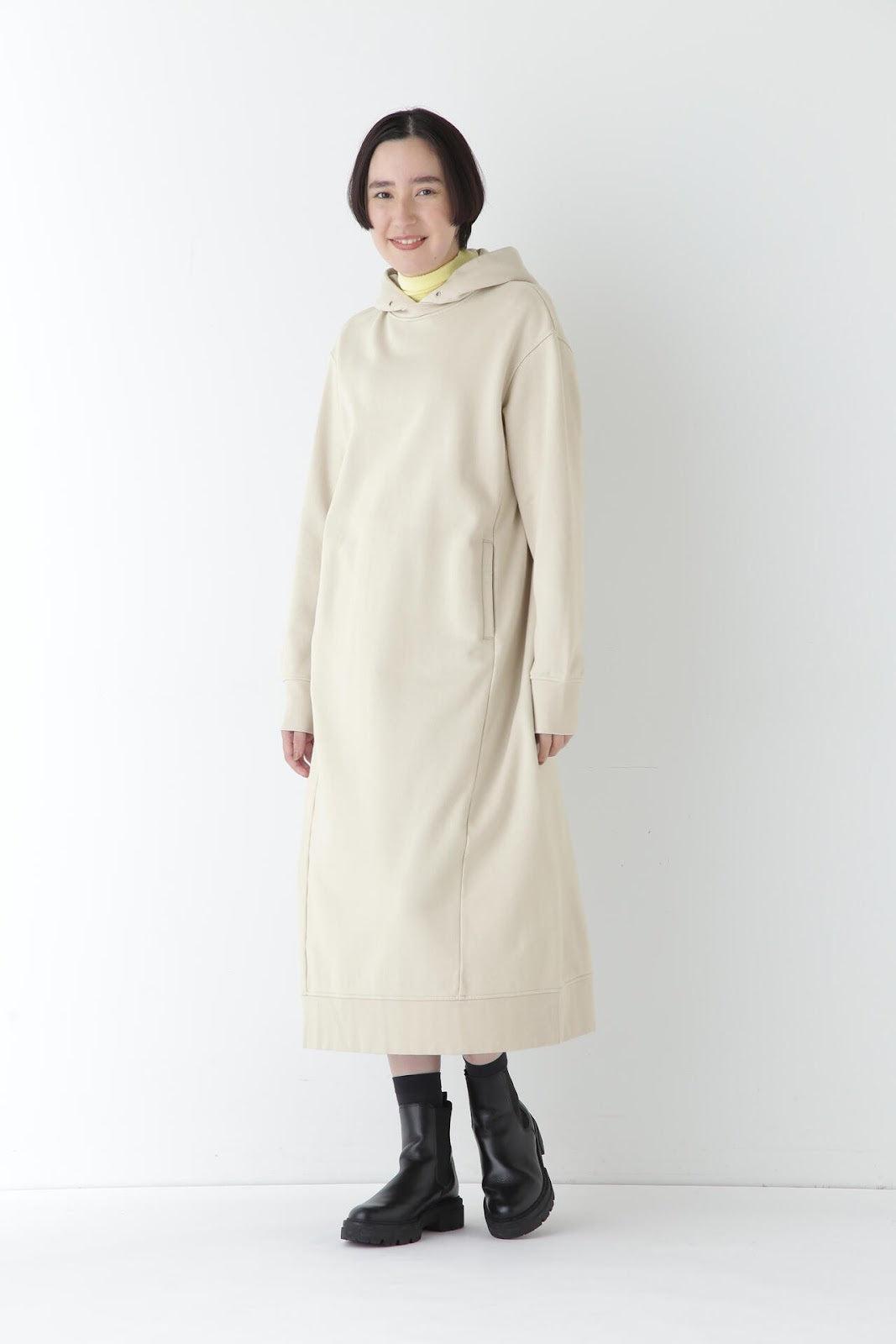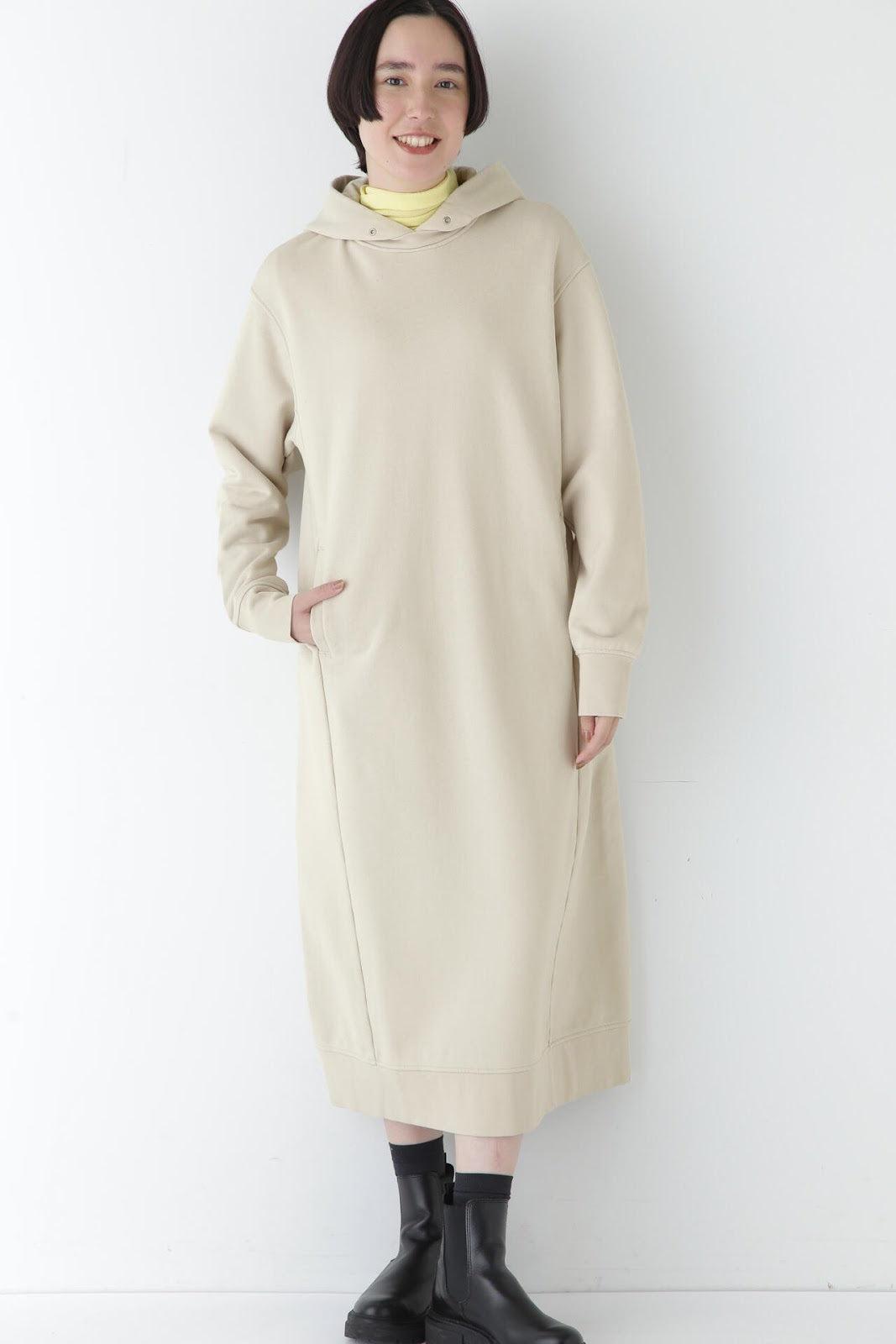連帽連衣裙,輕鬆愉悅的連體外觀 [設計要點] 這款運動型衛衣連帽連衣裙給人一種輕鬆的感覺。下襬的針織羅紋張力使其輪廓略顯繭形,並有細微的修飾效果。面料內襯為預有機棉,表面蓬鬆潔淨。這是一款適合早春穿著的寬鬆連身裙。它是一款可愛的成人休閒單品,也可與外衣搭配,將兜帽打開穿著。