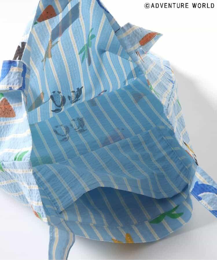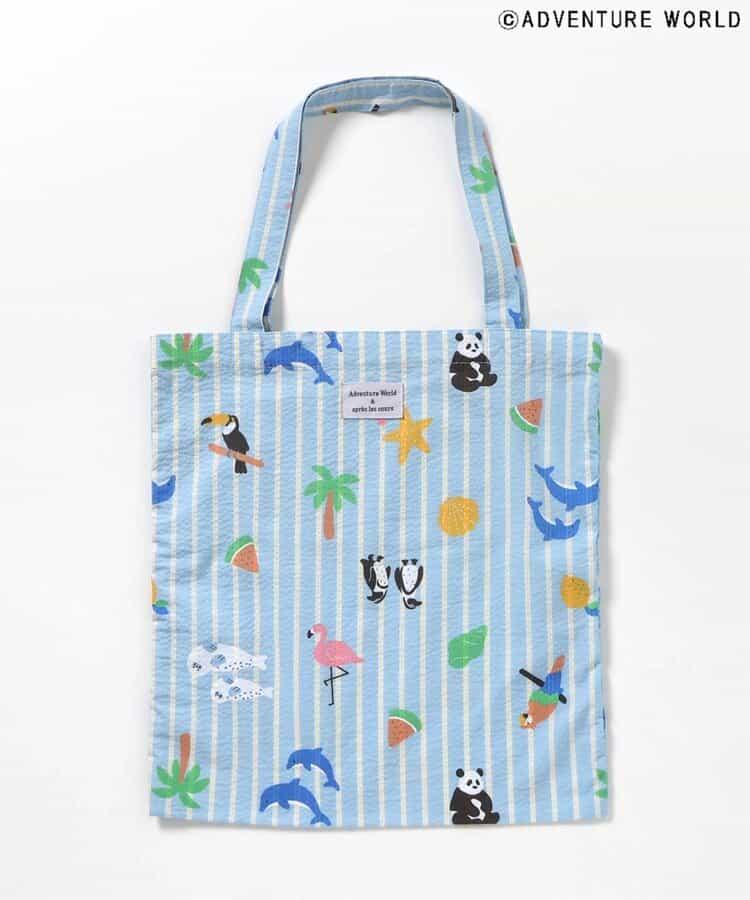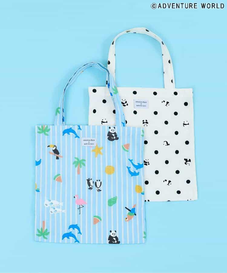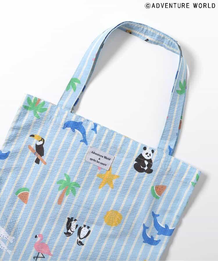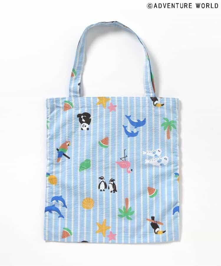 藍色的手提袋上有可愛的大熊貓、企鵝、海豚等動物圖案,還有西瓜、棕櫚樹等夏日圖案、