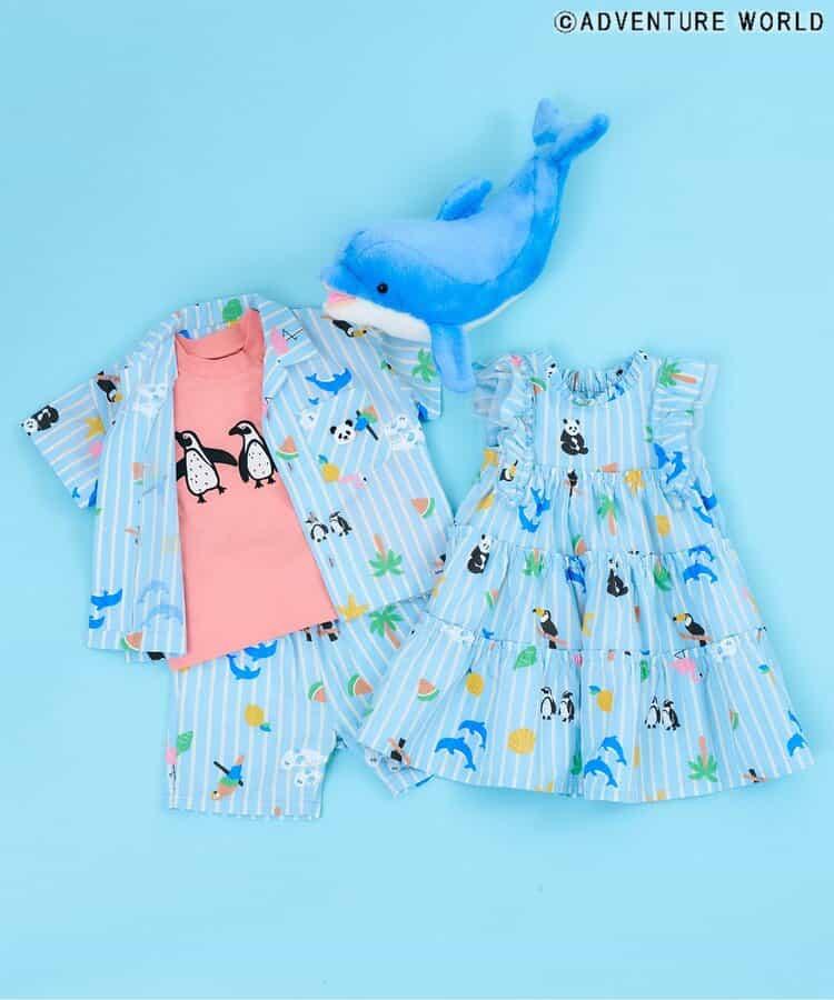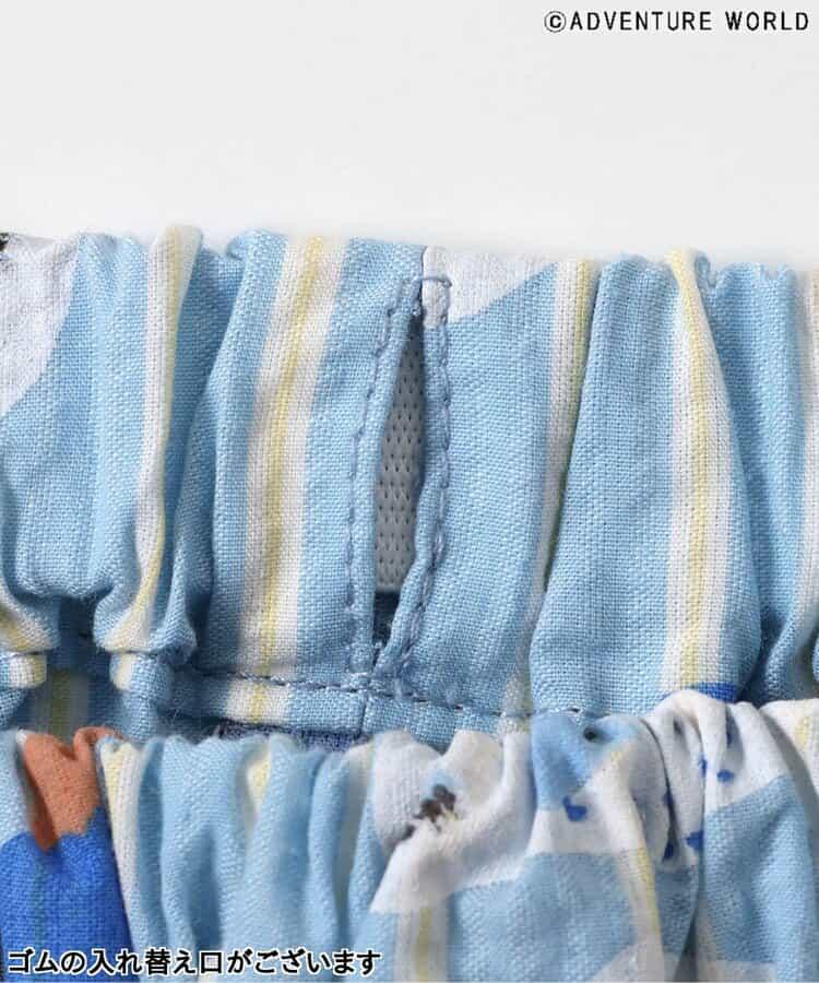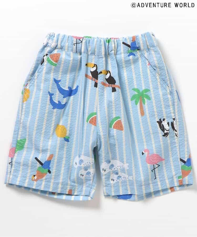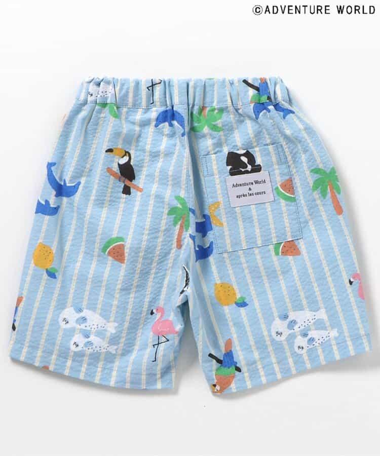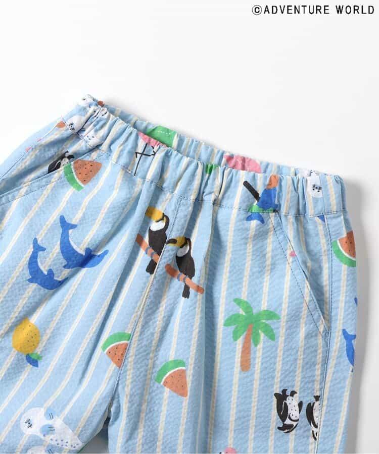 可愛的藍色褲子上有熊貓、企鵝、海豚等動物以及西瓜和棕櫚樹等夏日圖案、