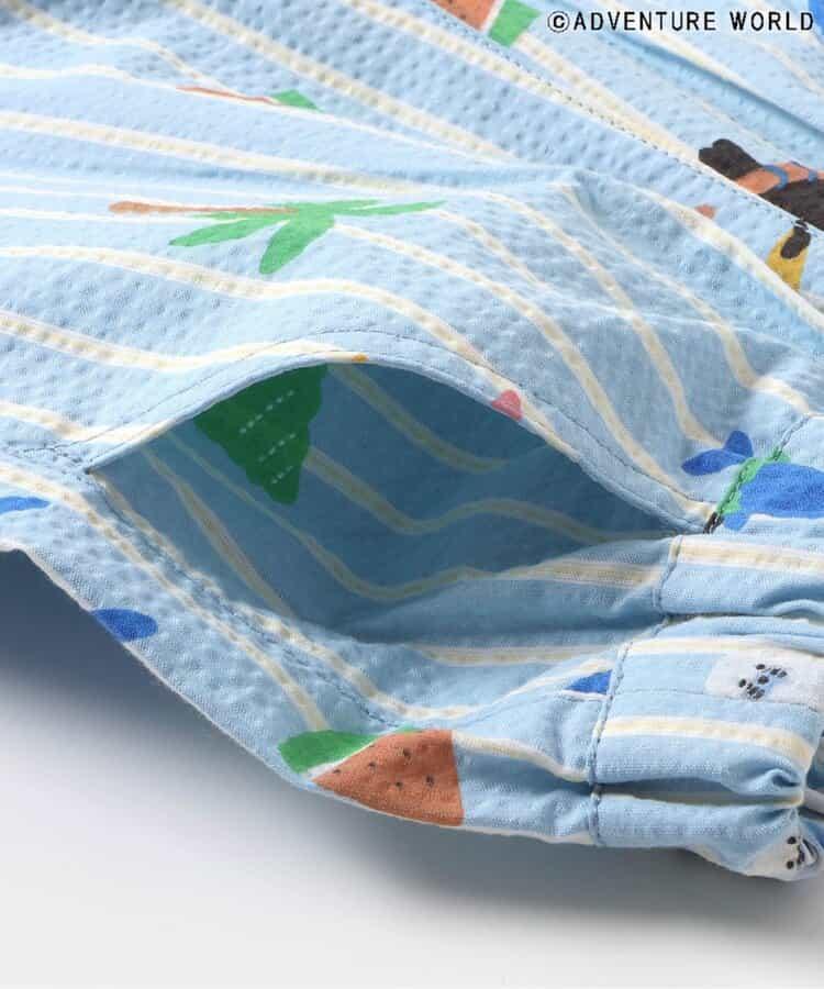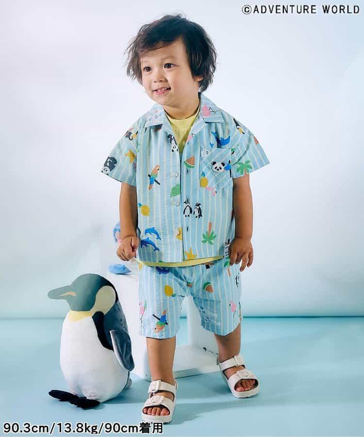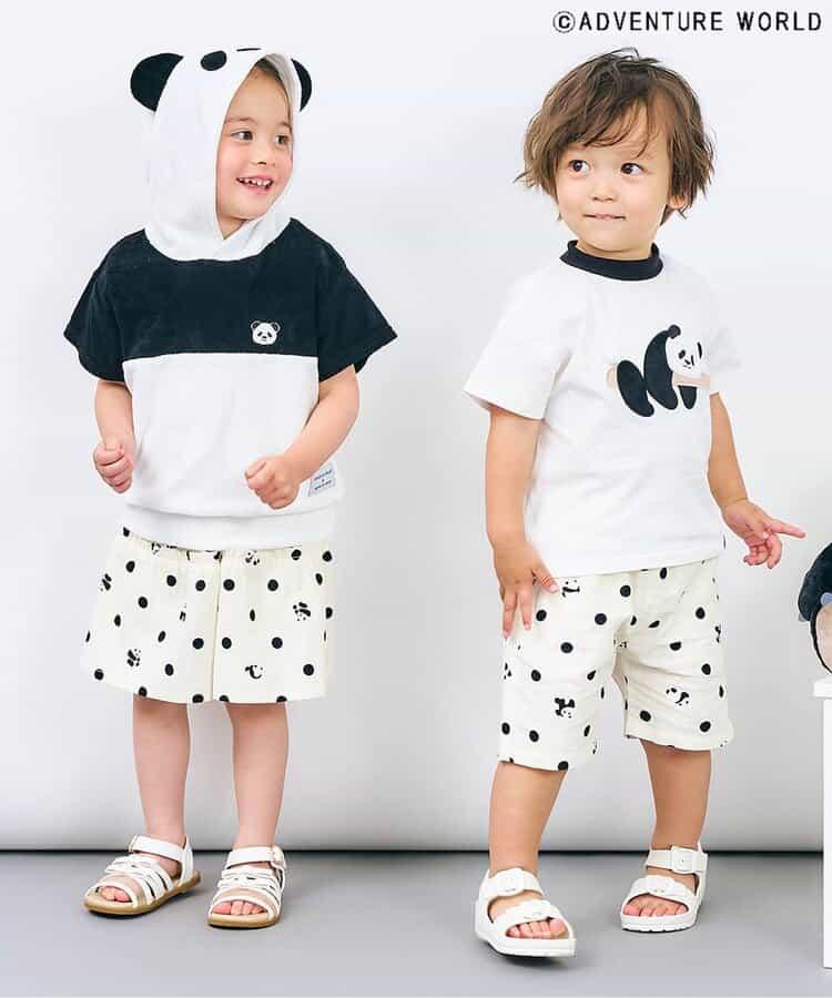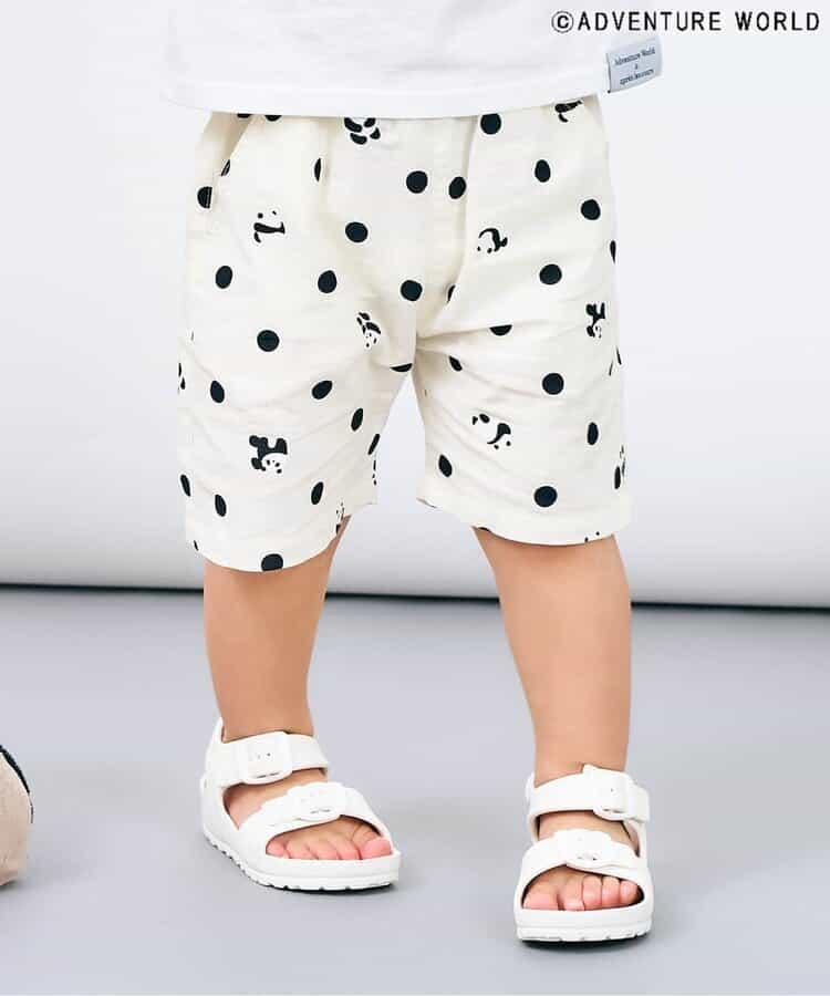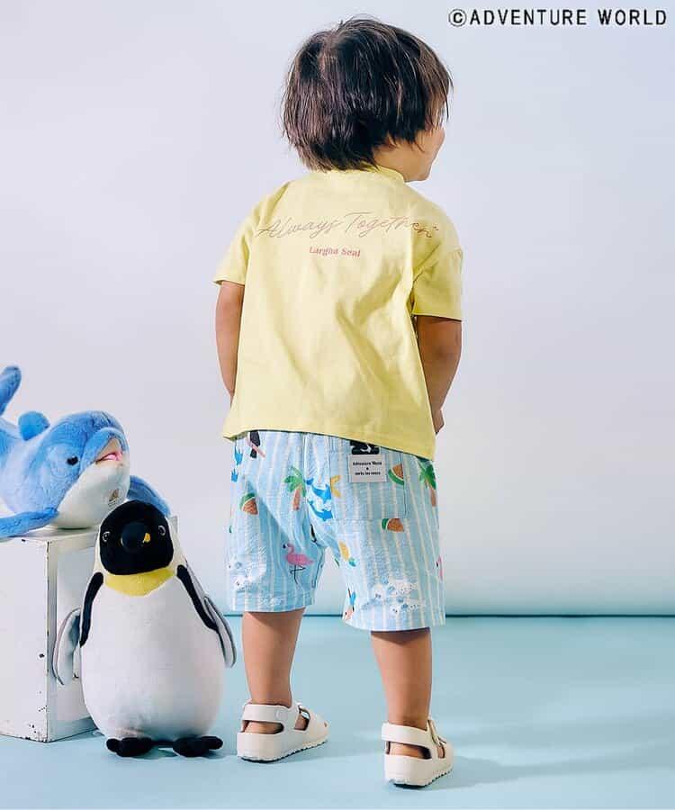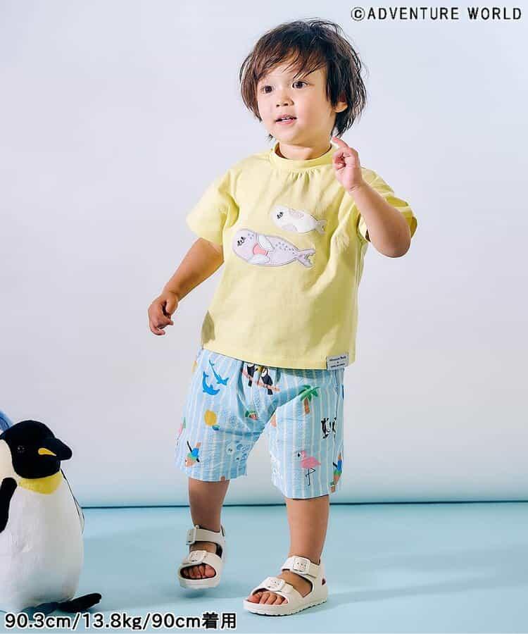 可愛的藍色褲子上有熊貓、企鵝、海豚等動物以及西瓜和棕櫚樹等夏日圖案、