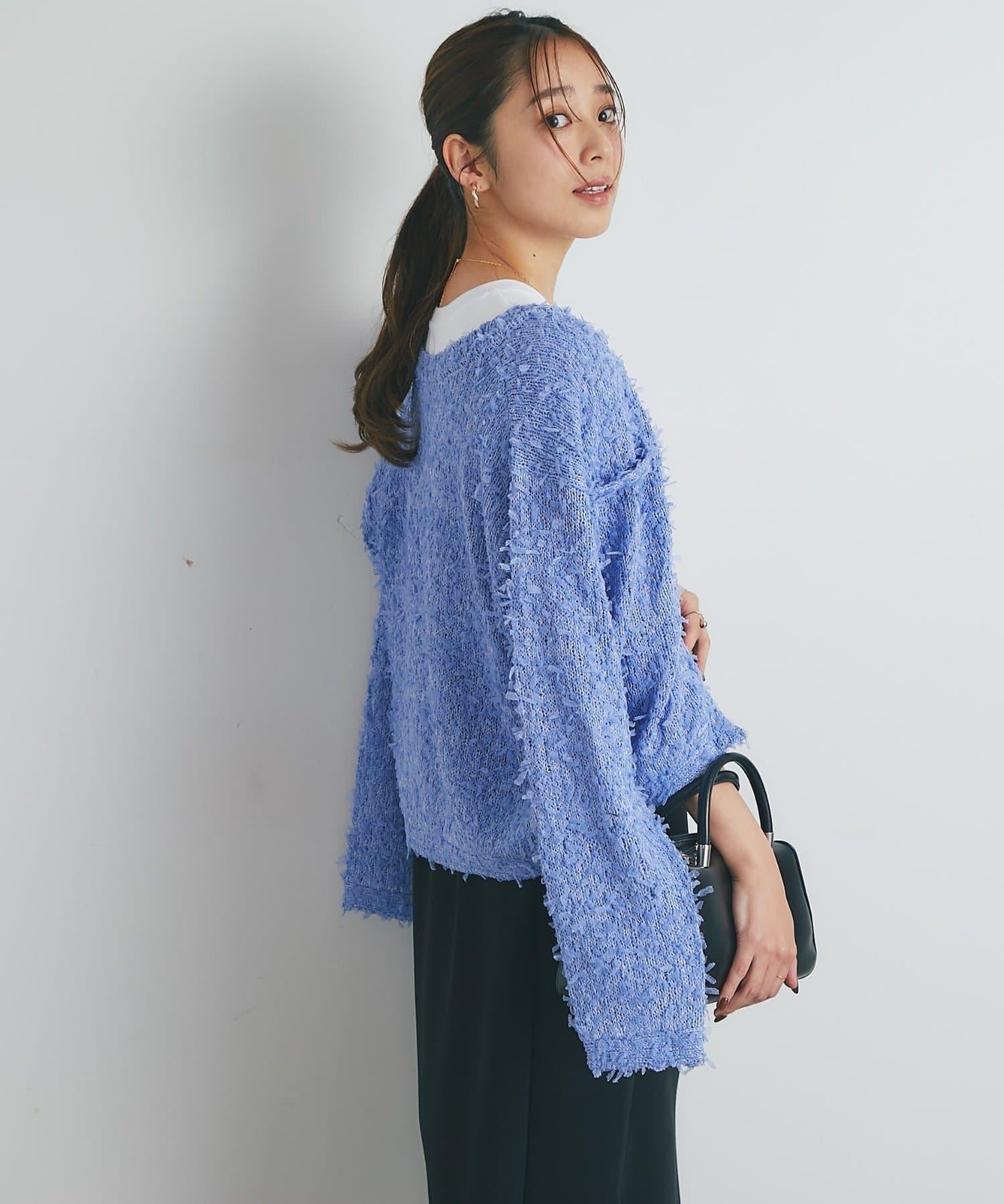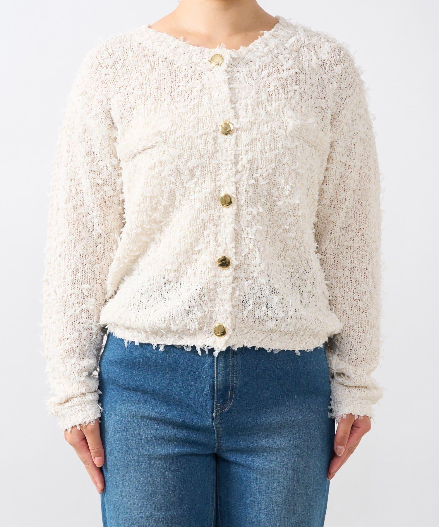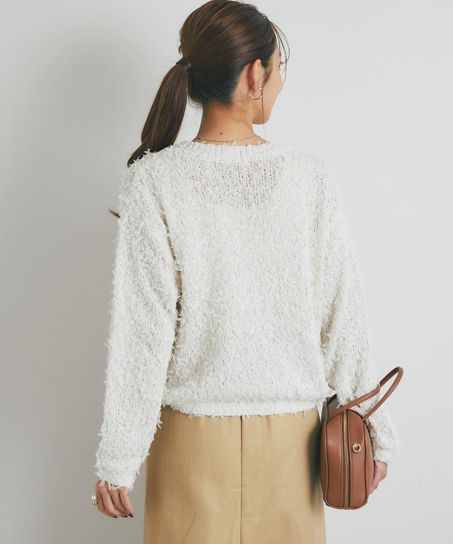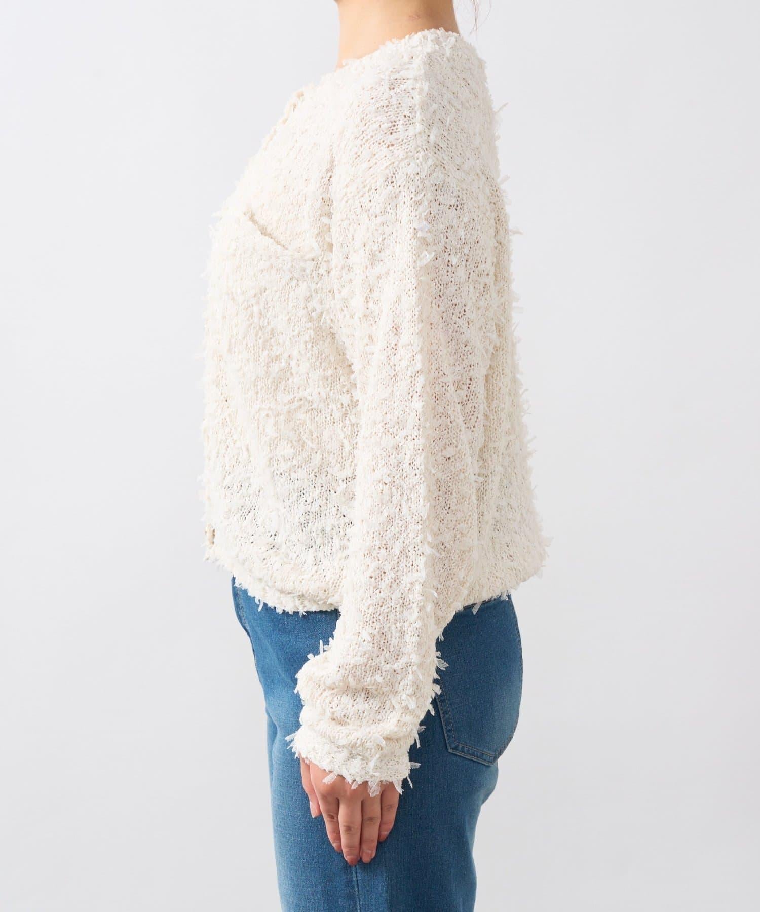 這款開襟羊毛衫採用薄紗帶紗面料製成,略帶薄紗感,給人寬鬆的感覺。