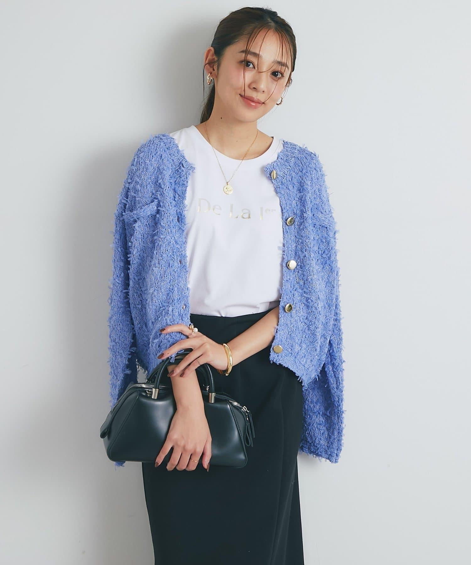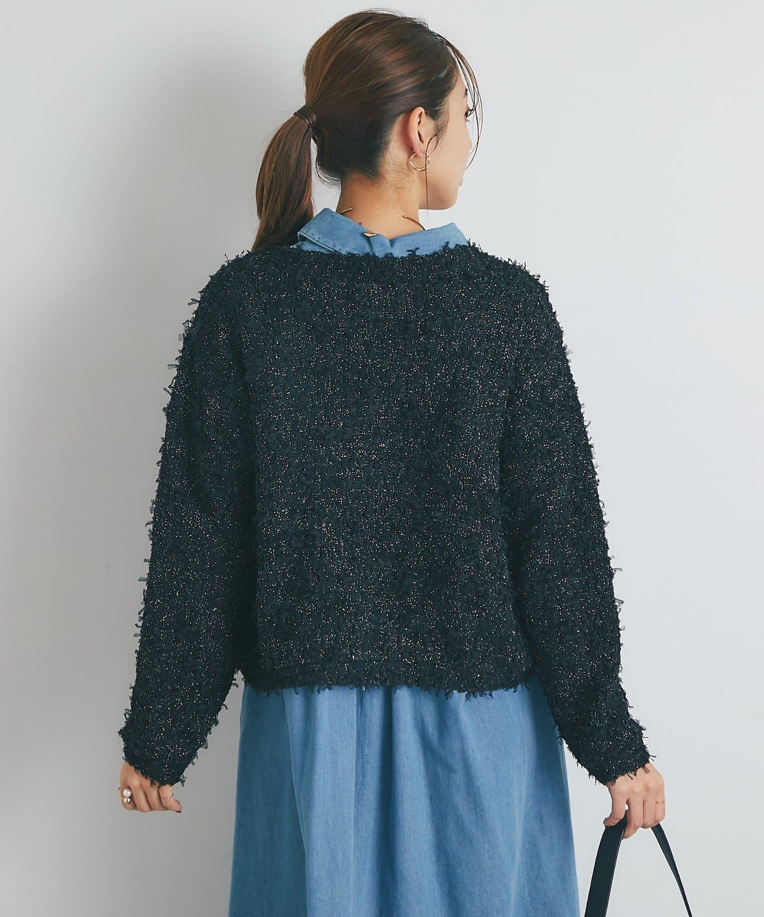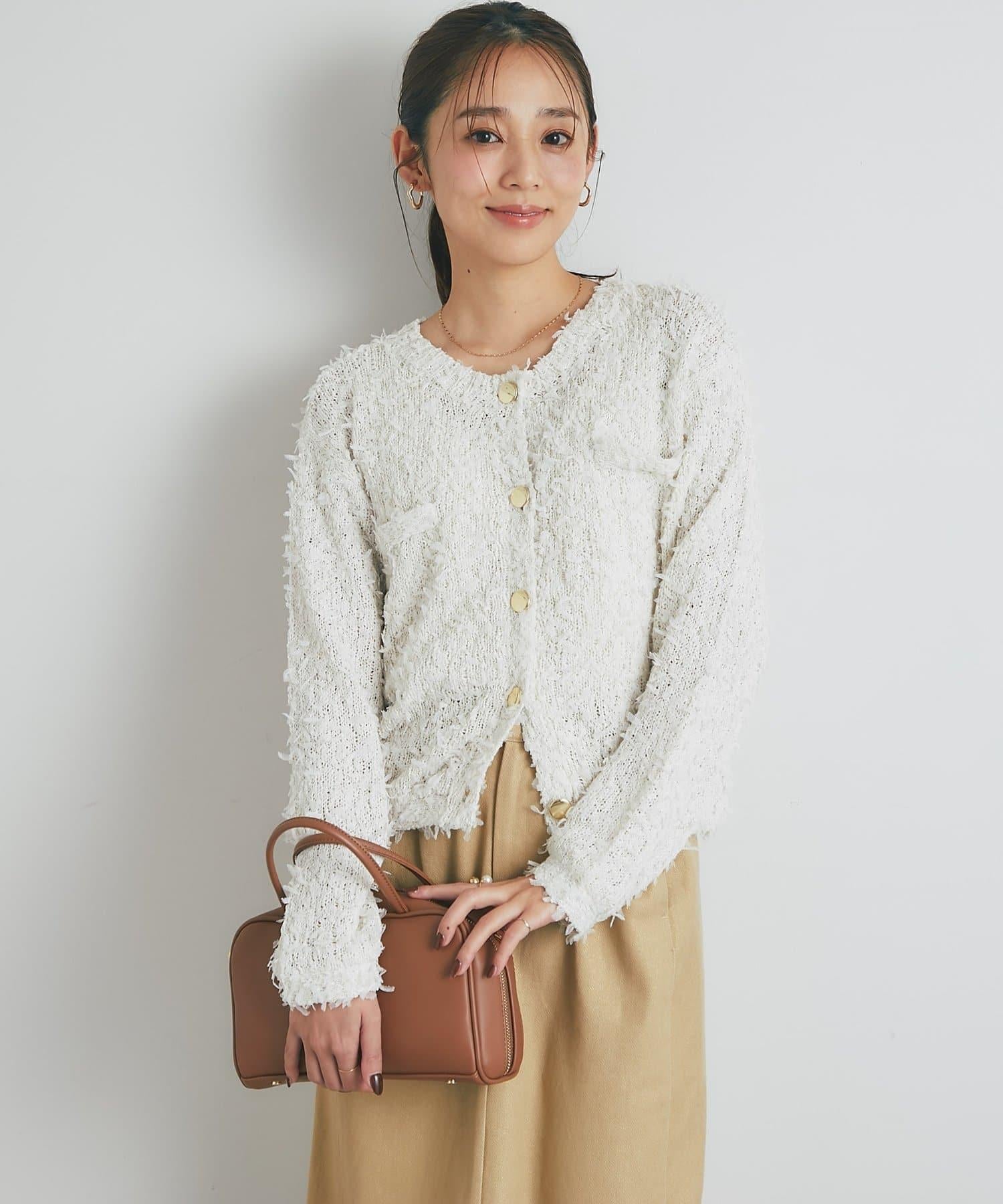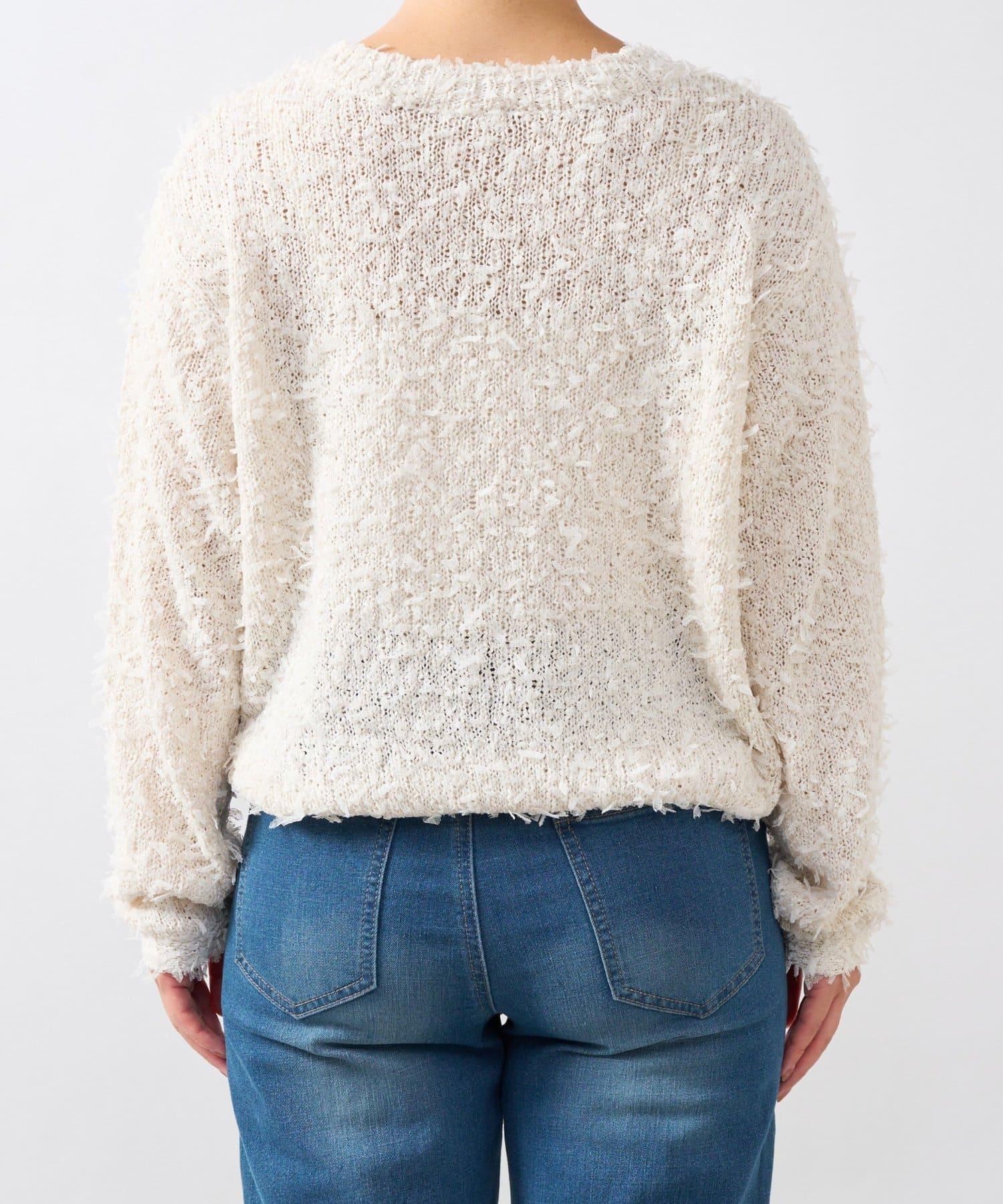 這款開襟羊毛衫採用薄紗帶紗面料製成,略帶薄紗感,給人寬鬆的感覺。