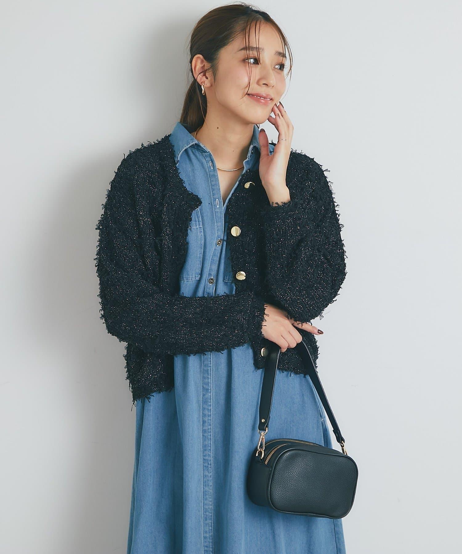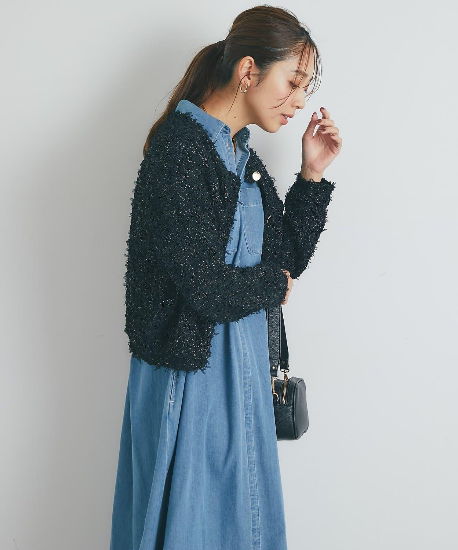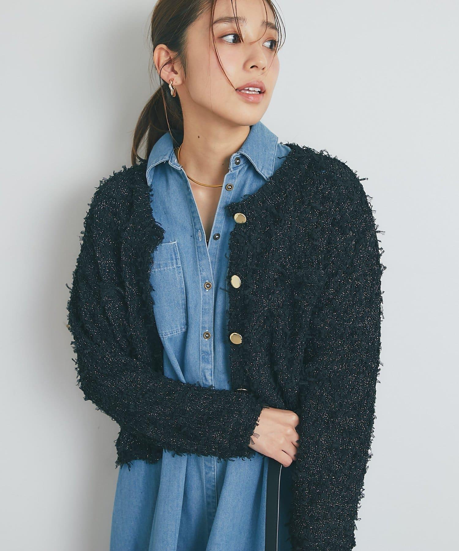 適合打造輕盈造型的亮片薄紗帶紗線金色紐扣開衫