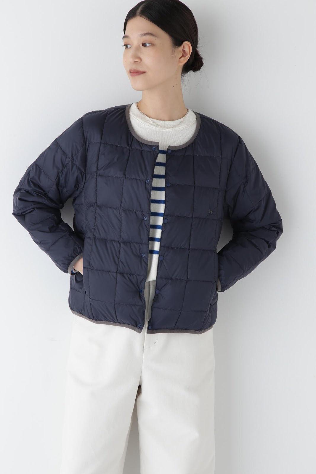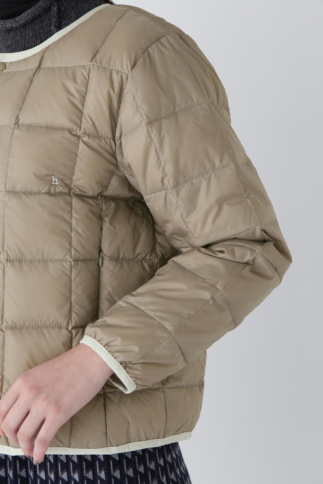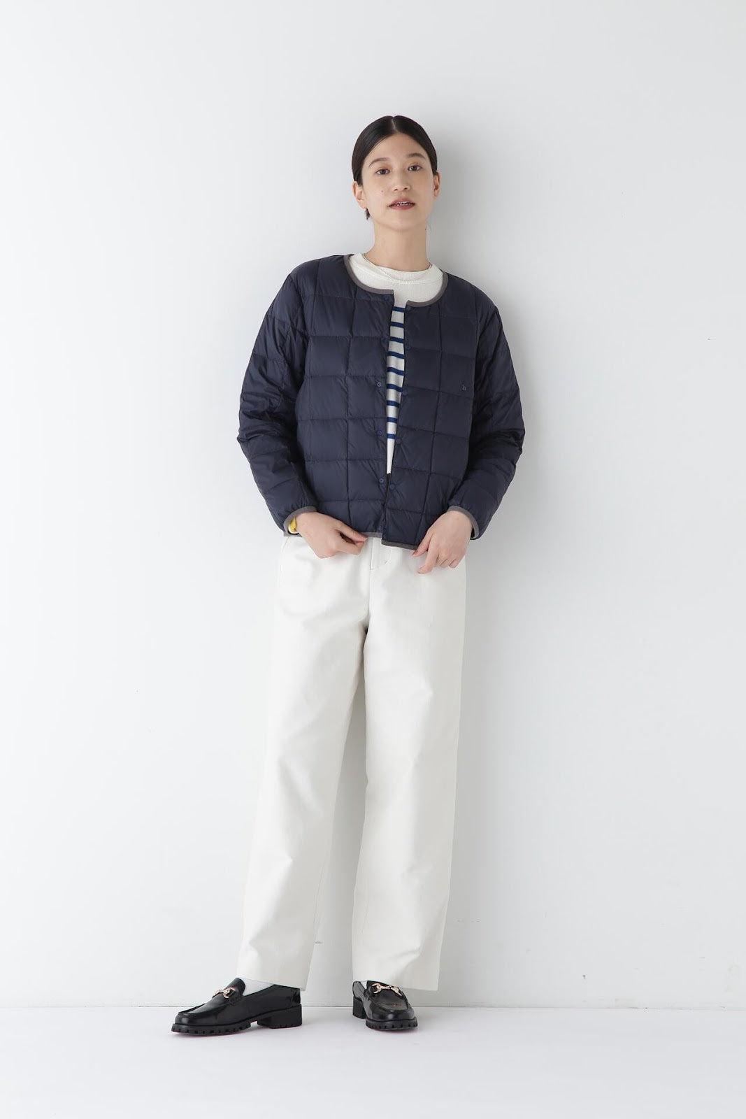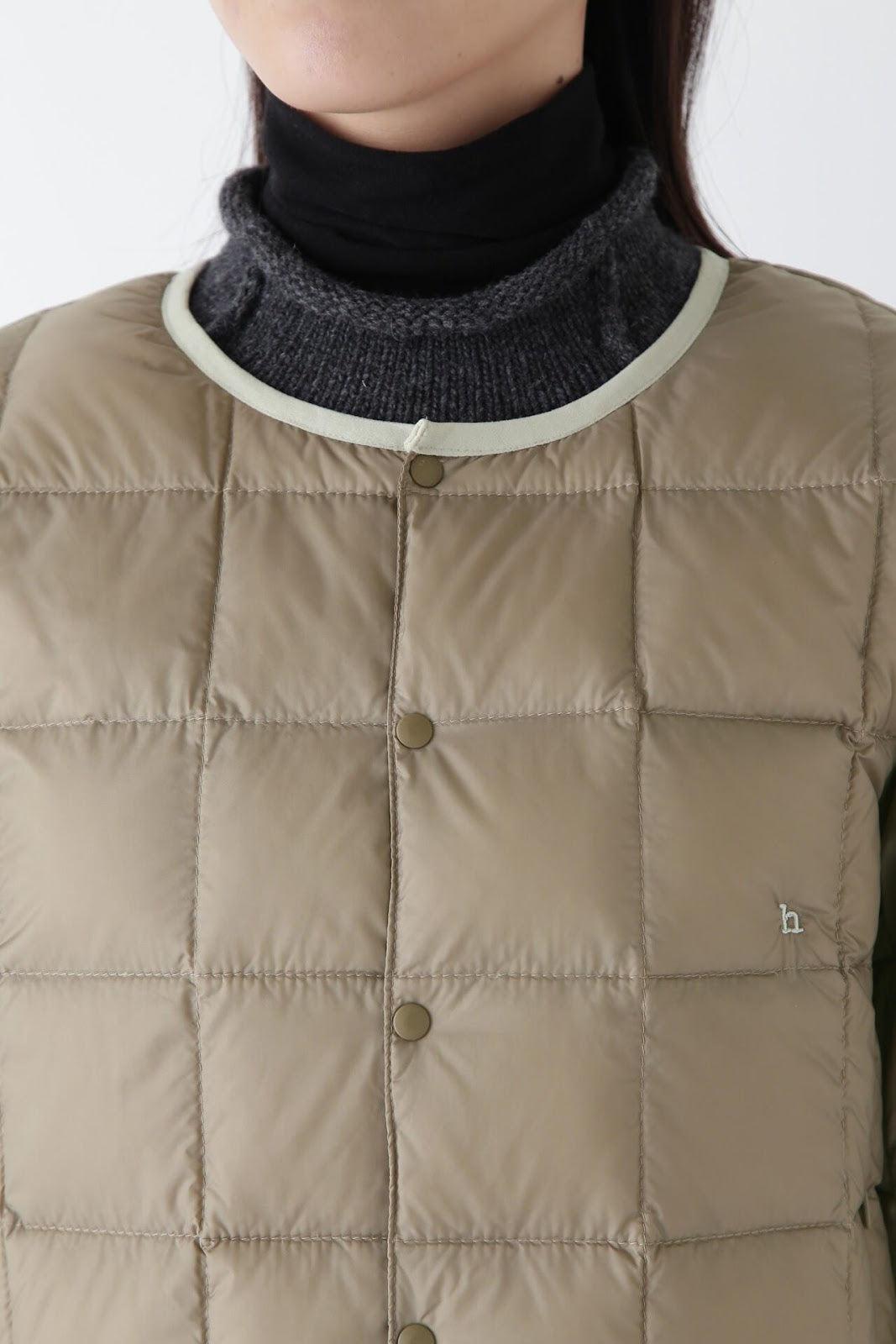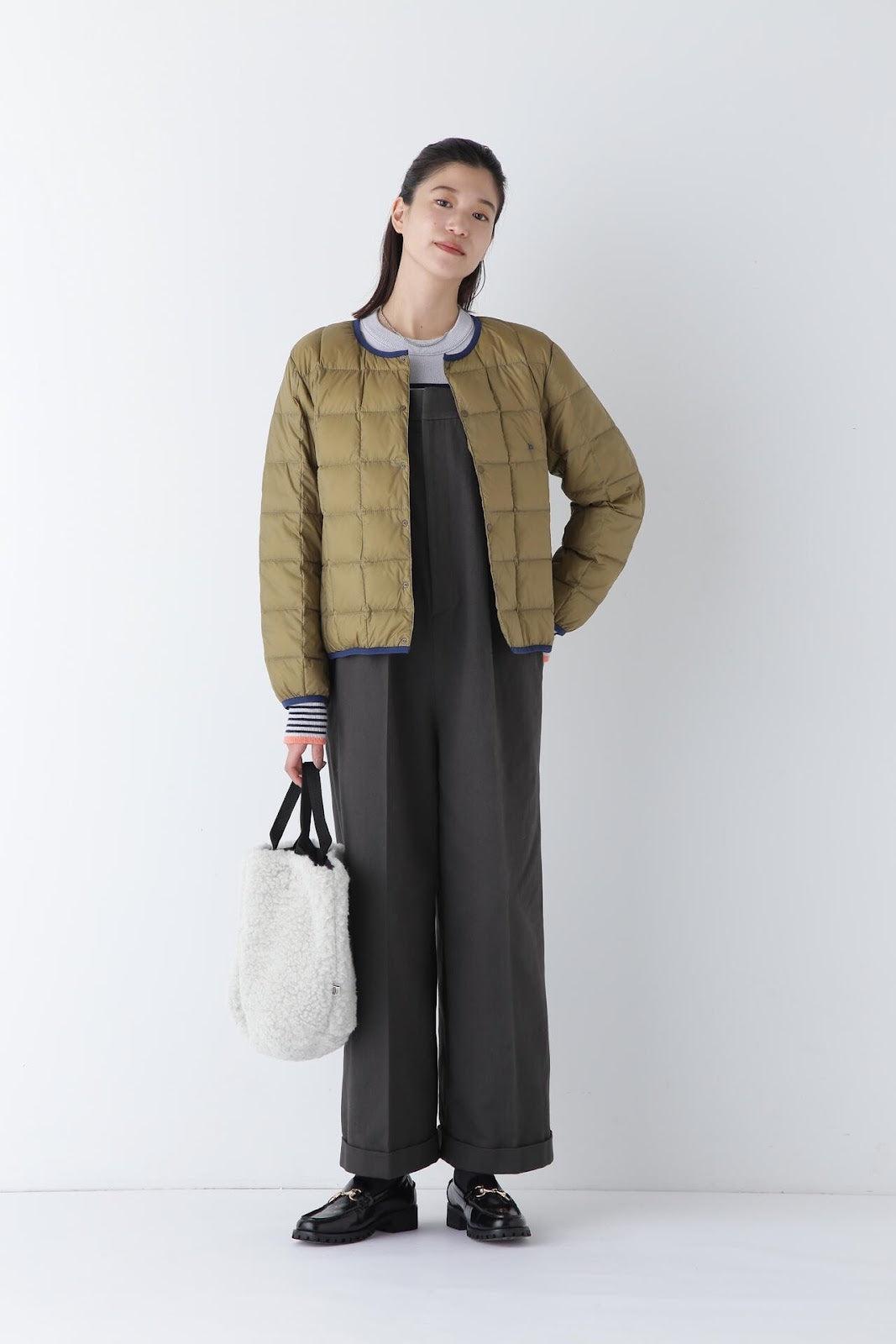 TAION×human woman 合作項目中的紐扣羽絨服 [設計要點] 這款羽絨服被視為 TAION 的標準產品,是按照人類女性的規格特別定製的。為了與人類女性的外衣相匹配,對尺寸進行了修改,並按照滾邊規格製作了衣領。滾邊的顏色也應用到了內襯上,色彩搭配是設計的一個亮點。原來的 "Bonjour "印花也被應用到了可打包的抽繩上,左胸前繡有 "h"。面料要點] TAION 採用了比普通羽絨更蓬鬆的羽絨,因此輕便而保暖。紗線也經過特殊設計,與羽絨和薄面料相匹配。推薦座標] 裁剪縫製和襯衫。