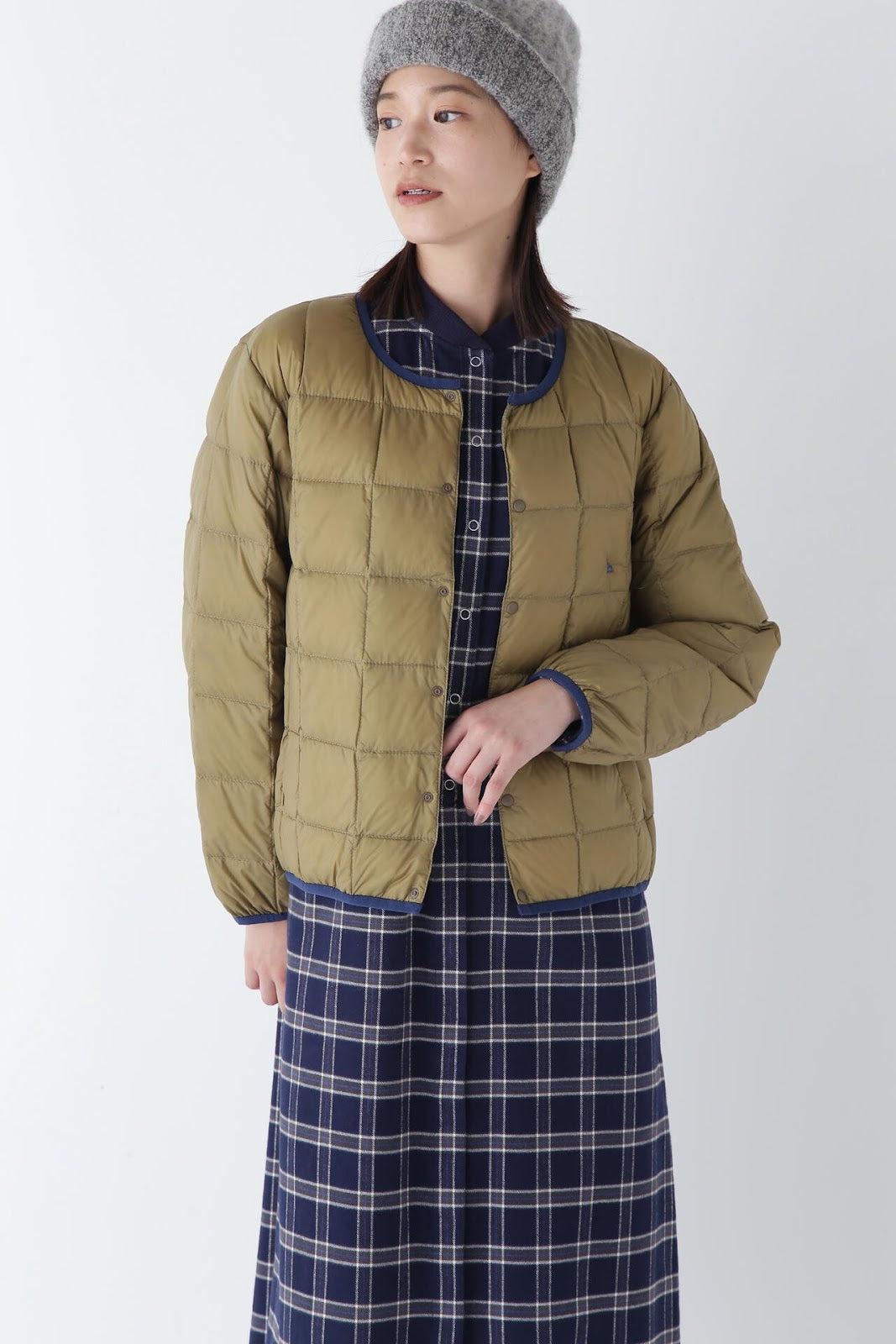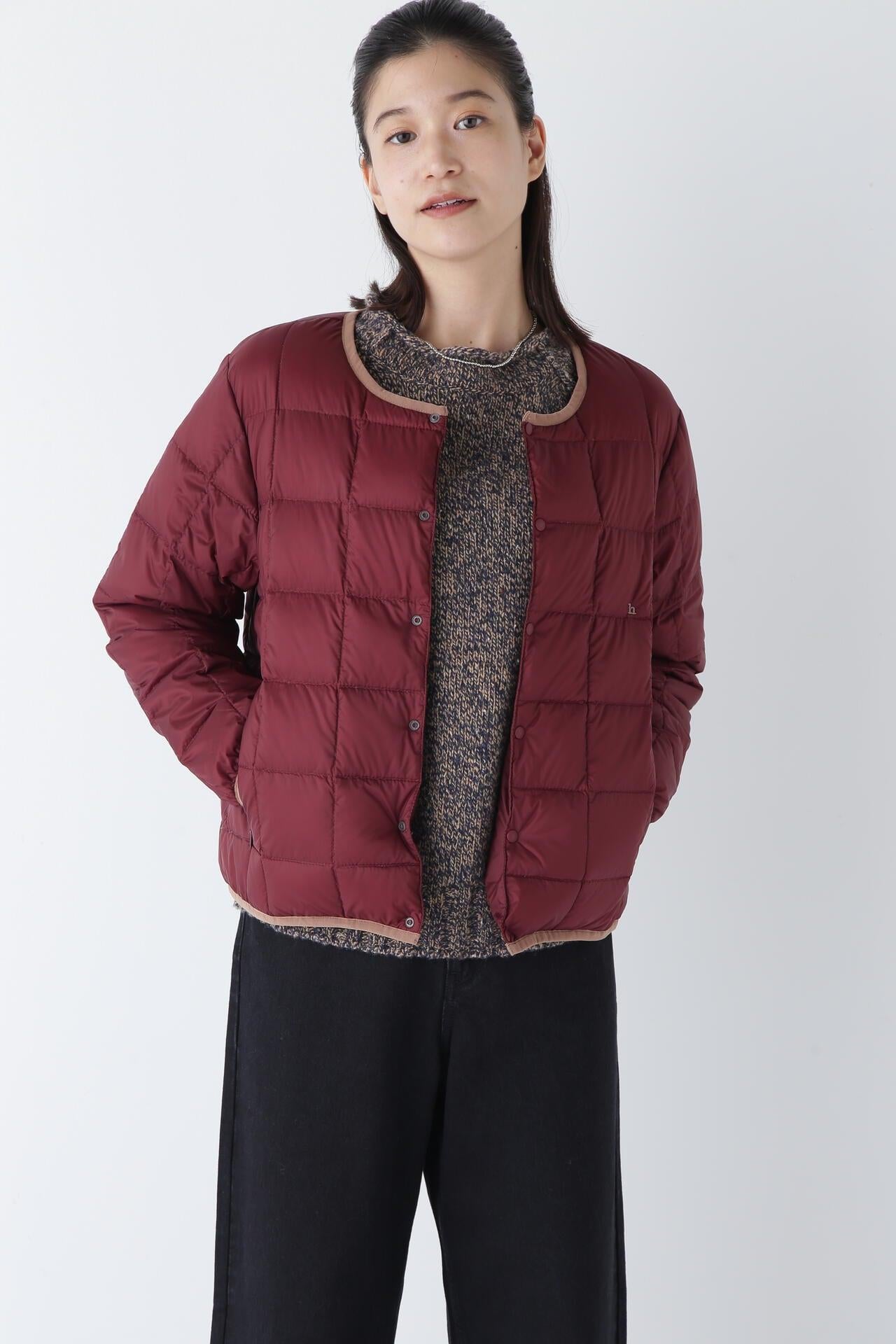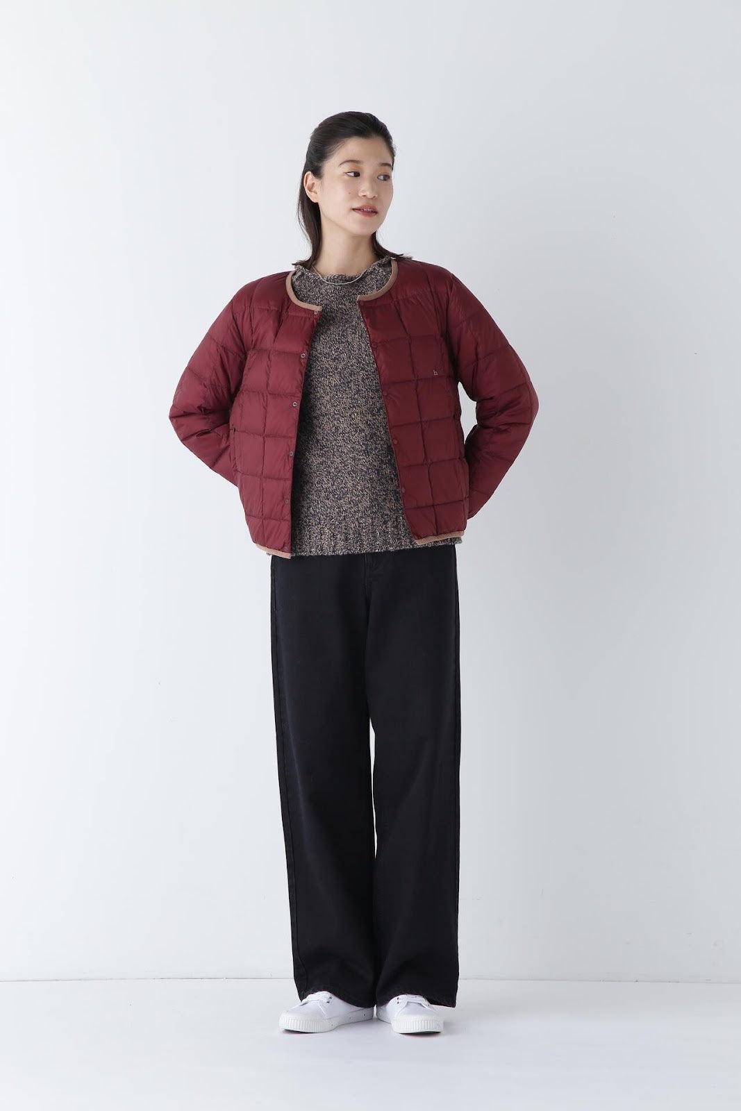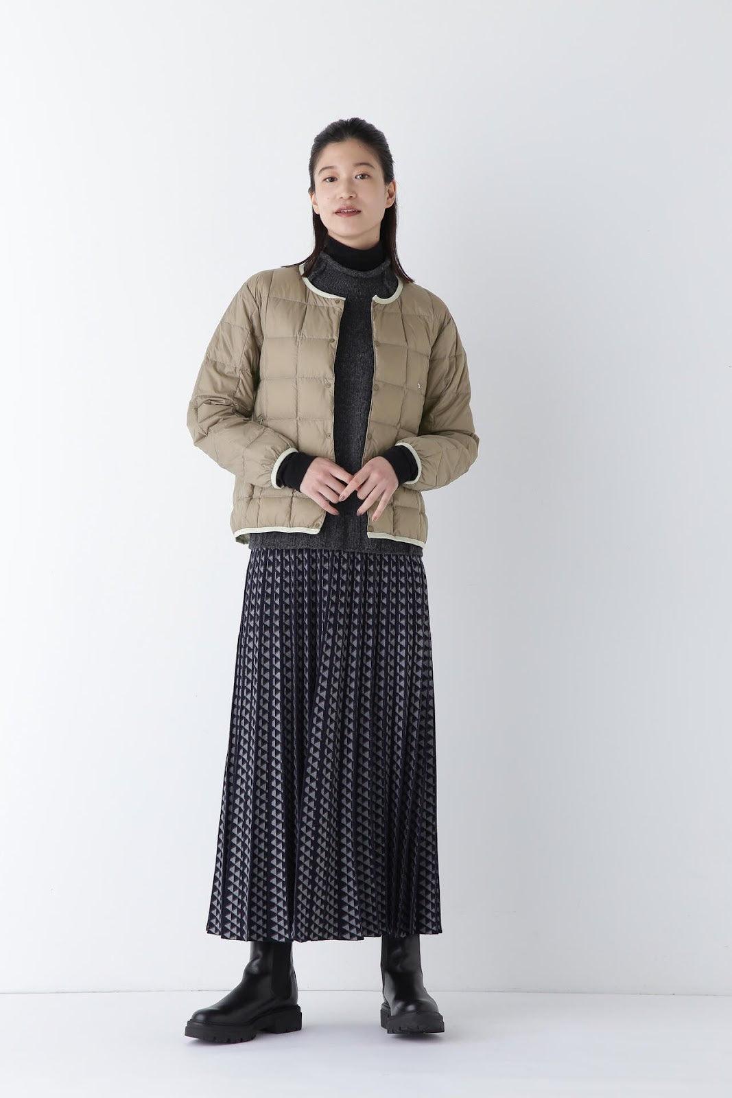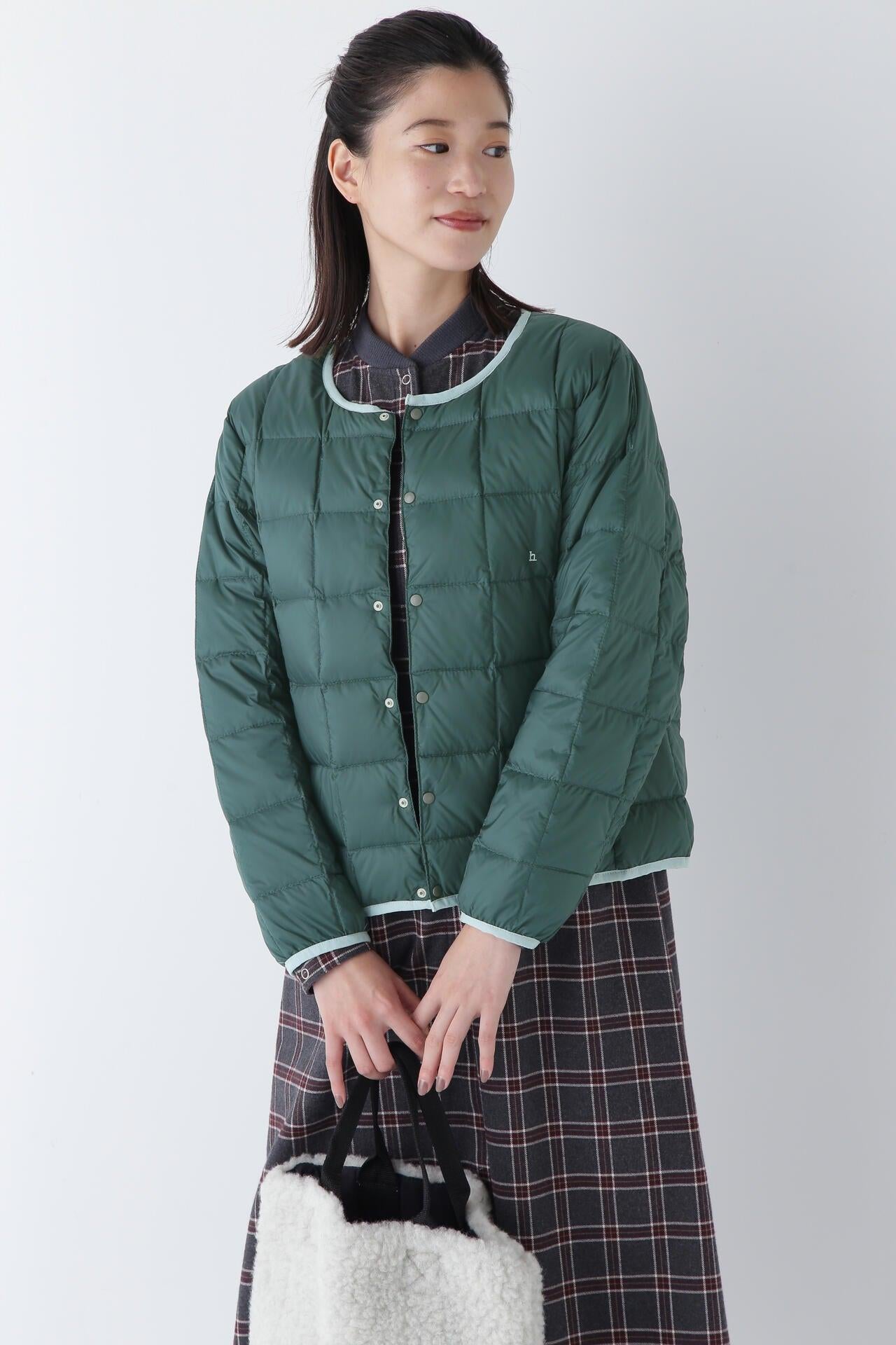 TAION×human woman 合作項目中的紐扣羽絨服 [設計要點] 這款羽絨服被視為 TAION 的標準產品,是按照人類女性的規格特別定製的。為了與人類女性的外衣相匹配,對尺寸進行了修改,並按照滾邊規格製作了衣領。滾邊的顏色也應用到了內襯上,色彩搭配是設計的一個亮點。原來的 "Bonjour "印花也被應用到了可打包的抽繩上,左胸前繡有 "h"。面料要點] TAION 採用了比普通羽絨更蓬鬆的羽絨,因此輕便而保暖。紗線也經過特殊設計,與羽絨和薄面料相匹配。推薦座標] 裁剪縫製和襯衫。