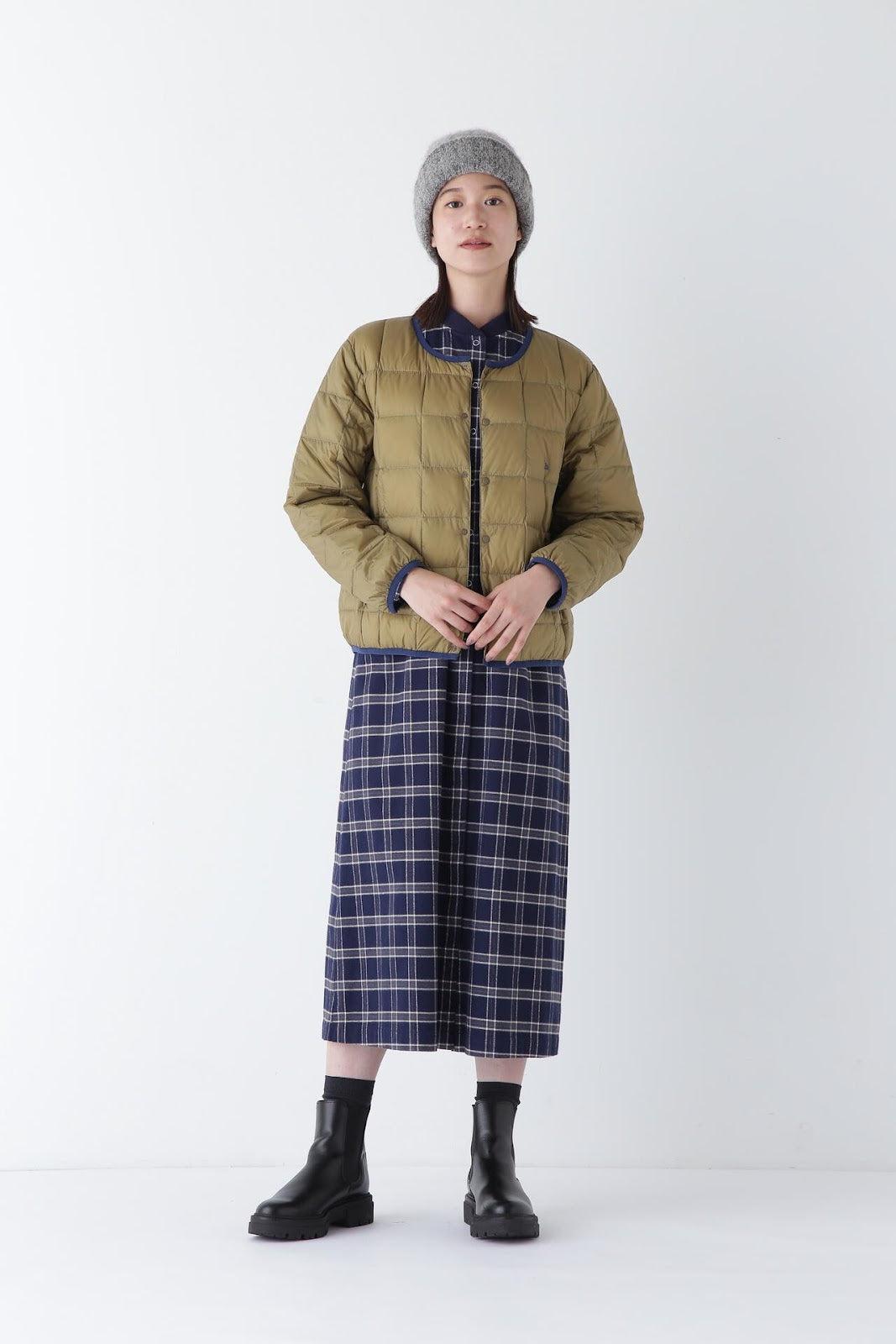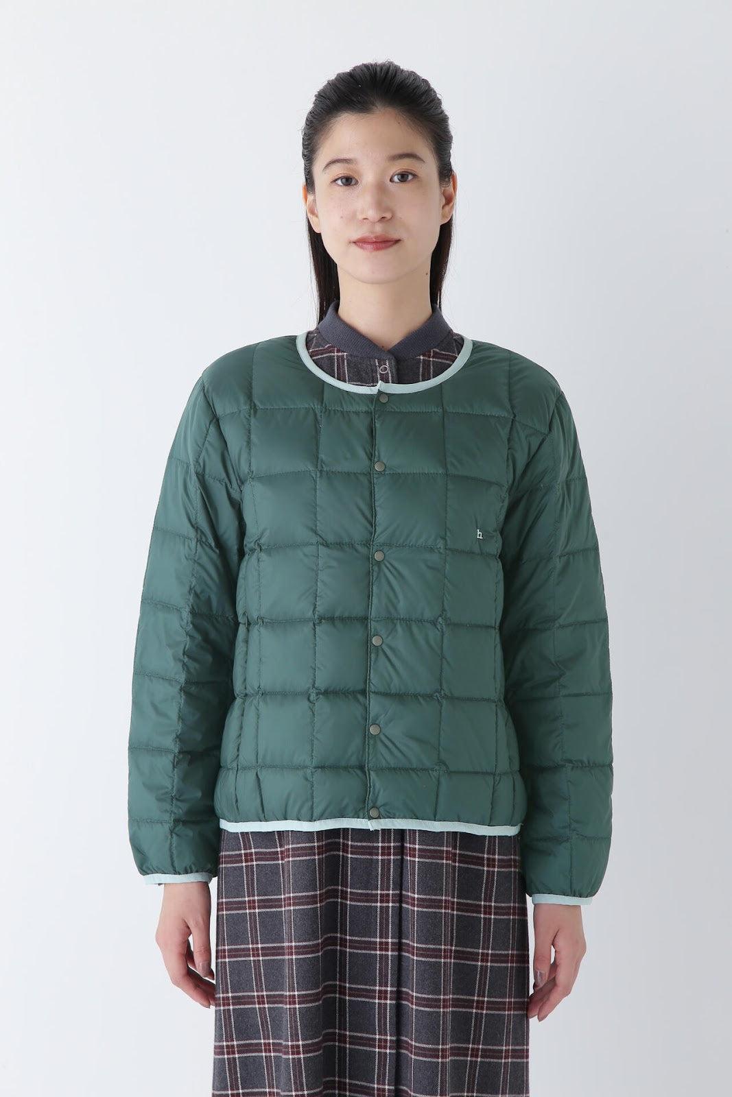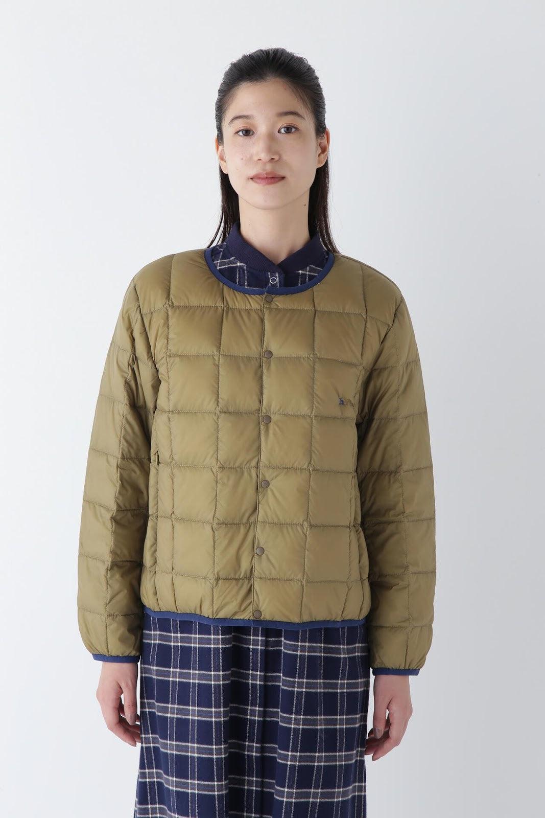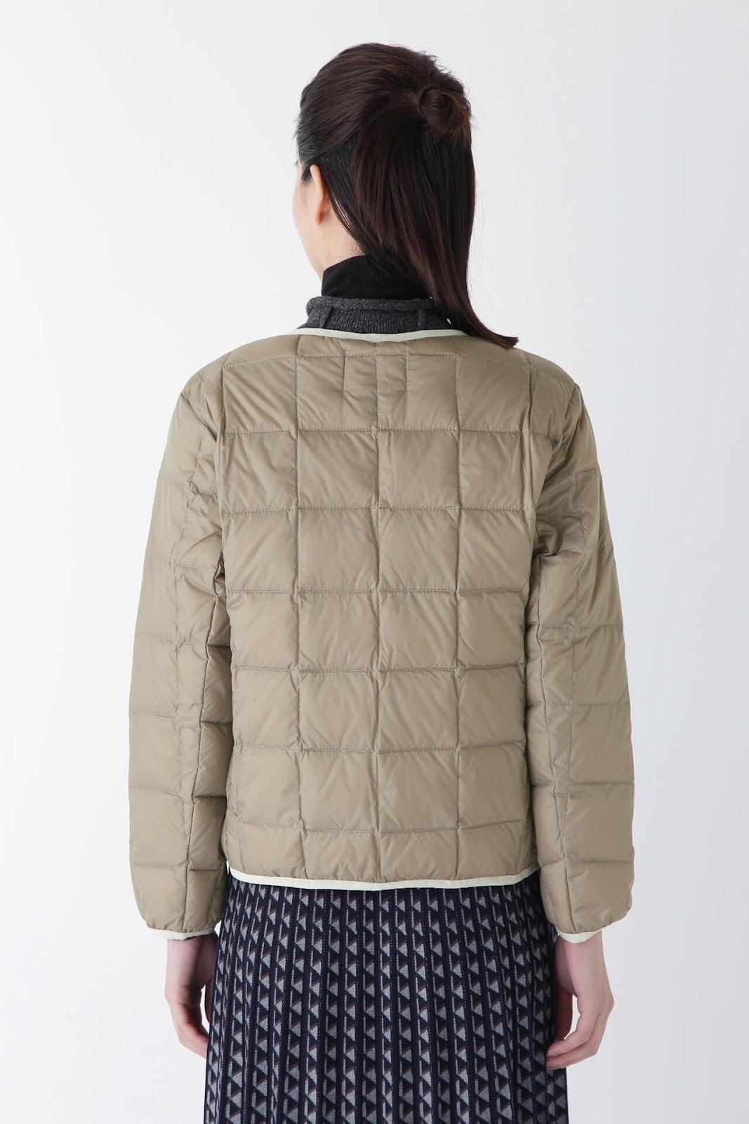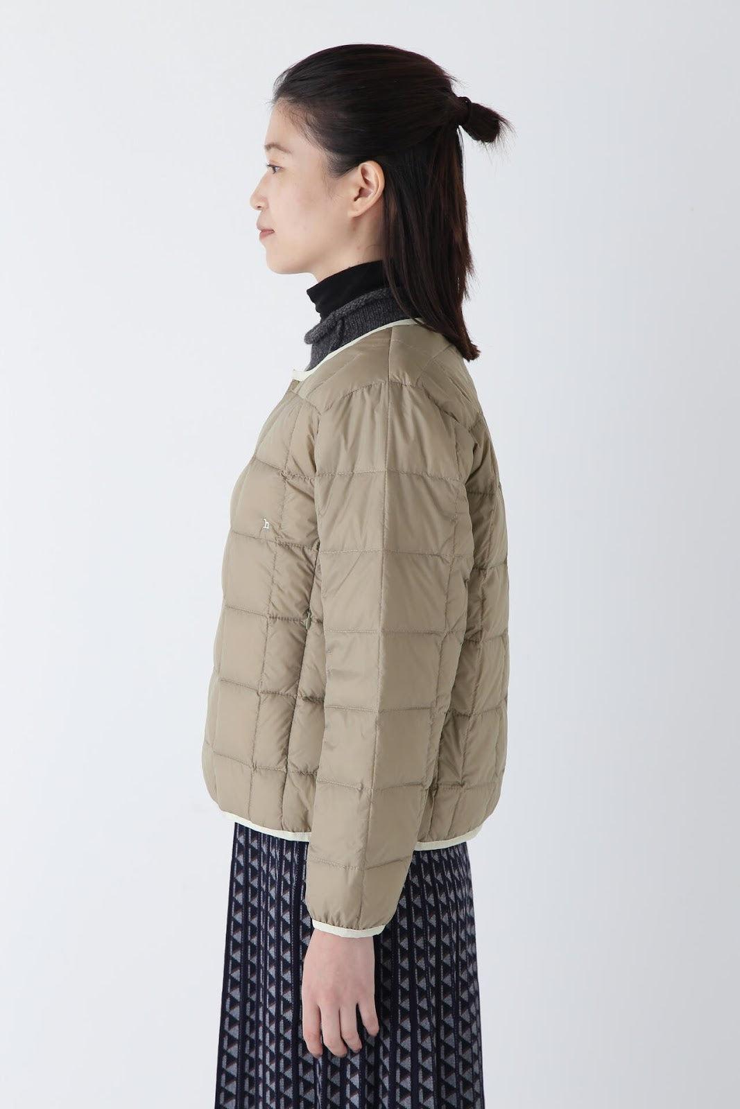 TAION×human woman 合作項目中的紐扣羽絨服 [設計要點] 這款羽絨服被視為 TAION 的標準產品,是按照人類女性的規格特別定製的。為了與人類女性的外衣相匹配,對尺寸進行了修改,並按照滾邊規格製作了衣領。滾邊的顏色也應用到了內襯上,色彩搭配是設計的一個亮點。原來的 "Bonjour "印花也被應用到了可打包的抽繩上,左胸前繡有 "h"。面料要點] TAION 採用了比普通羽絨更蓬鬆的羽絨,因此輕便而保暖。紗線也經過特殊設計,與羽絨和薄面料相匹配。推薦座標] 裁剪縫製和襯衫。