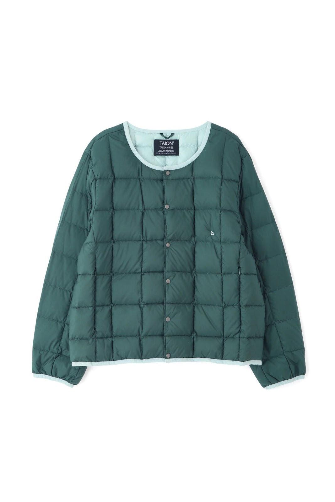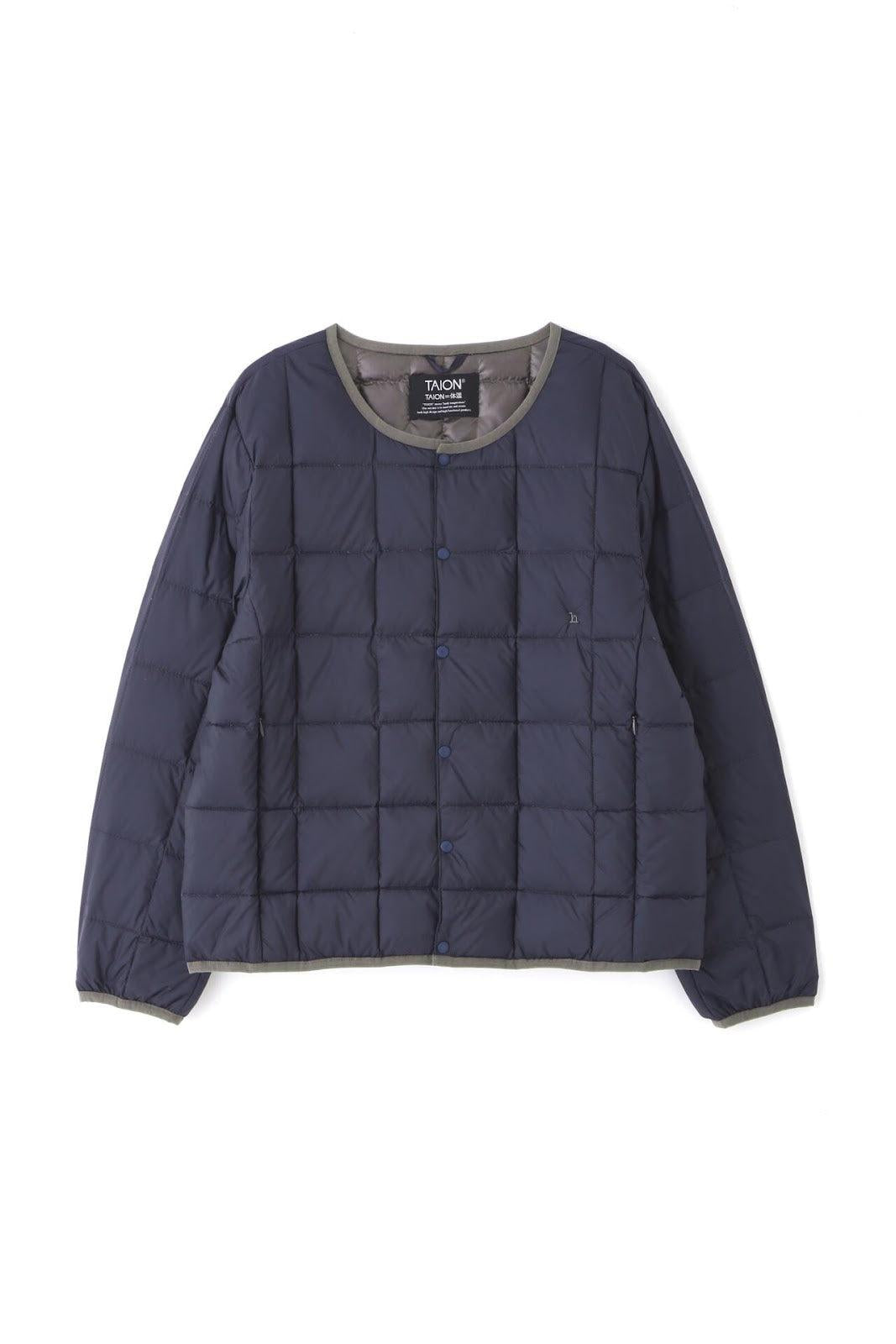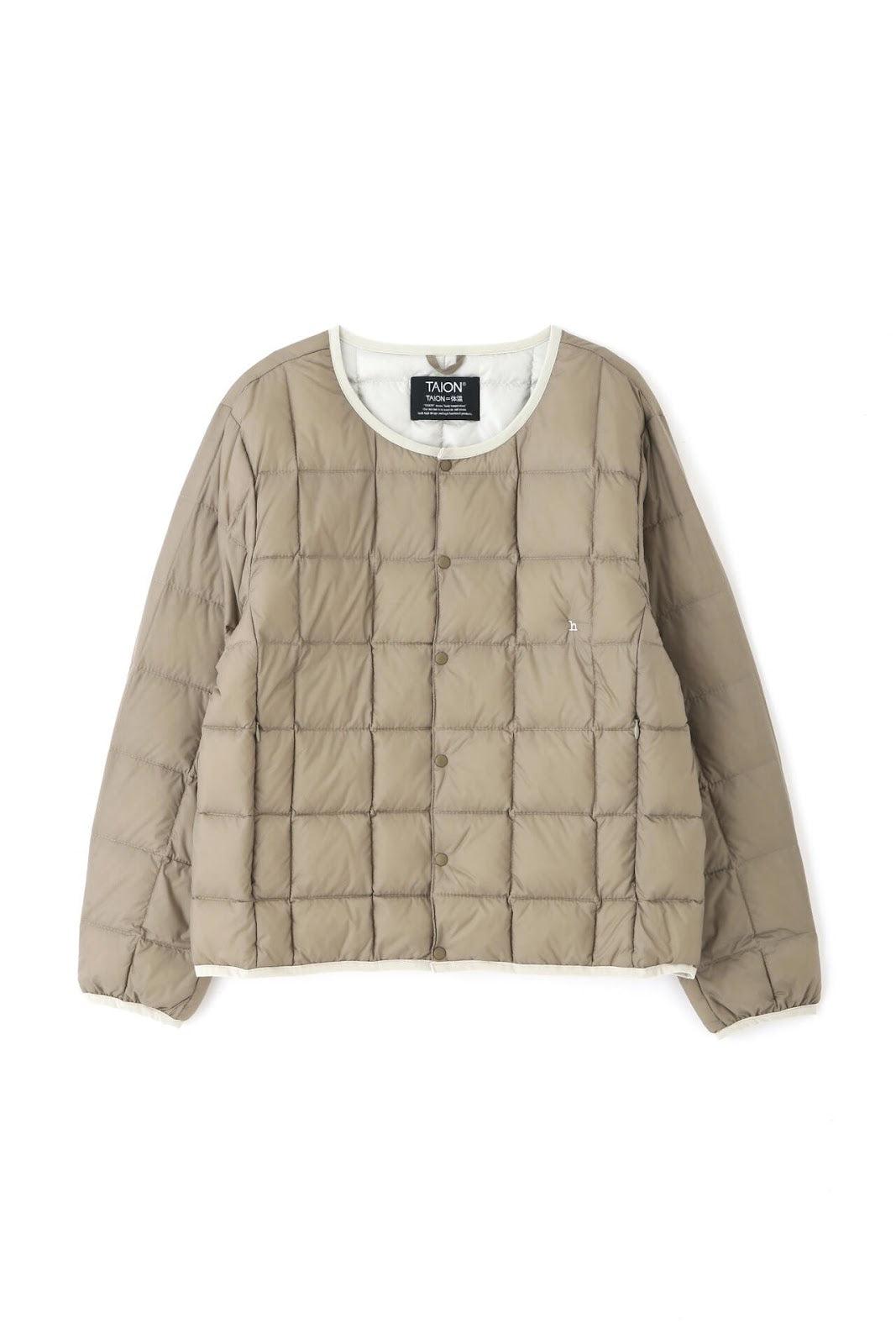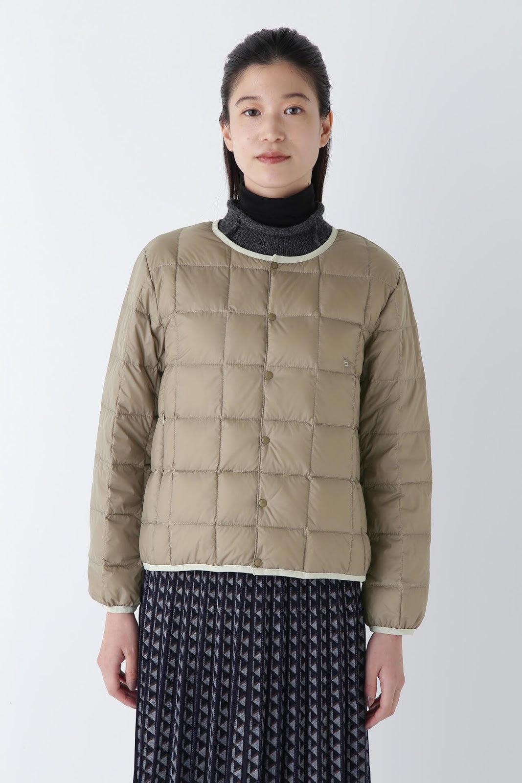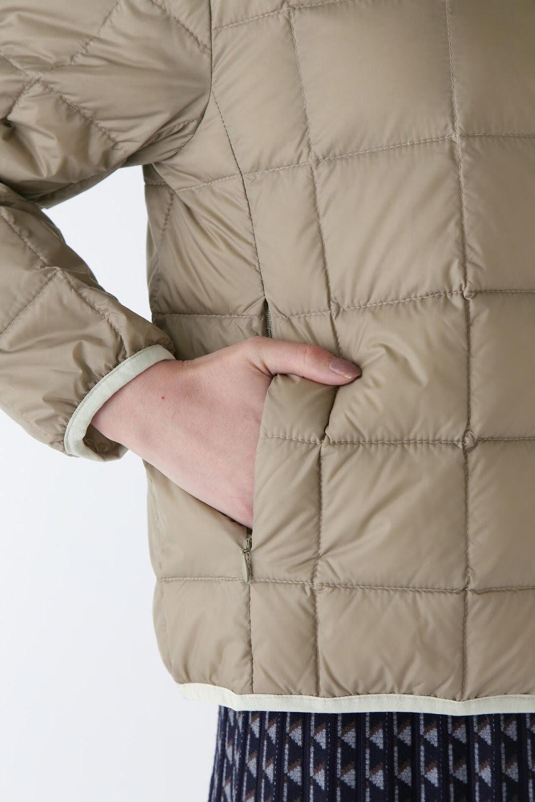 TAION×human woman 合作項目中的紐扣羽絨服 [設計要點] 這款羽絨服被視為 TAION 的標準產品,是按照人類女性的規格特別定製的。為了與人類女性的外衣相匹配,對尺寸進行了修改,並按照滾邊規格製作了衣領。滾邊的顏色也應用到了內襯上,色彩搭配是設計的一個亮點。原來的 "Bonjour "印花也被應用到了可打包的抽繩上,左胸前繡有 "h"。面料要點] TAION 採用了比普通羽絨更蓬鬆的羽絨,因此輕便而保暖。紗線也經過特殊設計,與羽絨和薄面料相匹配。推薦座標] 裁剪縫製和襯衫。