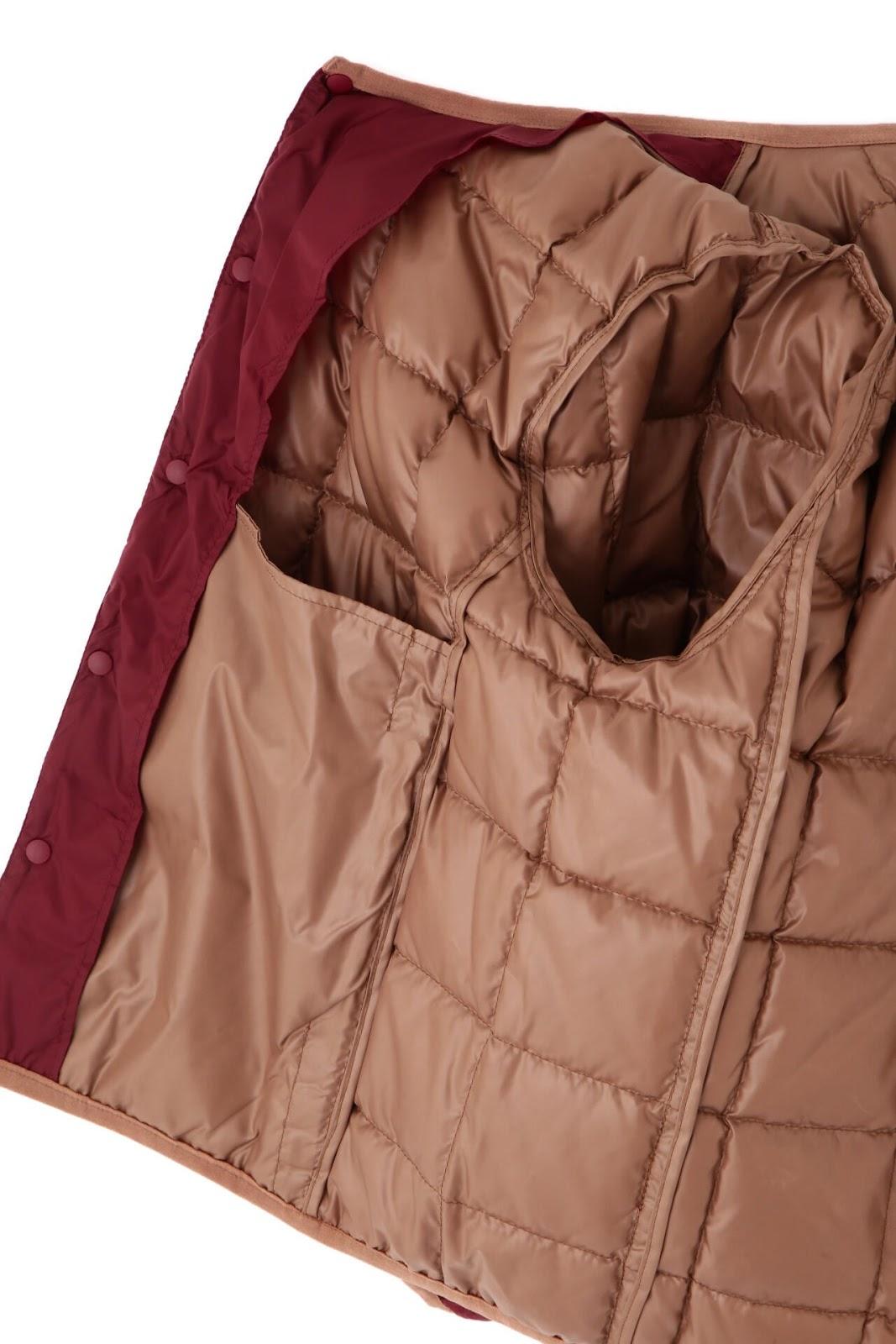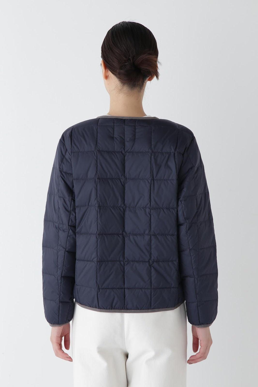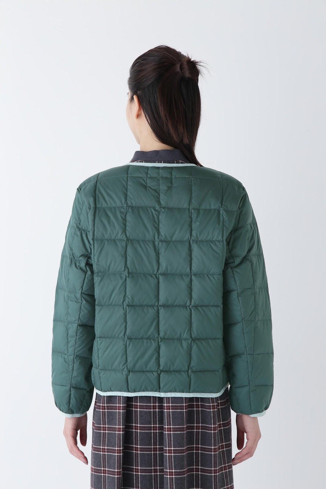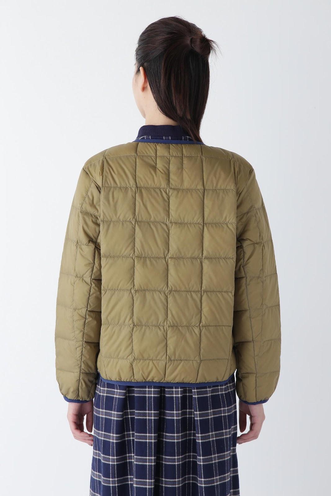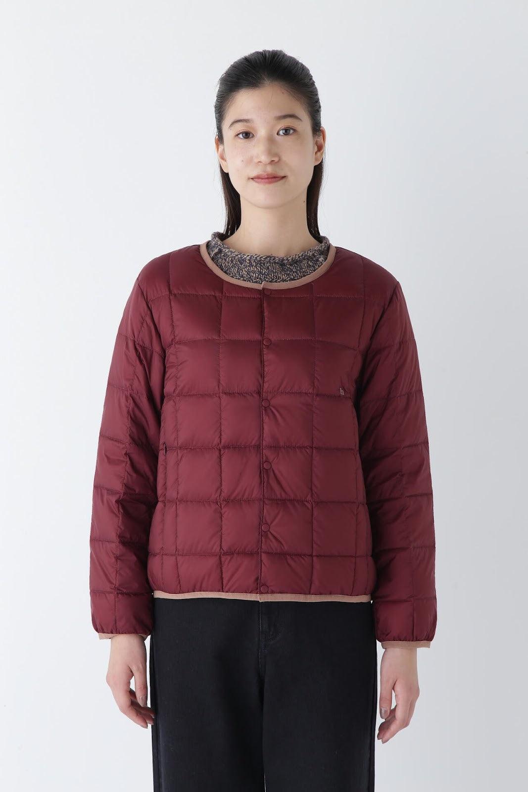 TAION×human woman 合作項目中的紐扣羽絨服 [設計要點] 這款羽絨服被視為 TAION 的標準產品,是按照人類女性的規格特別定製的。為了與人類女性的外衣相匹配,對尺寸進行了修改,並按照滾邊規格製作了衣領。滾邊的顏色也應用到了內襯上,色彩搭配是設計的一個亮點。原來的 "Bonjour "印花也被應用到了可打包的抽繩上,左胸前繡有 "h"。面料要點] TAION 採用了比普通羽絨更蓬鬆的羽絨,因此輕便而保暖。紗線也經過特殊設計,與羽絨和薄面料相匹配。推薦座標] 裁剪縫製和襯衫。