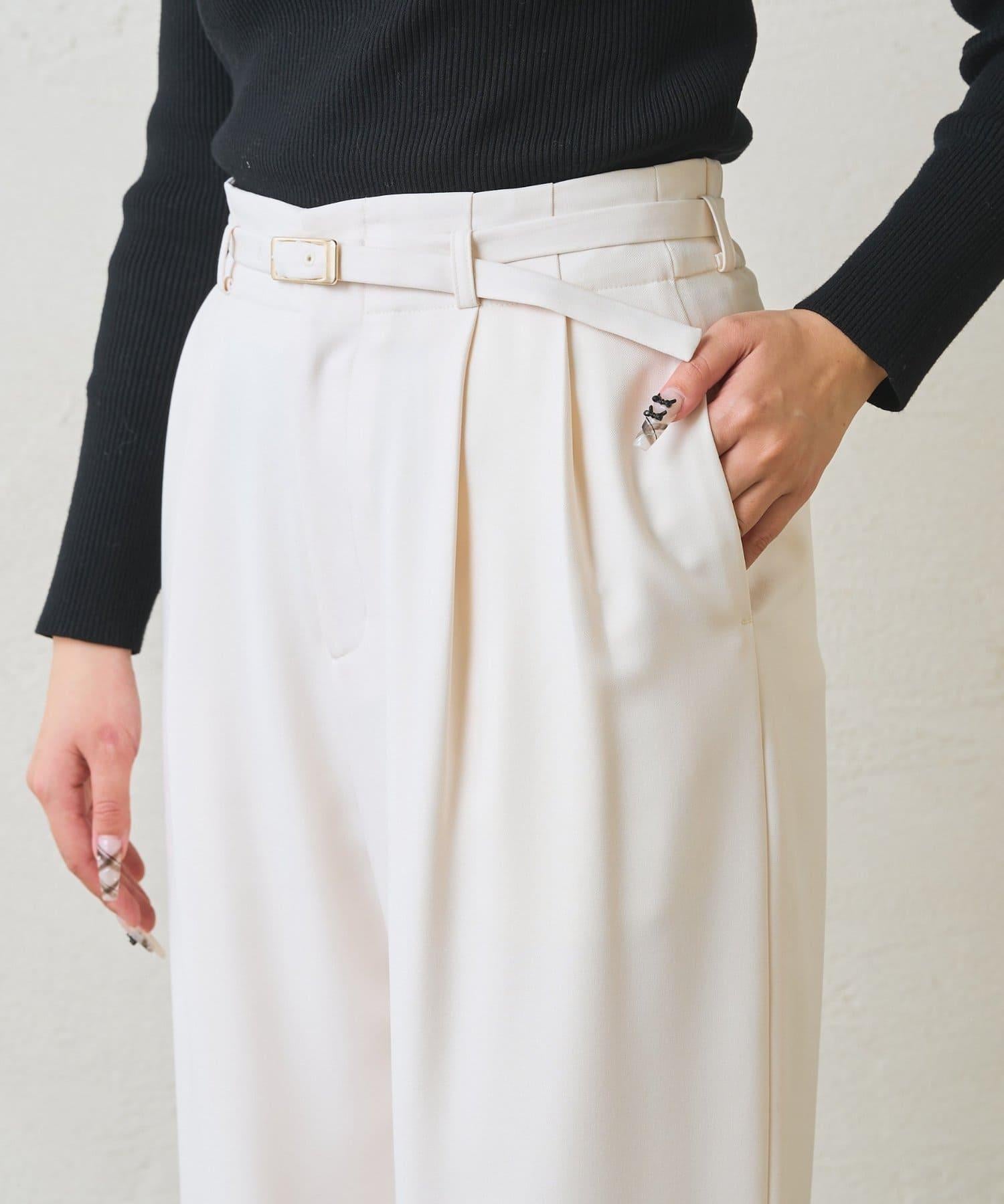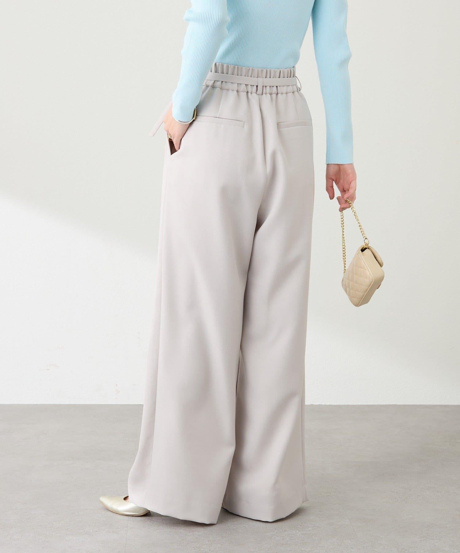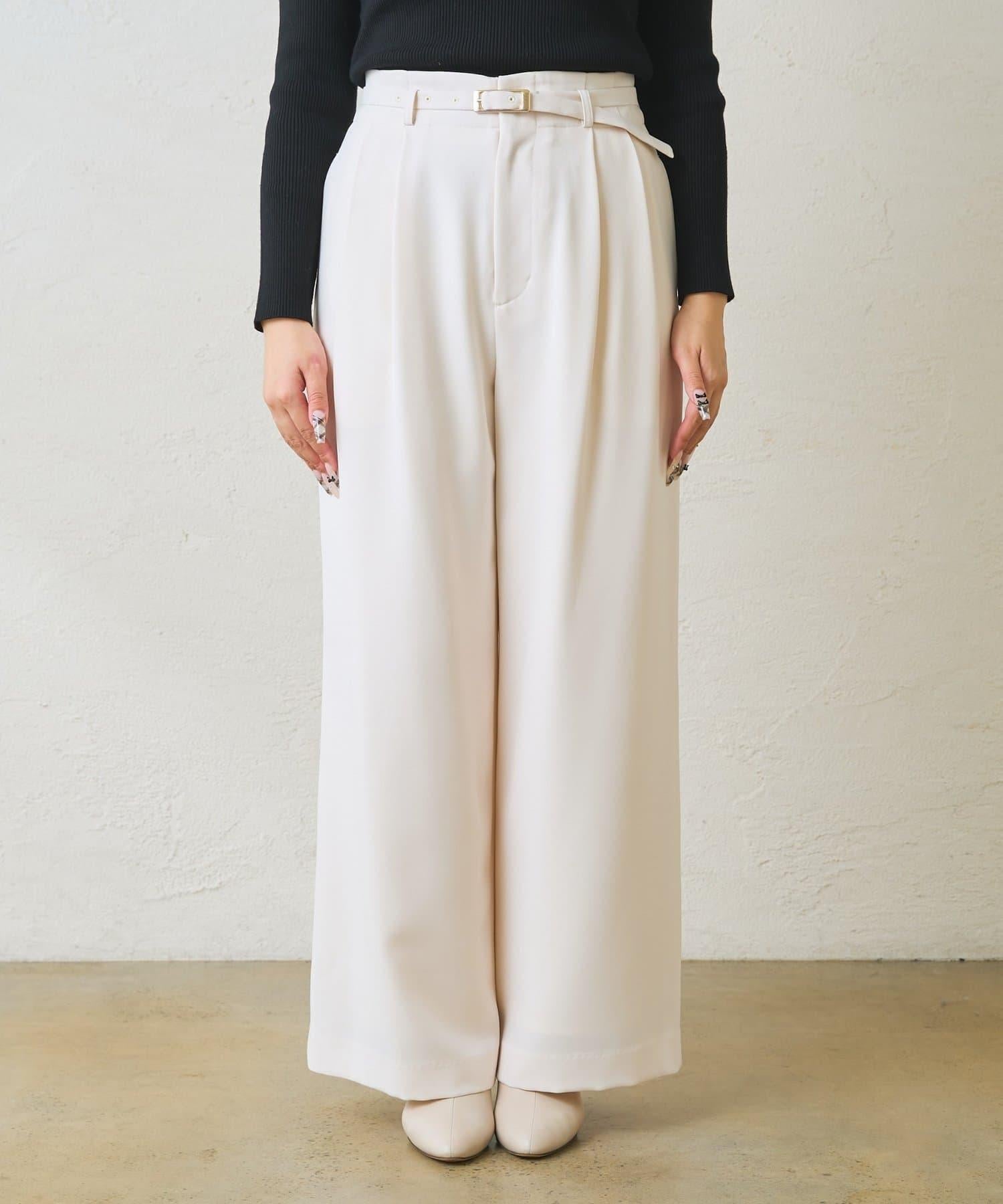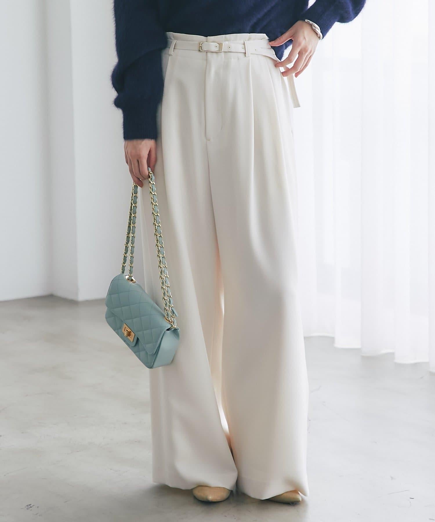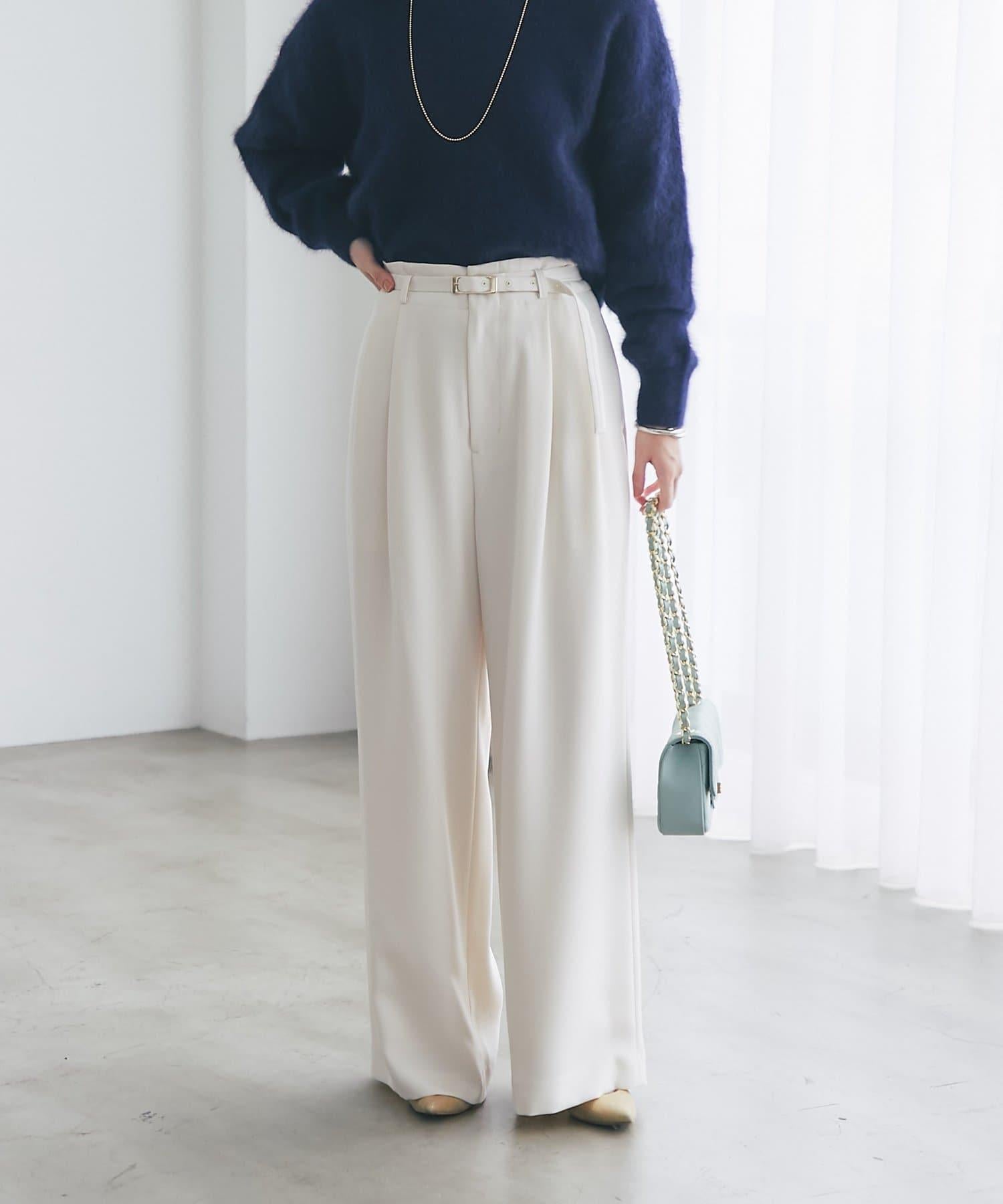 寬鬆長褲配以優雅的腰帶,金色搭扣引人注目。