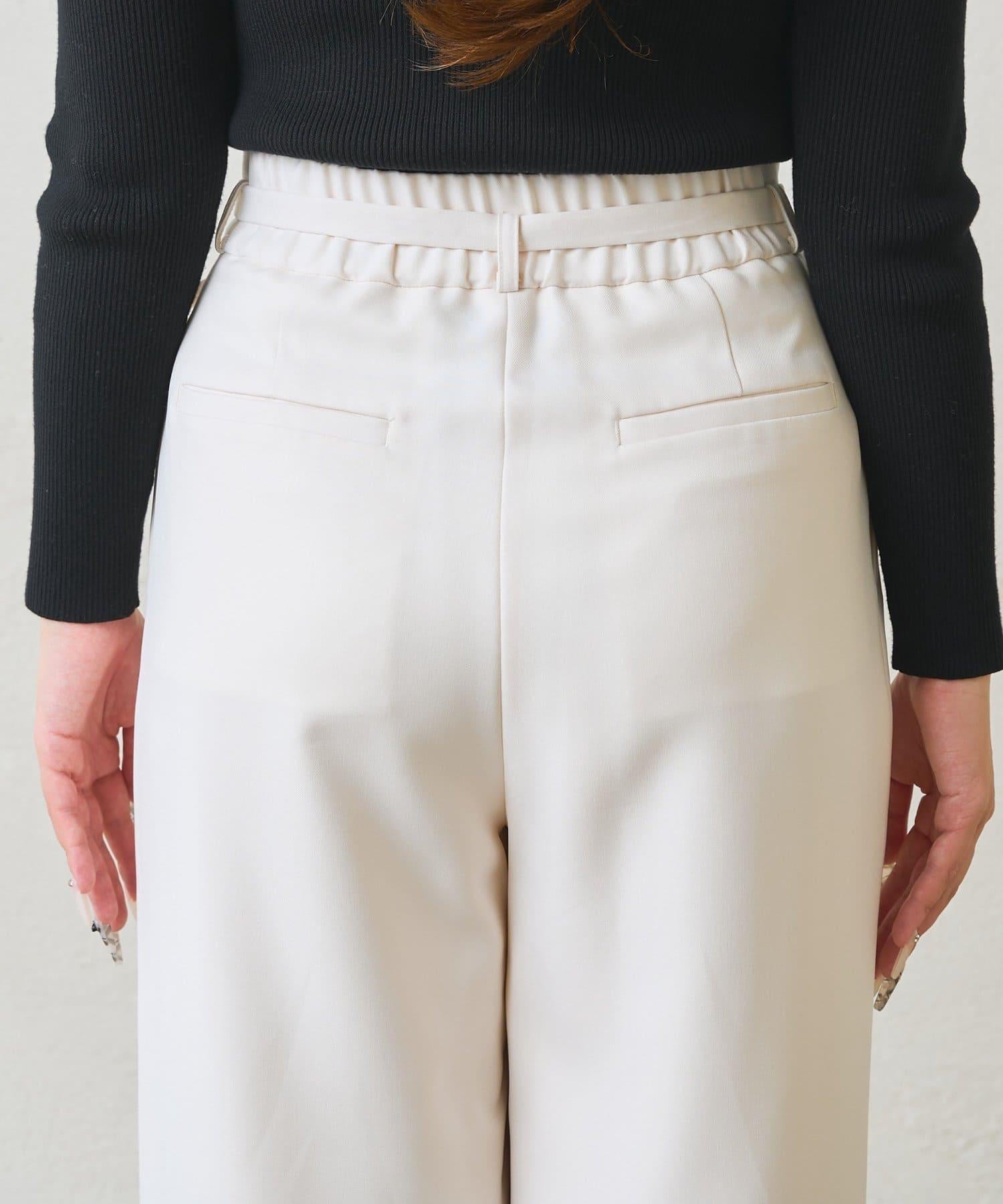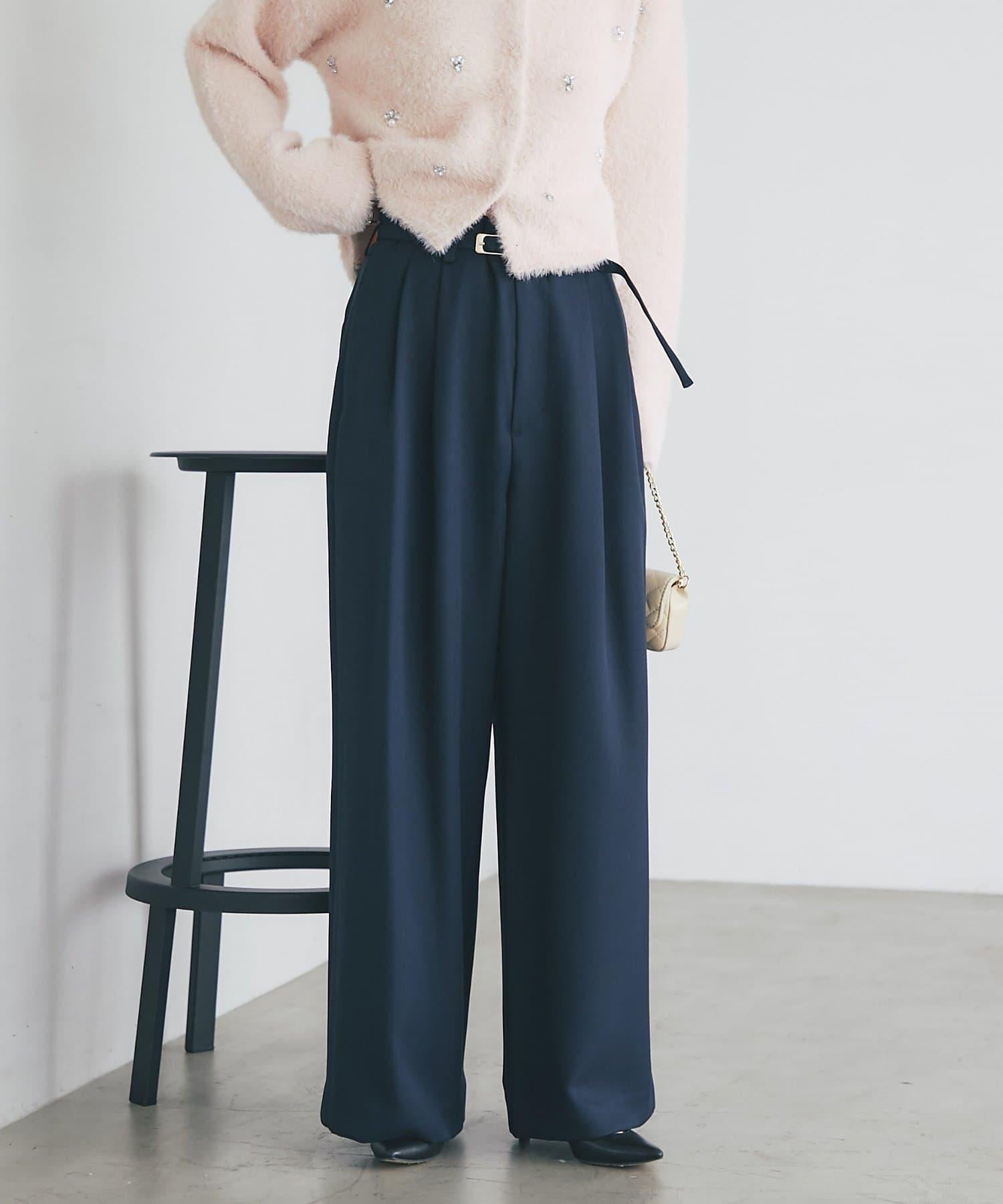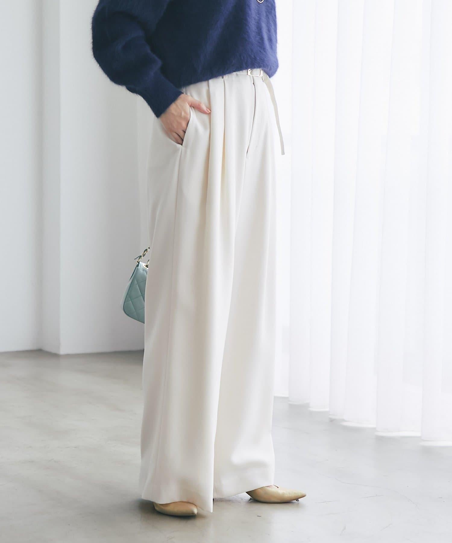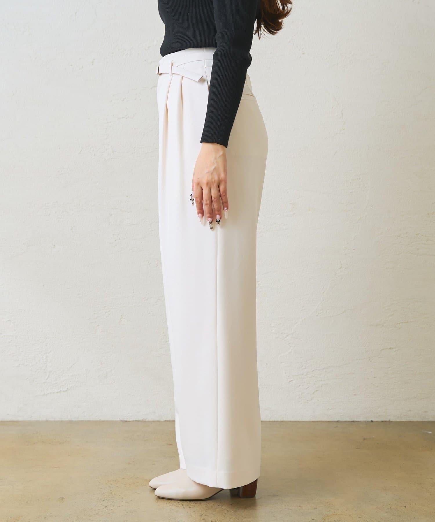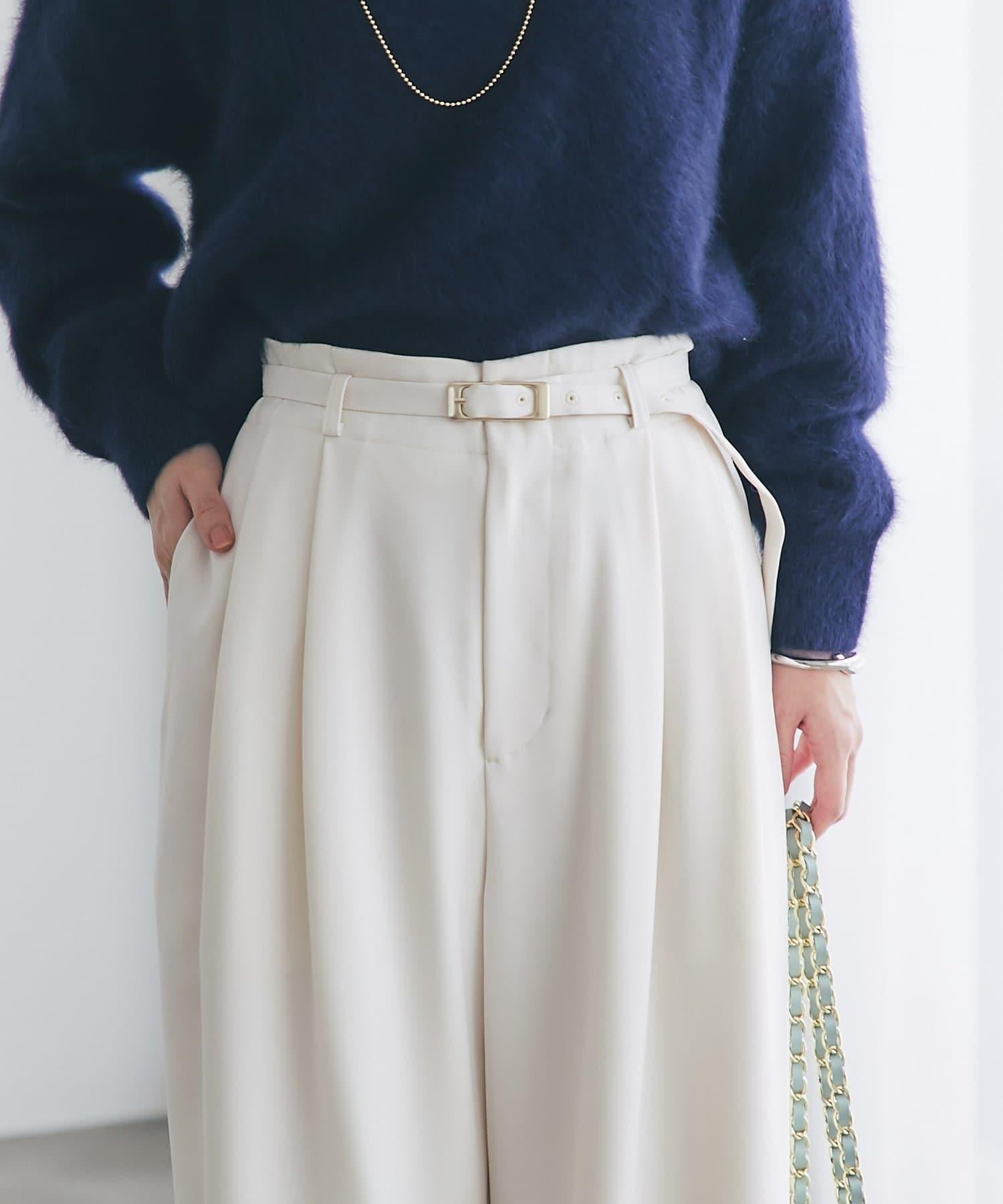 寬鬆長褲配以優雅的腰帶,金色搭扣引人注目。