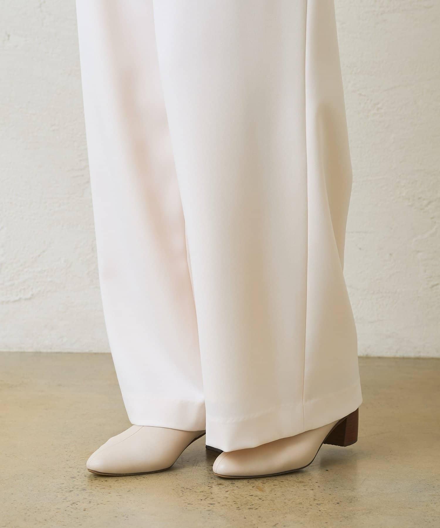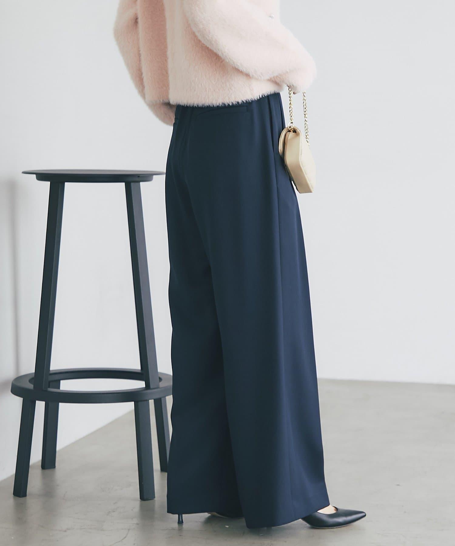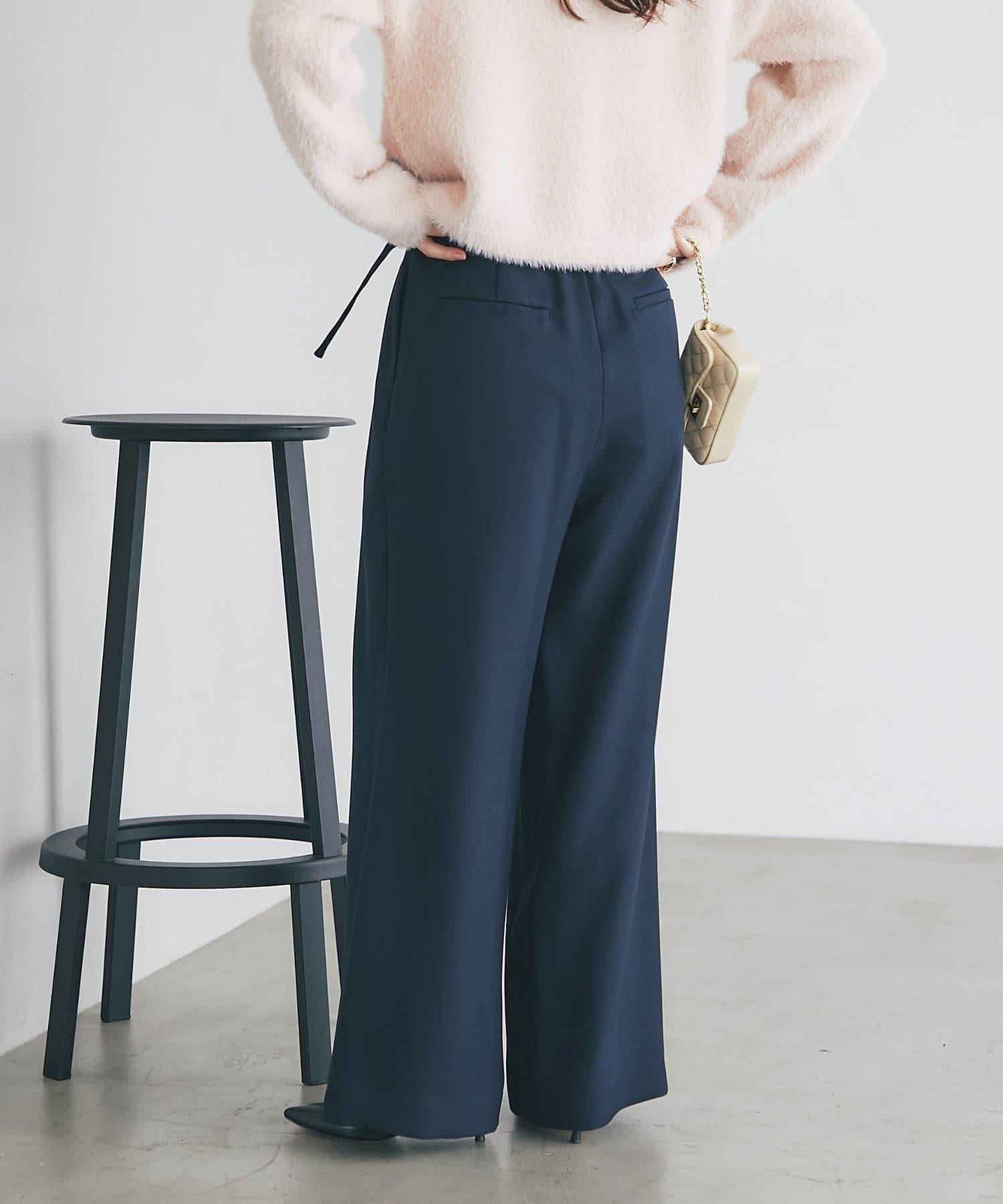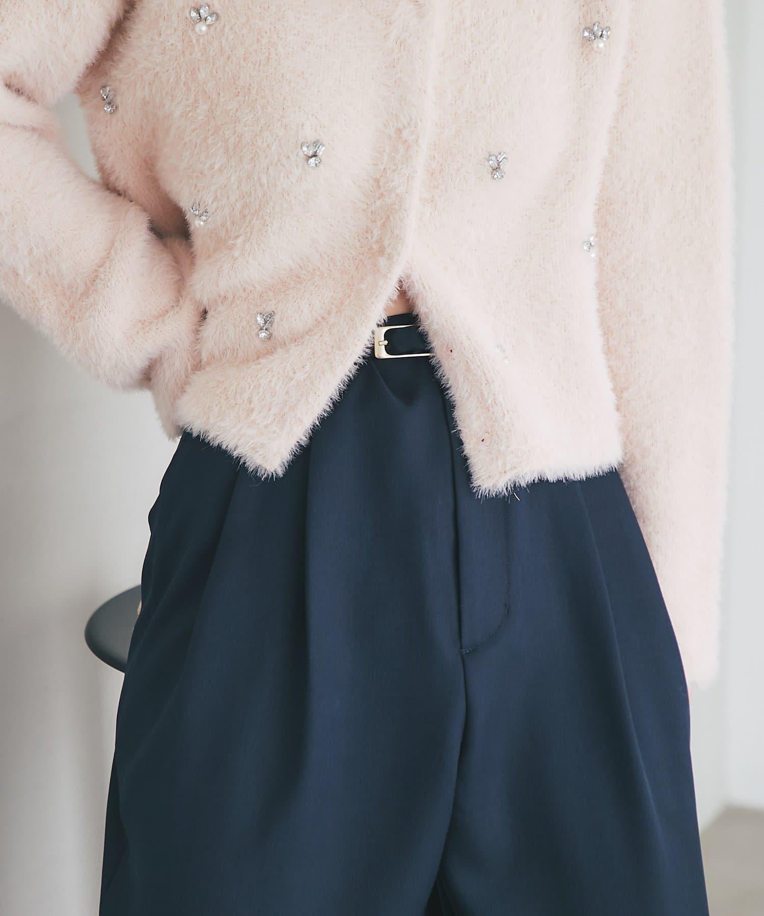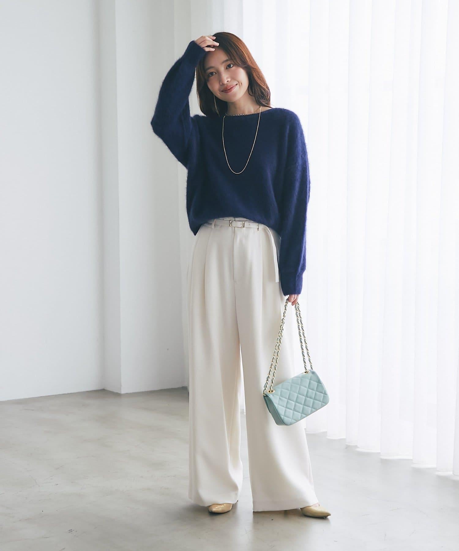 寬鬆長褲配以優雅的腰帶,金色搭扣引人注目。