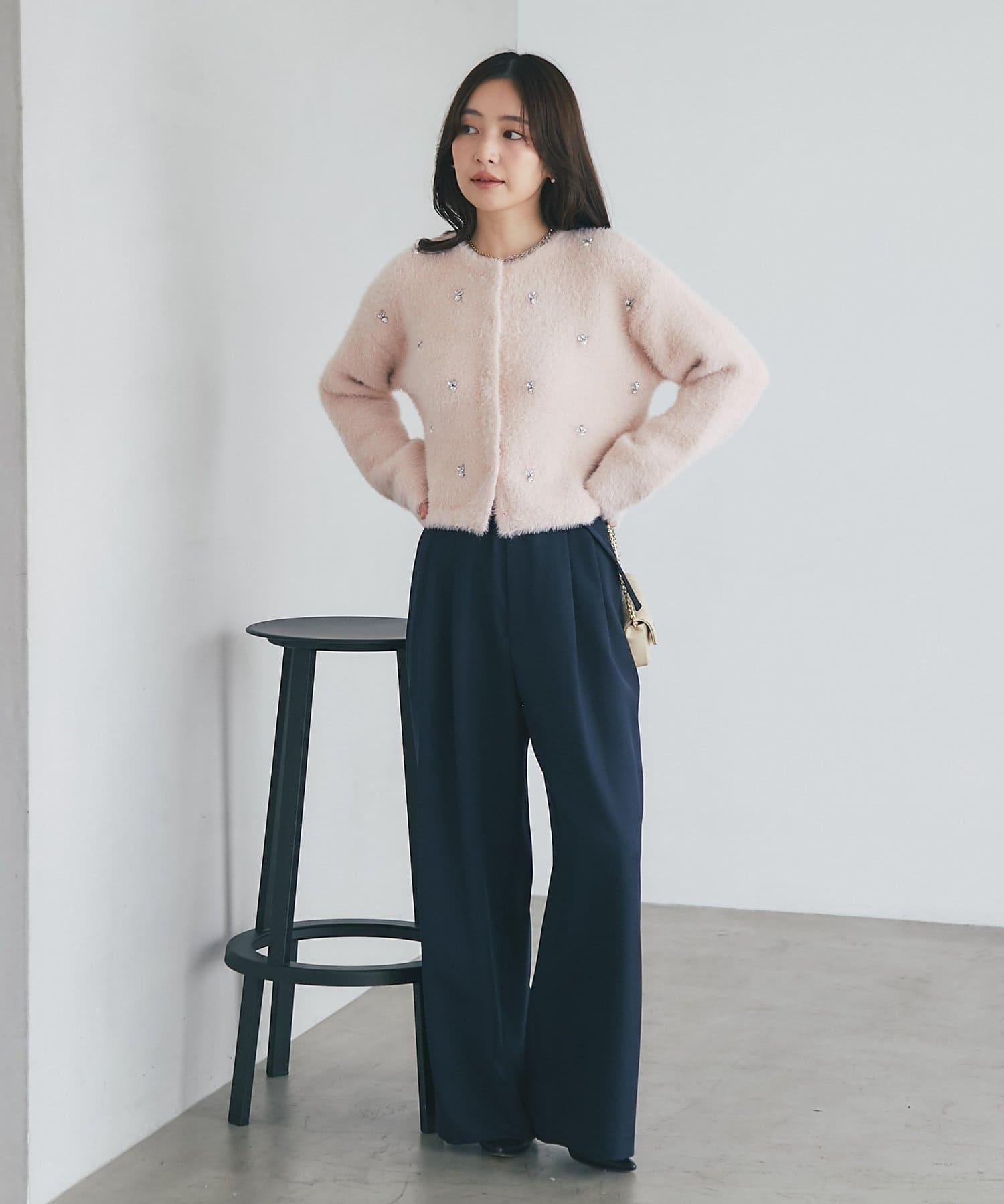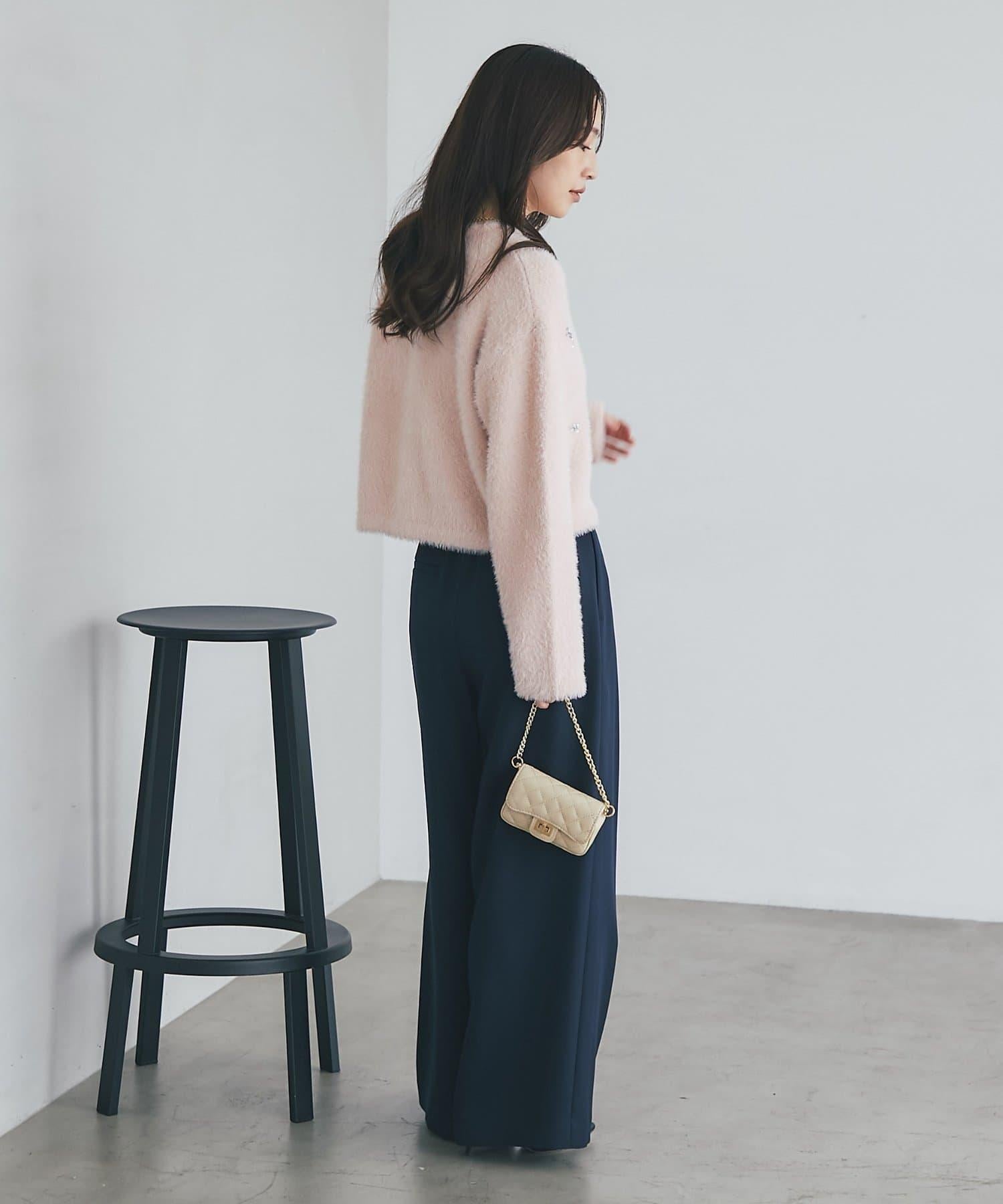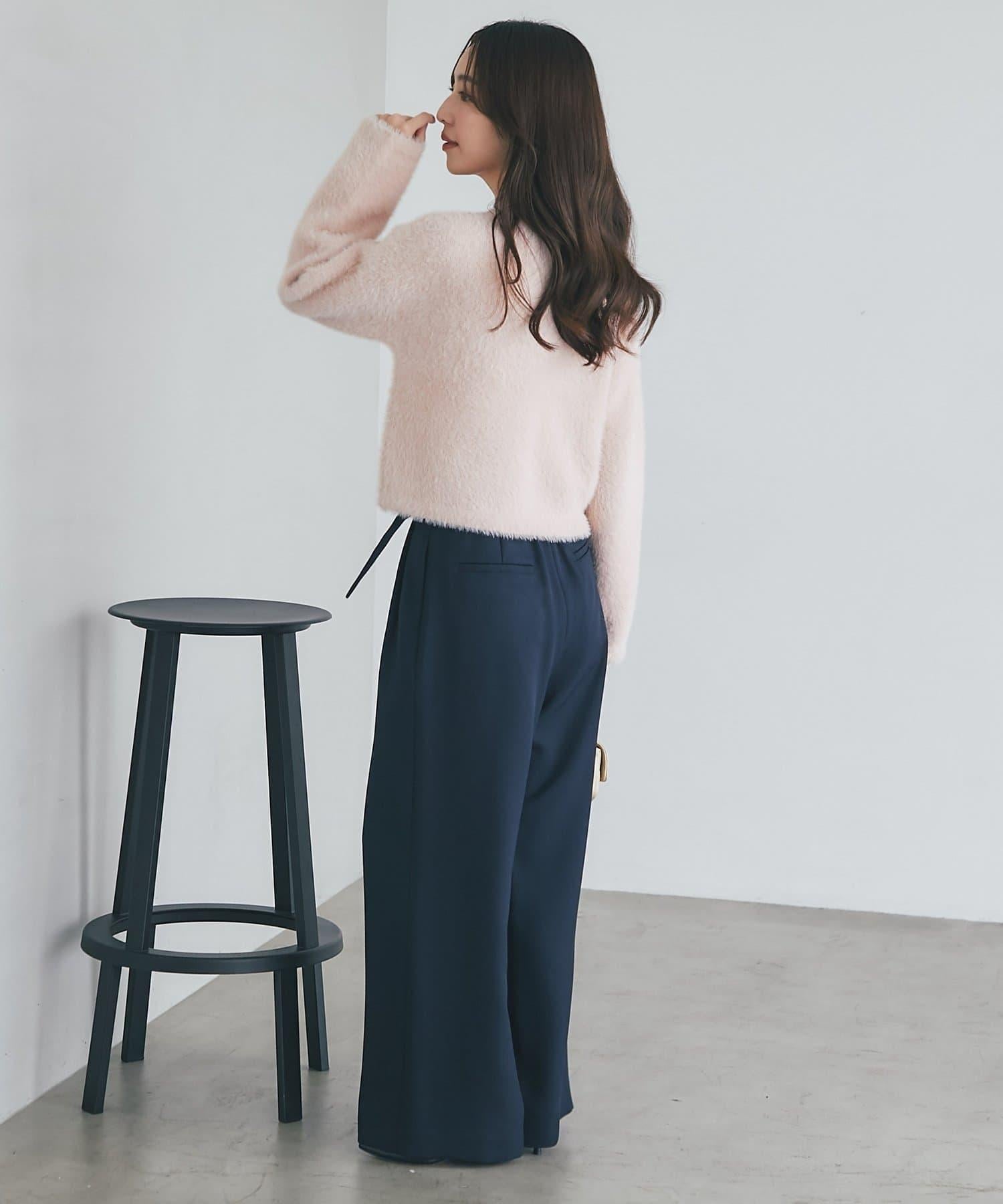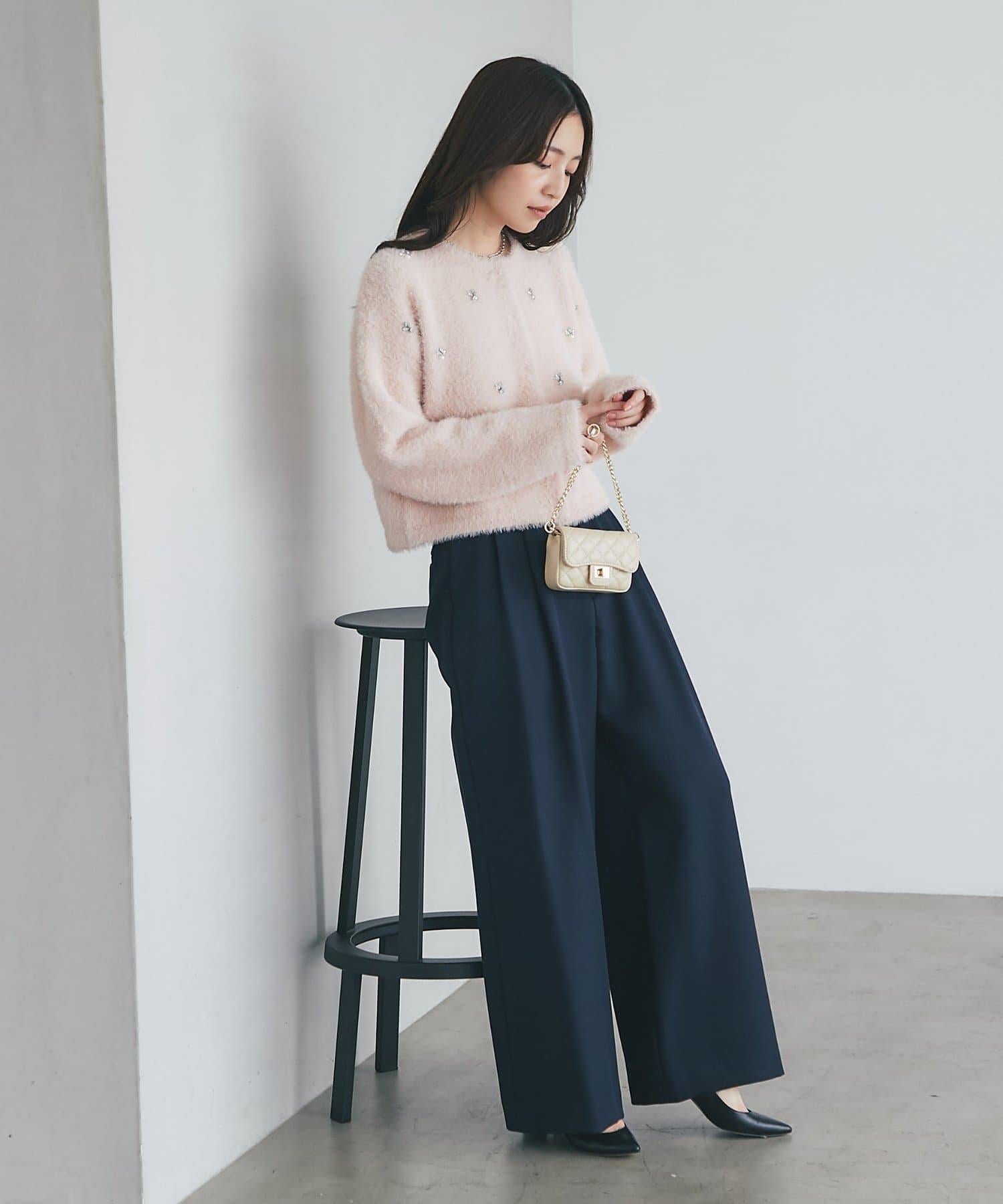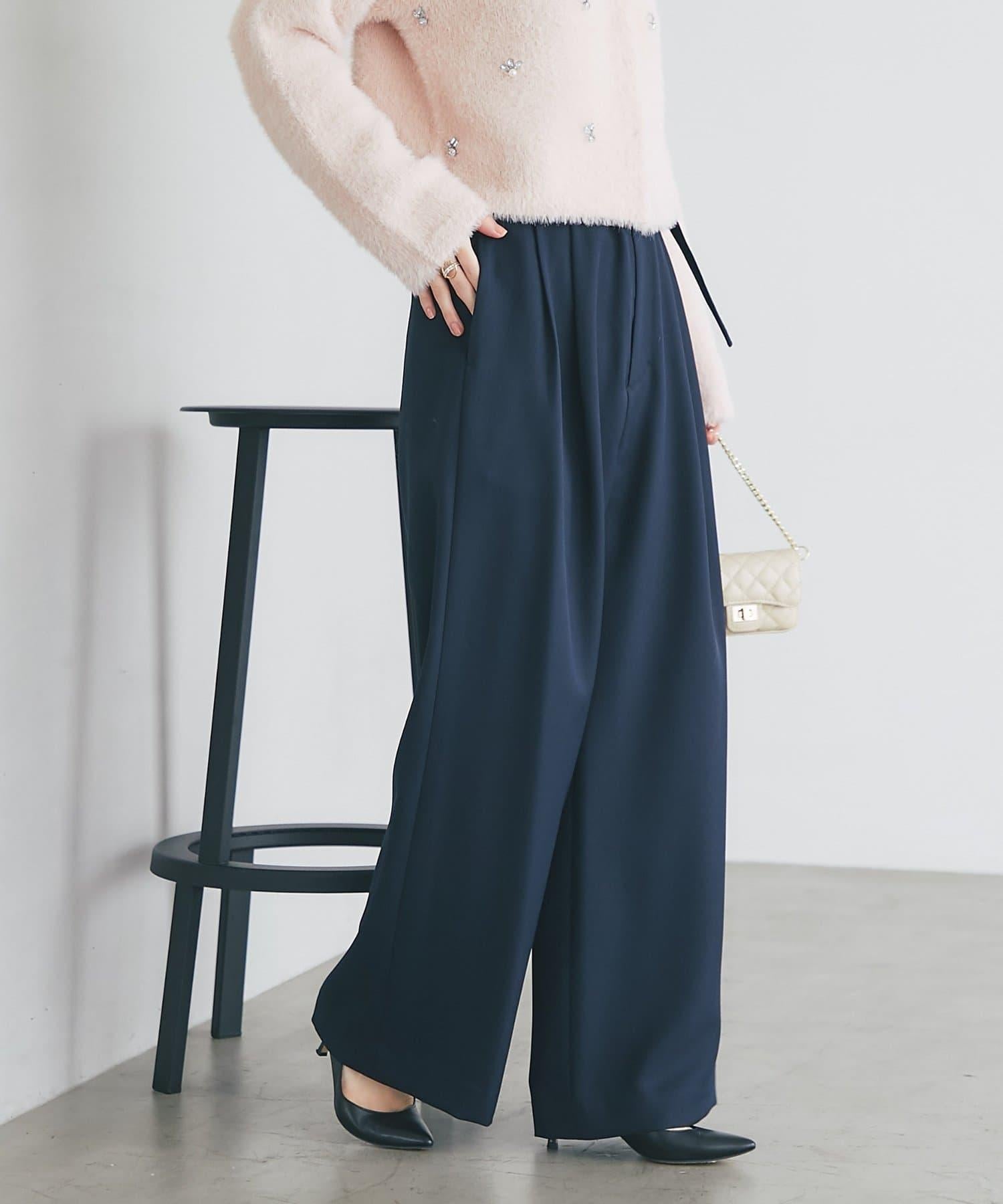寬鬆長褲配以優雅的腰帶,金色搭扣引人注目。