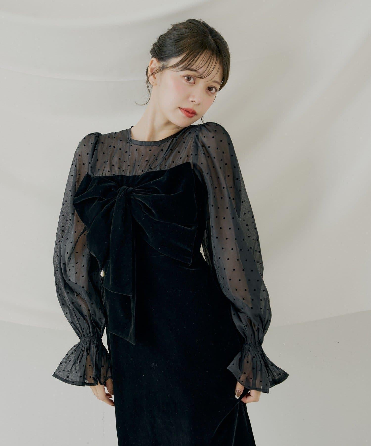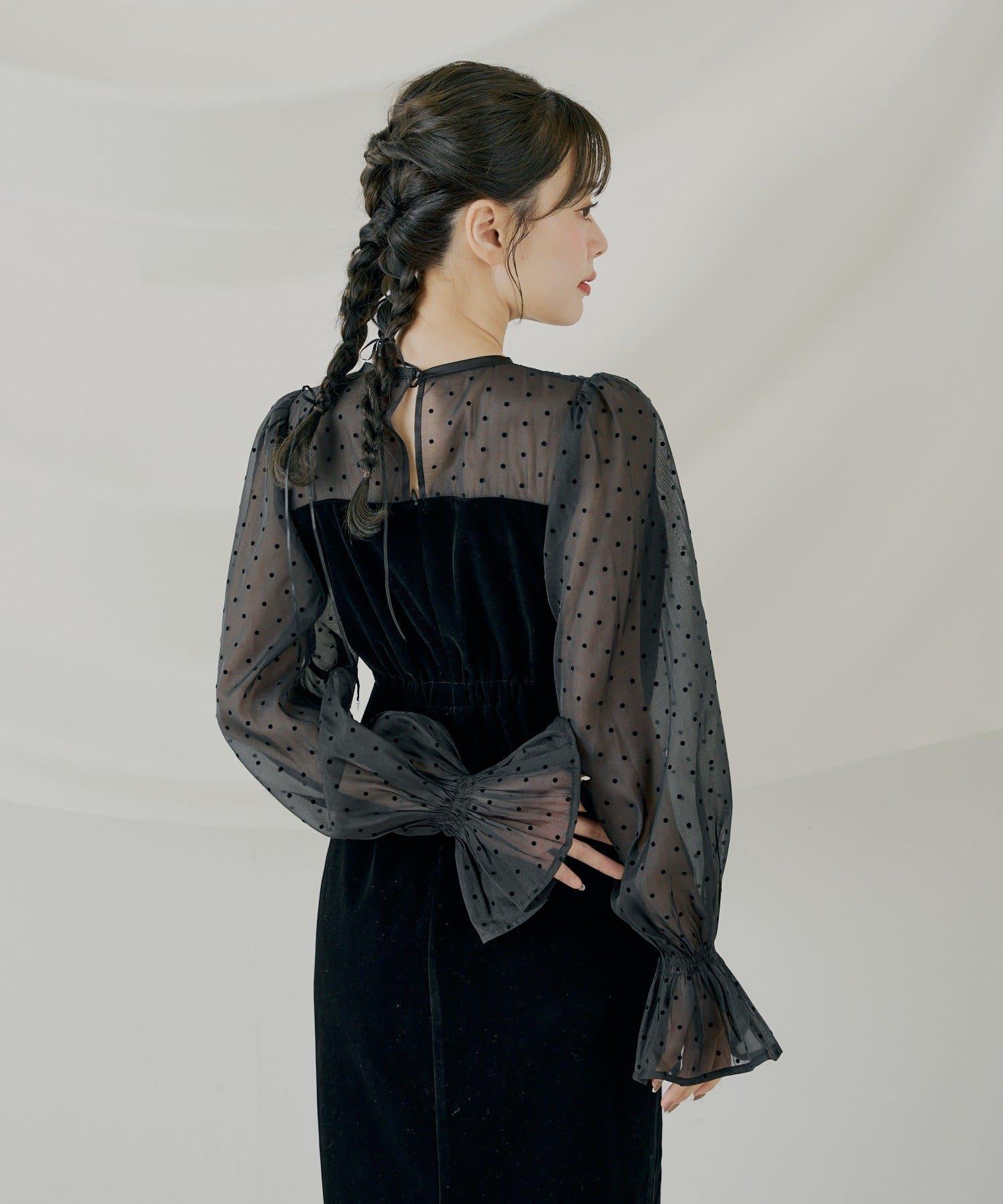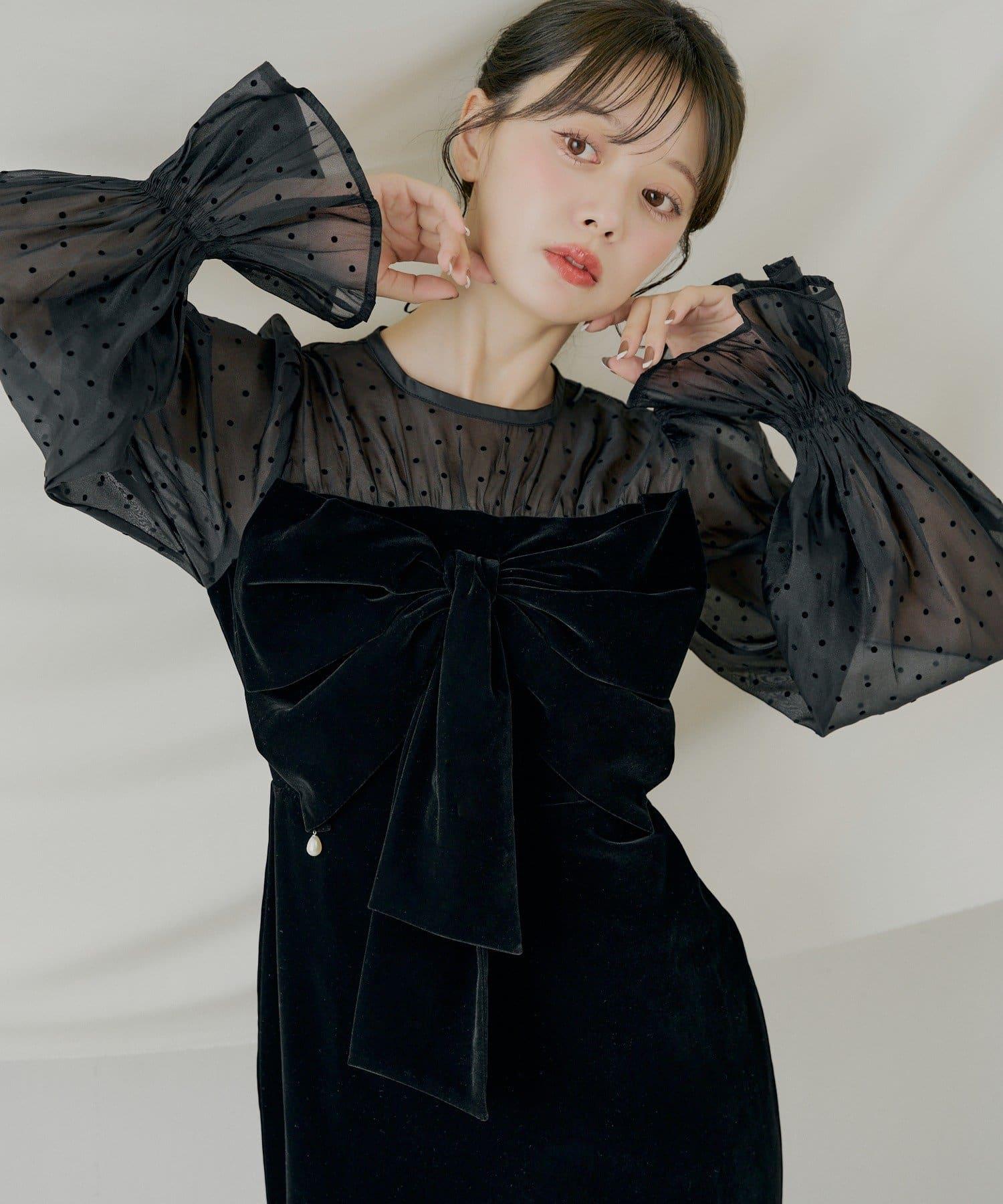 預約商品配色透視蝴蝶結天鵝絨連衣裙【SALON by Chico】