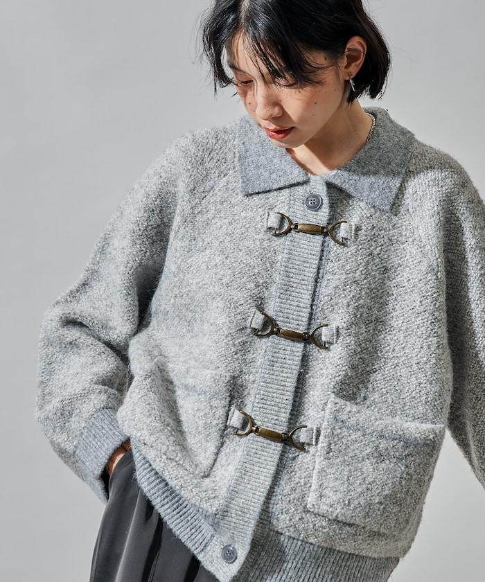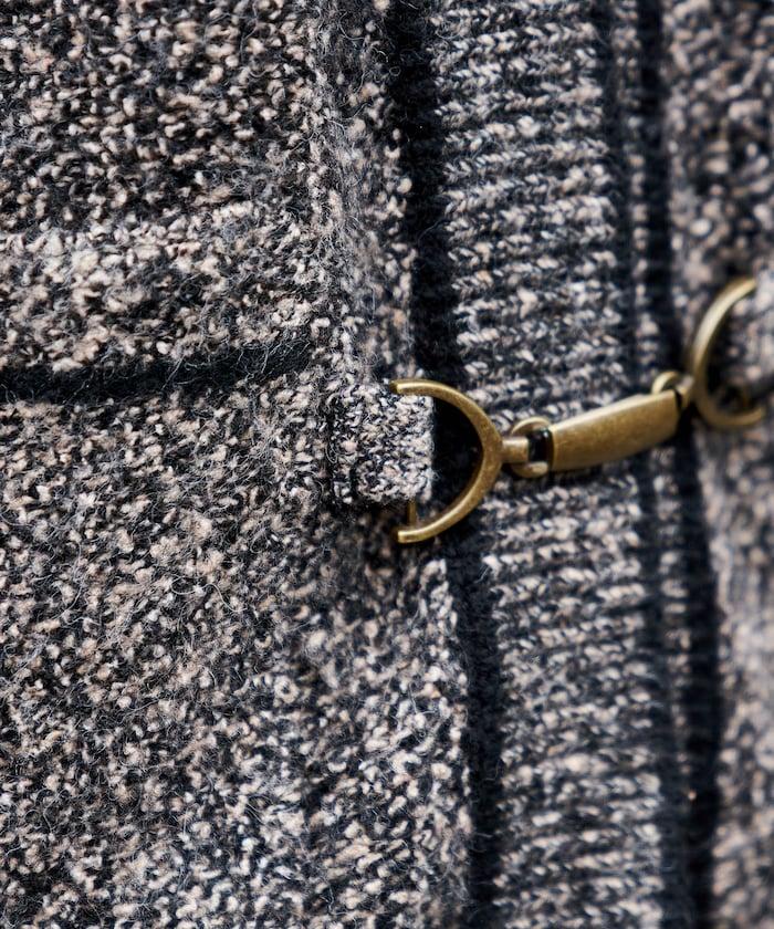 這是一款具有復古風格的針織開衫,前襟上有類似復古風格的金屬掛鉤。