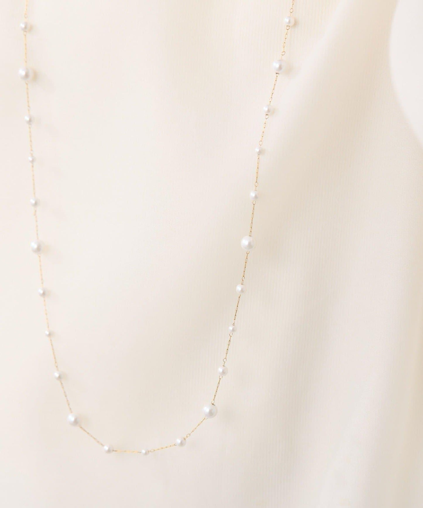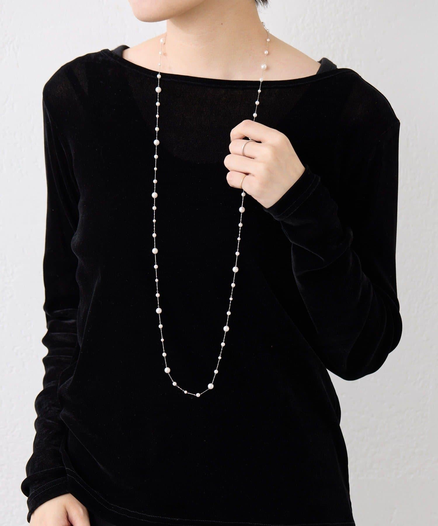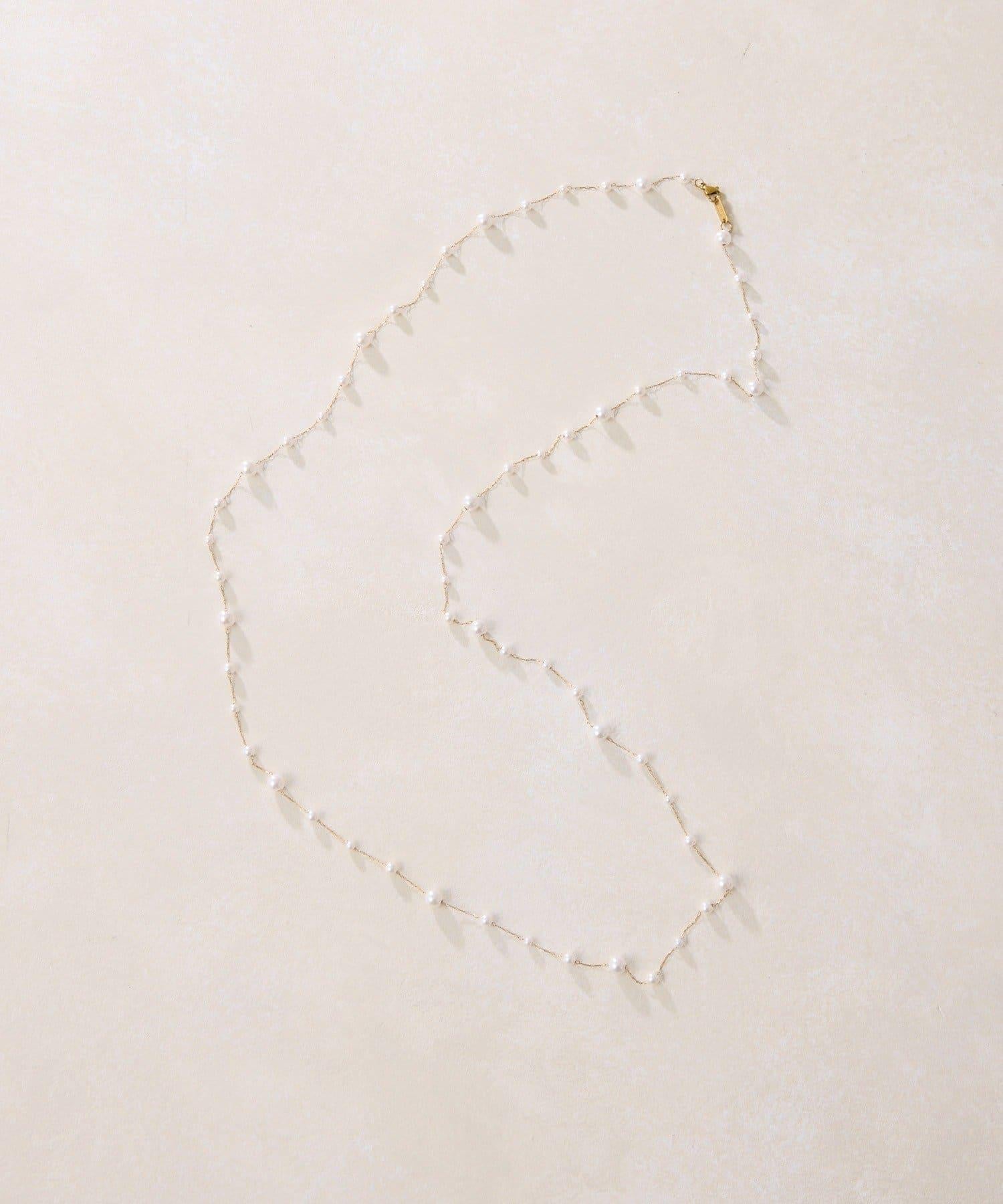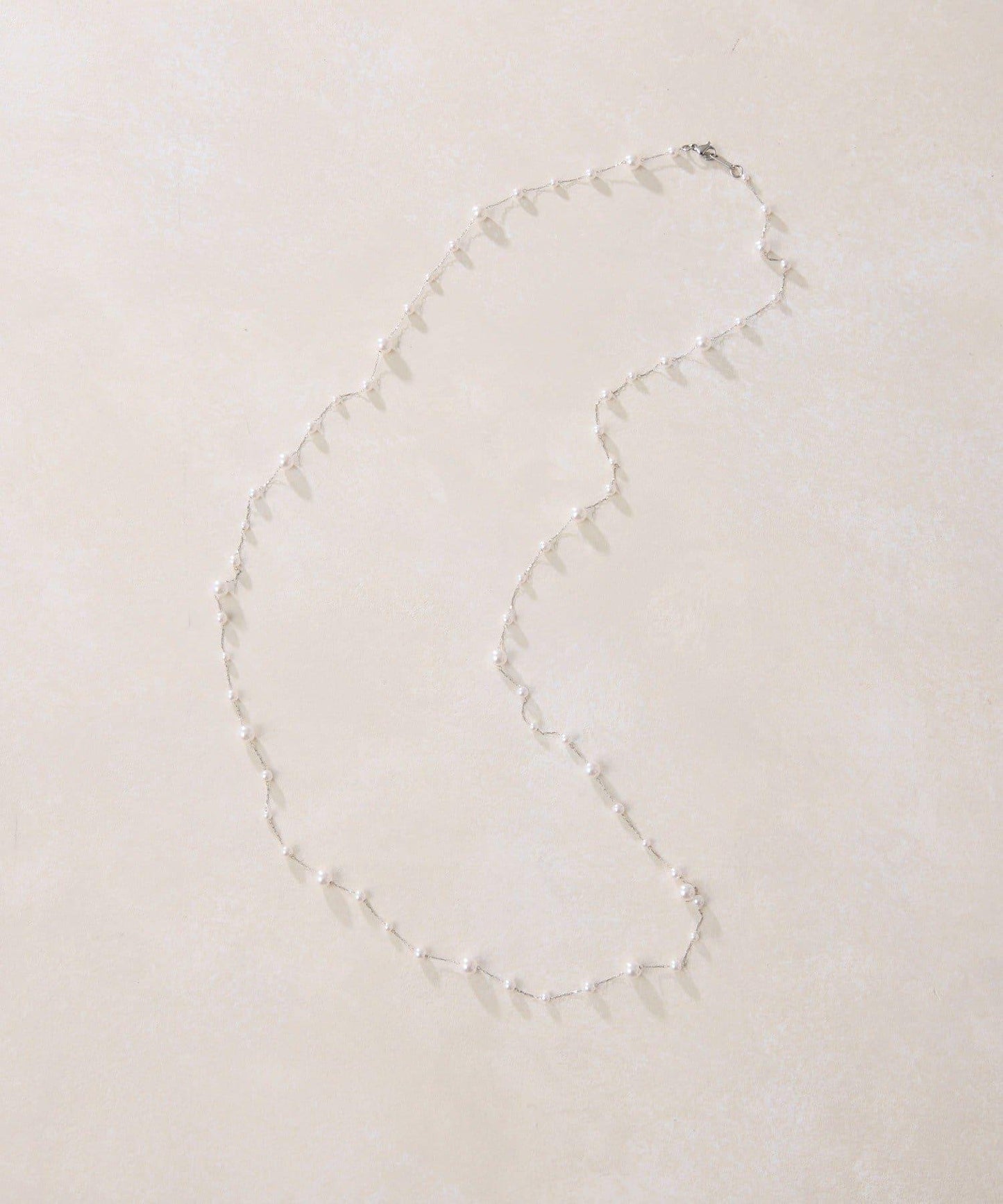 長頸珍珠項鍊,珍珠均勻分佈在精緻的超細不鏽鋼鏈條上。