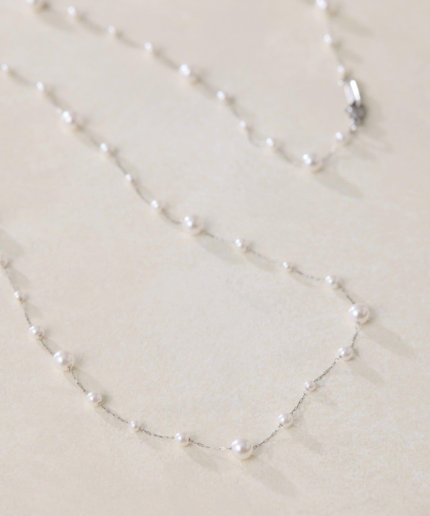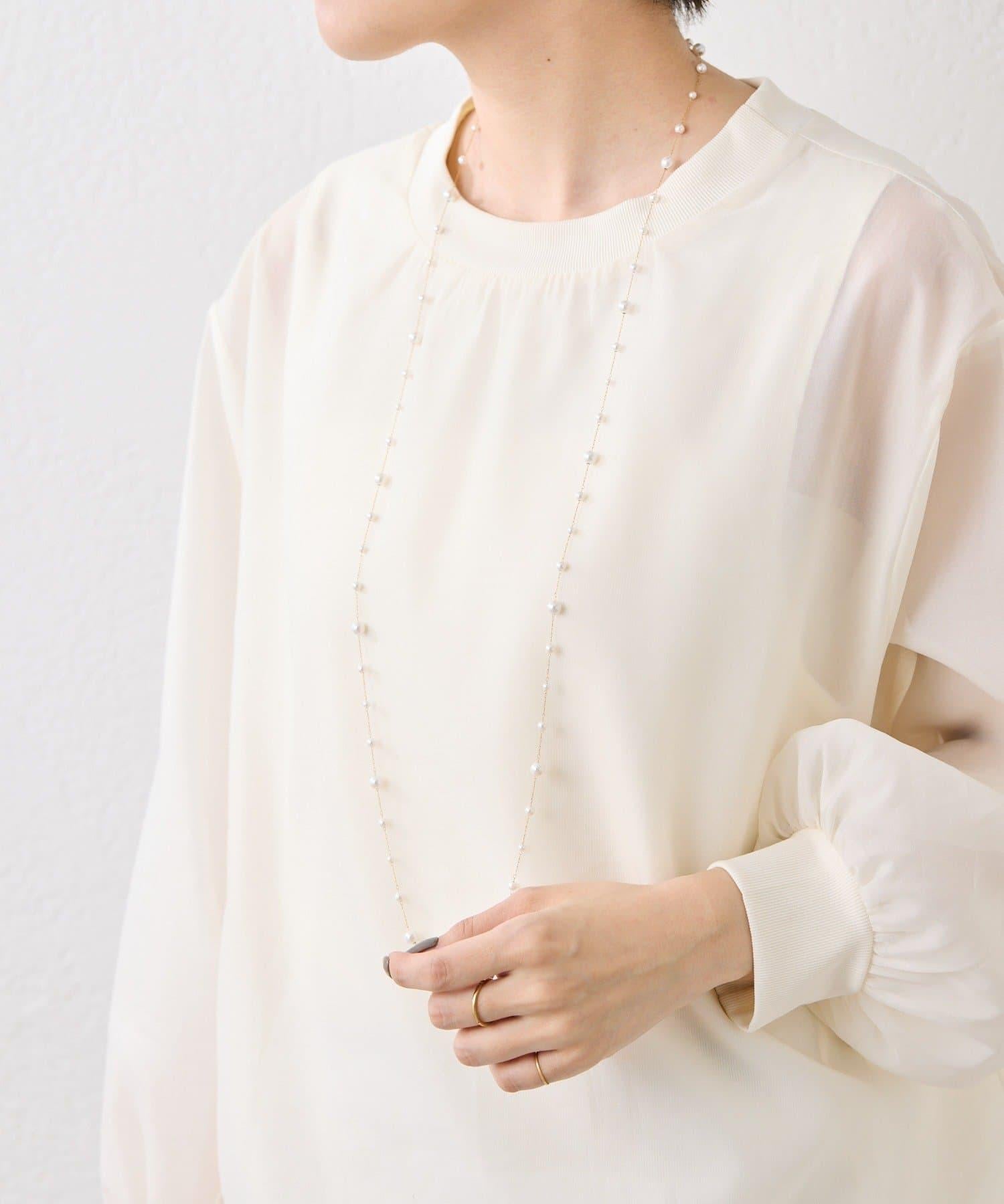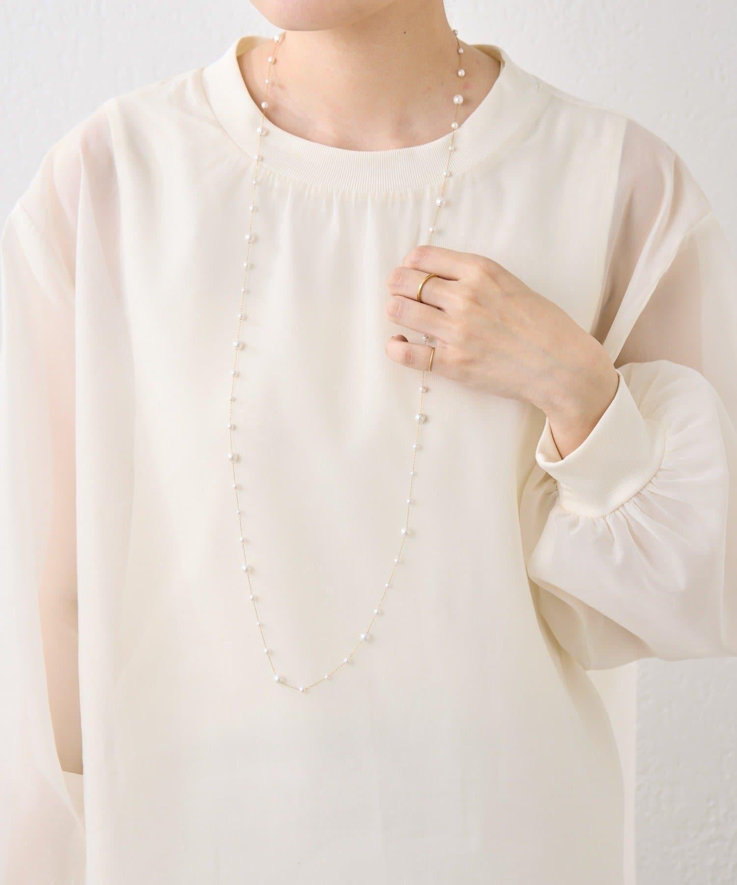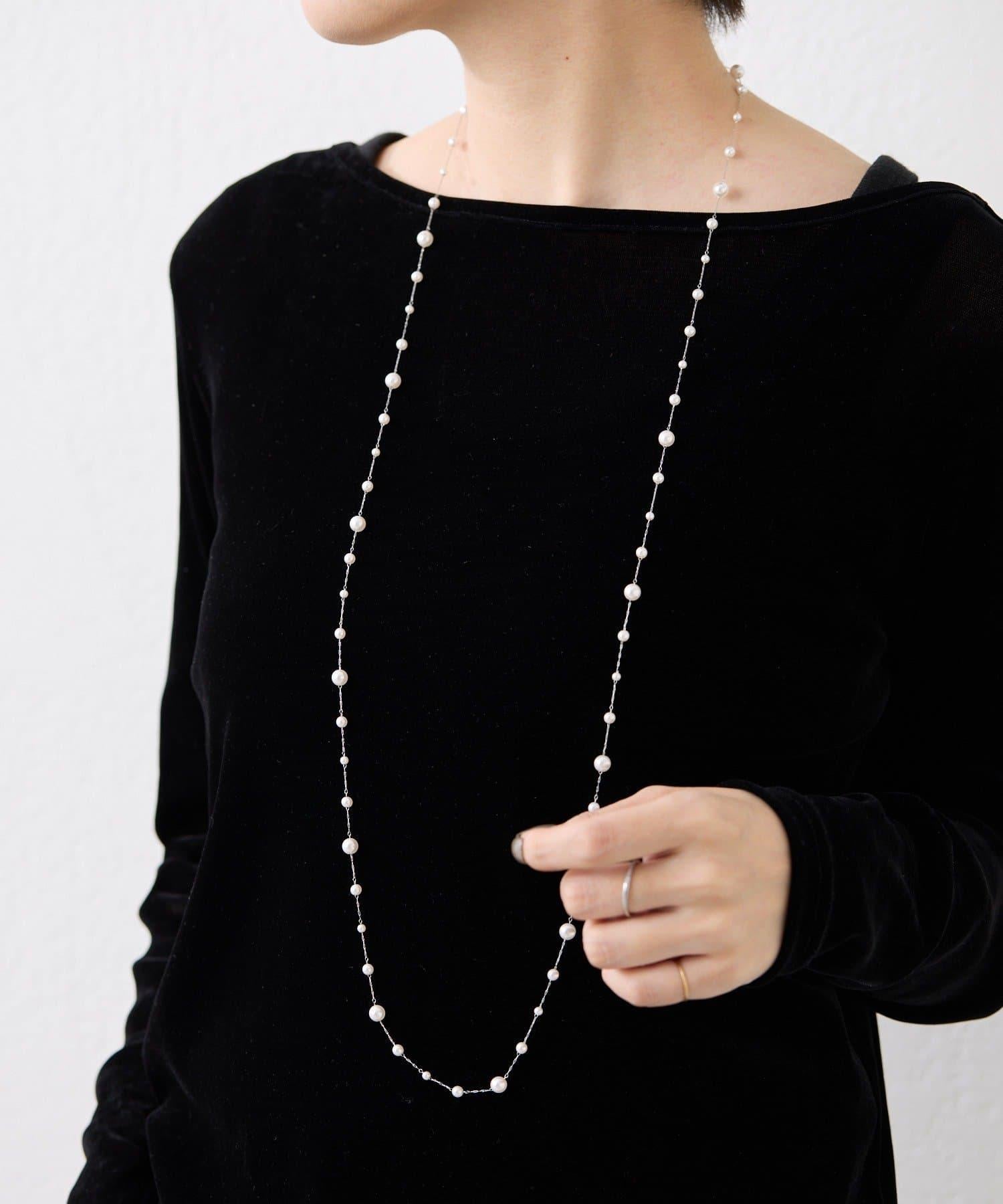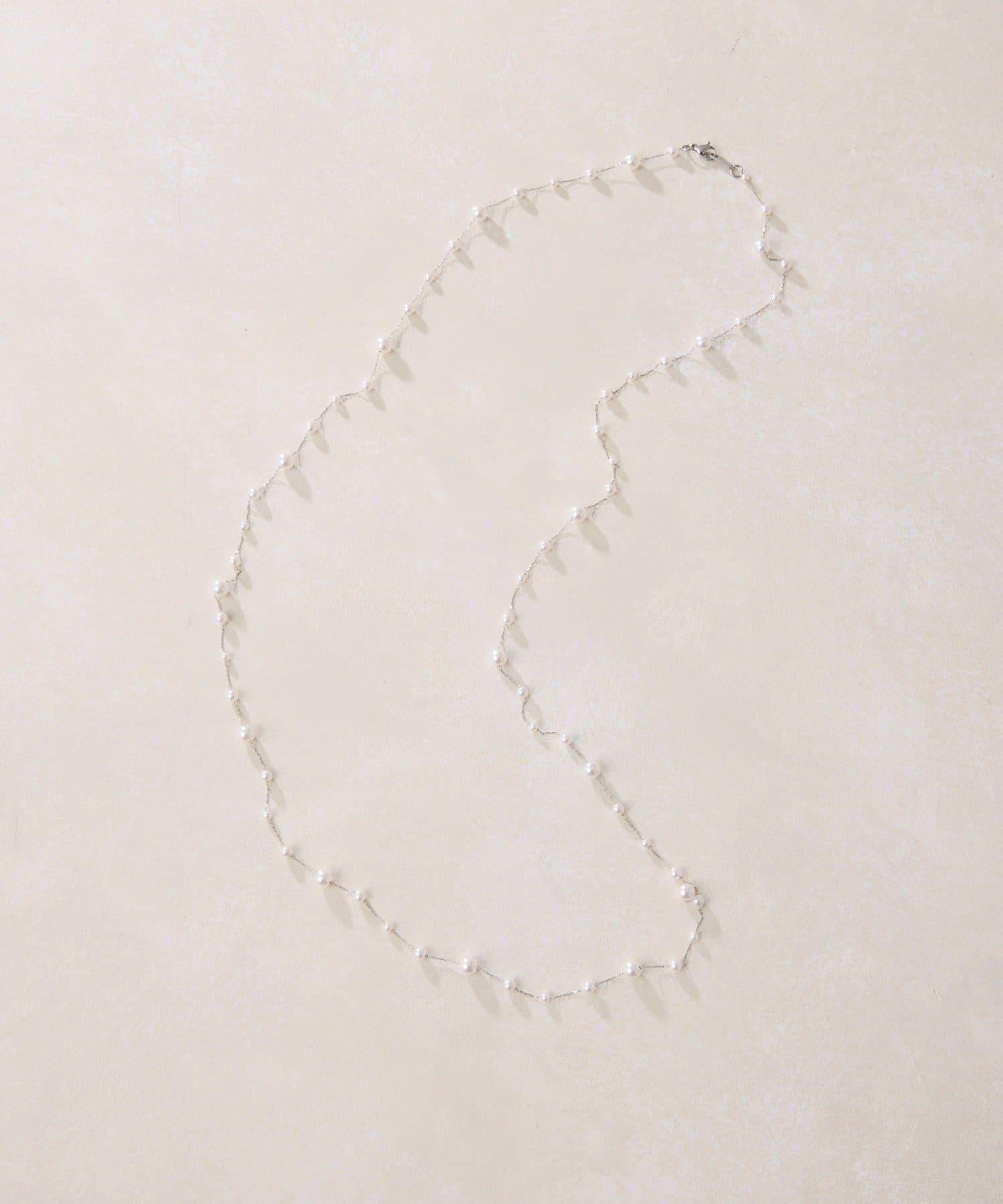 長頸珍珠項鍊,珍珠均勻分佈在精緻的超細不鏽鋼鏈條上。