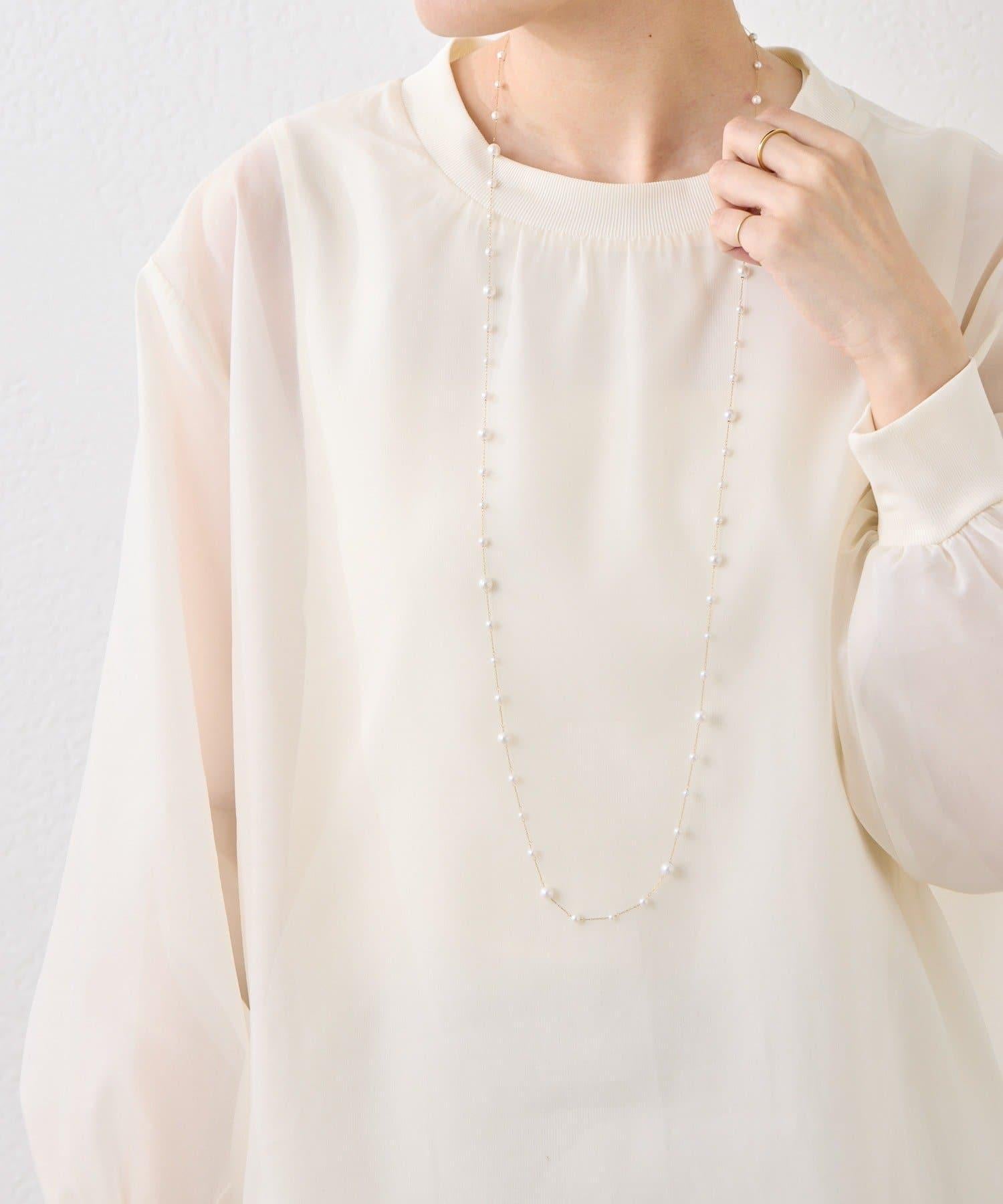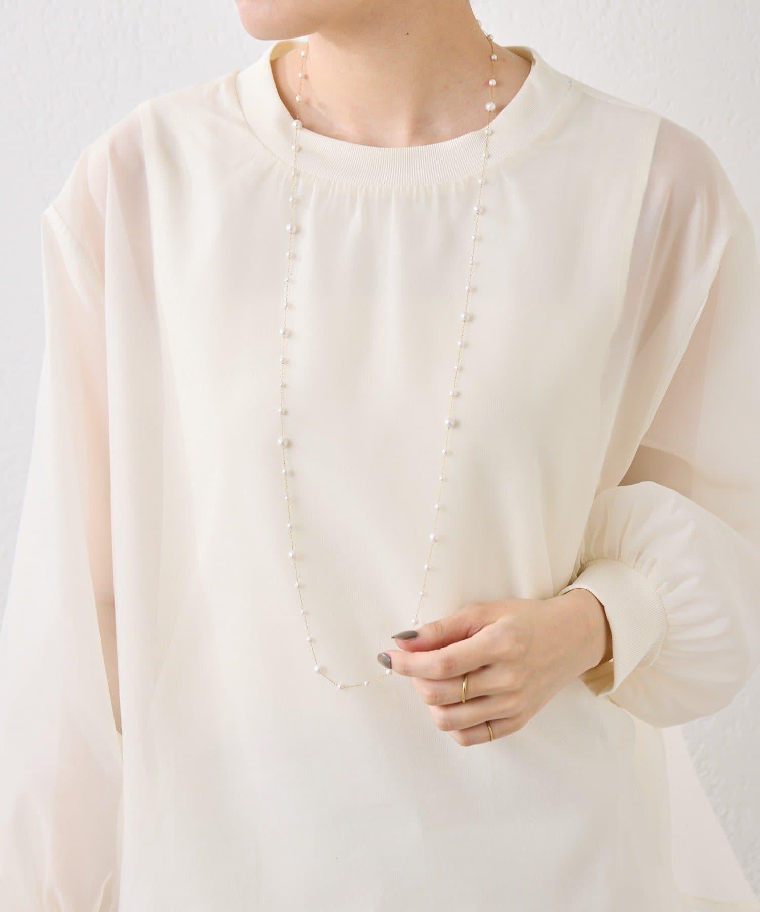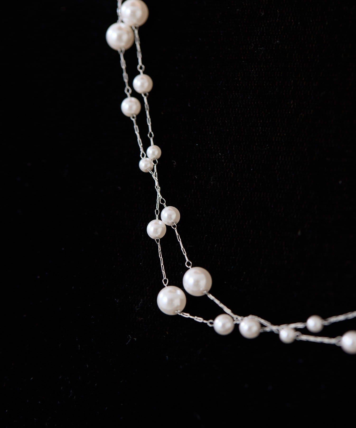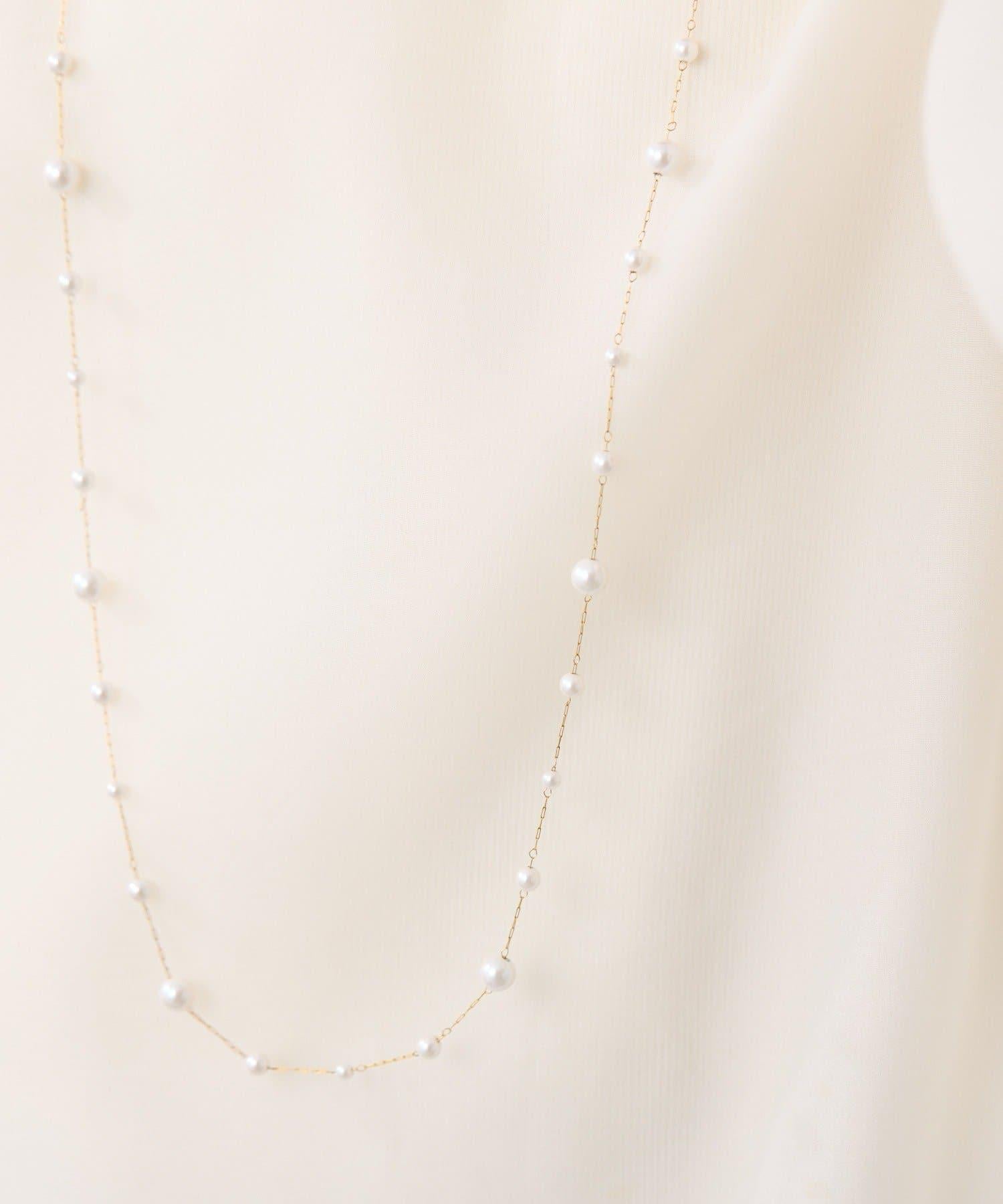 長頸珍珠項鍊,珍珠均勻分佈在精緻的超細不鏽鋼鏈條上。