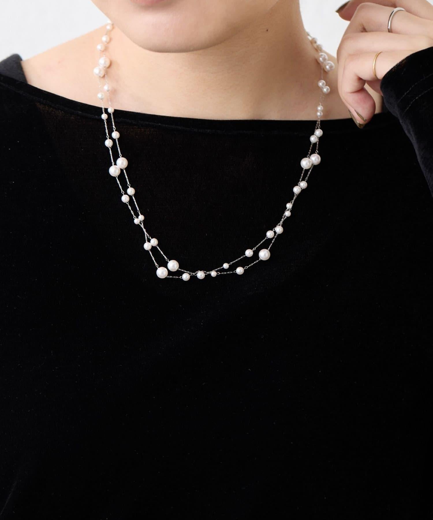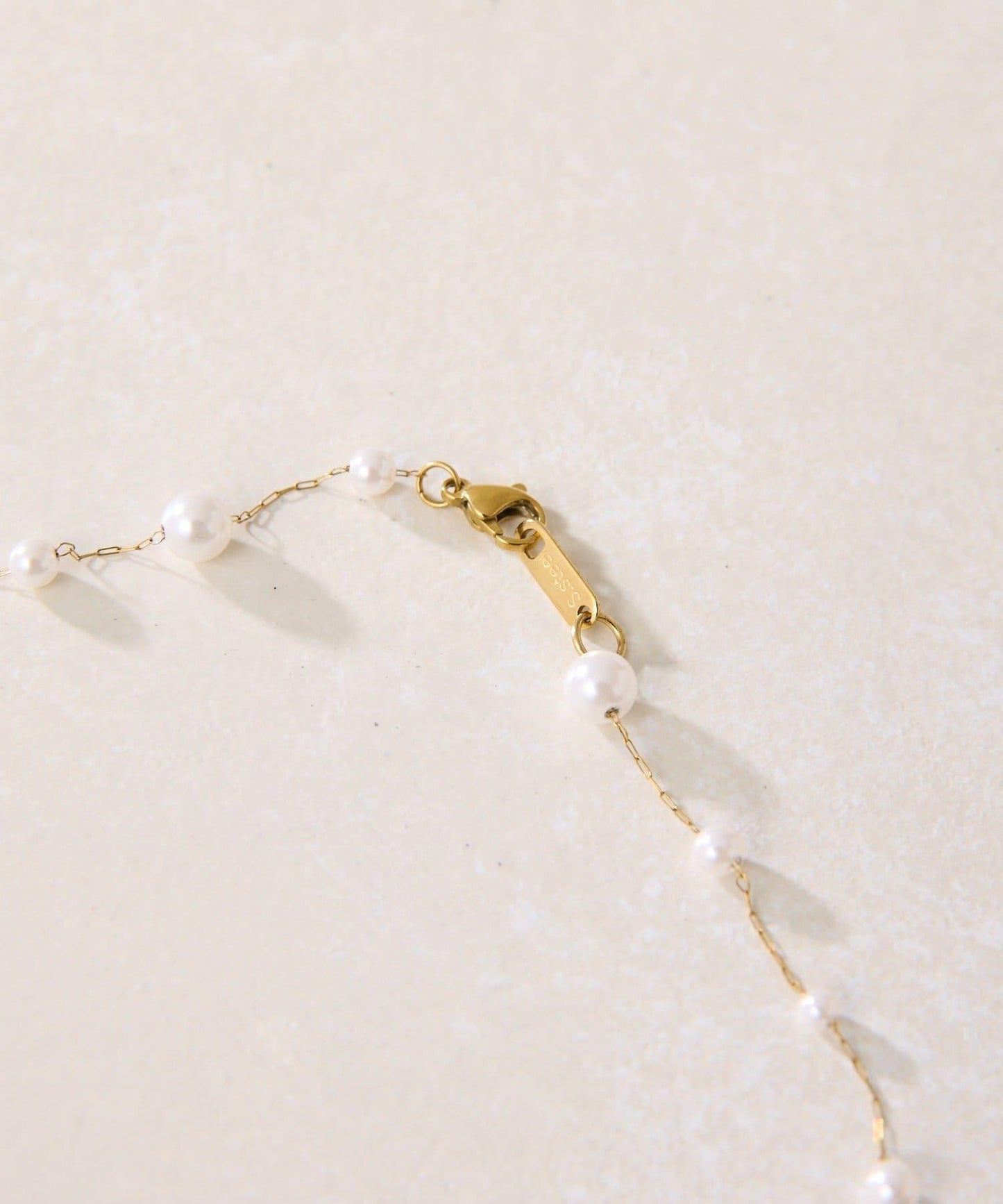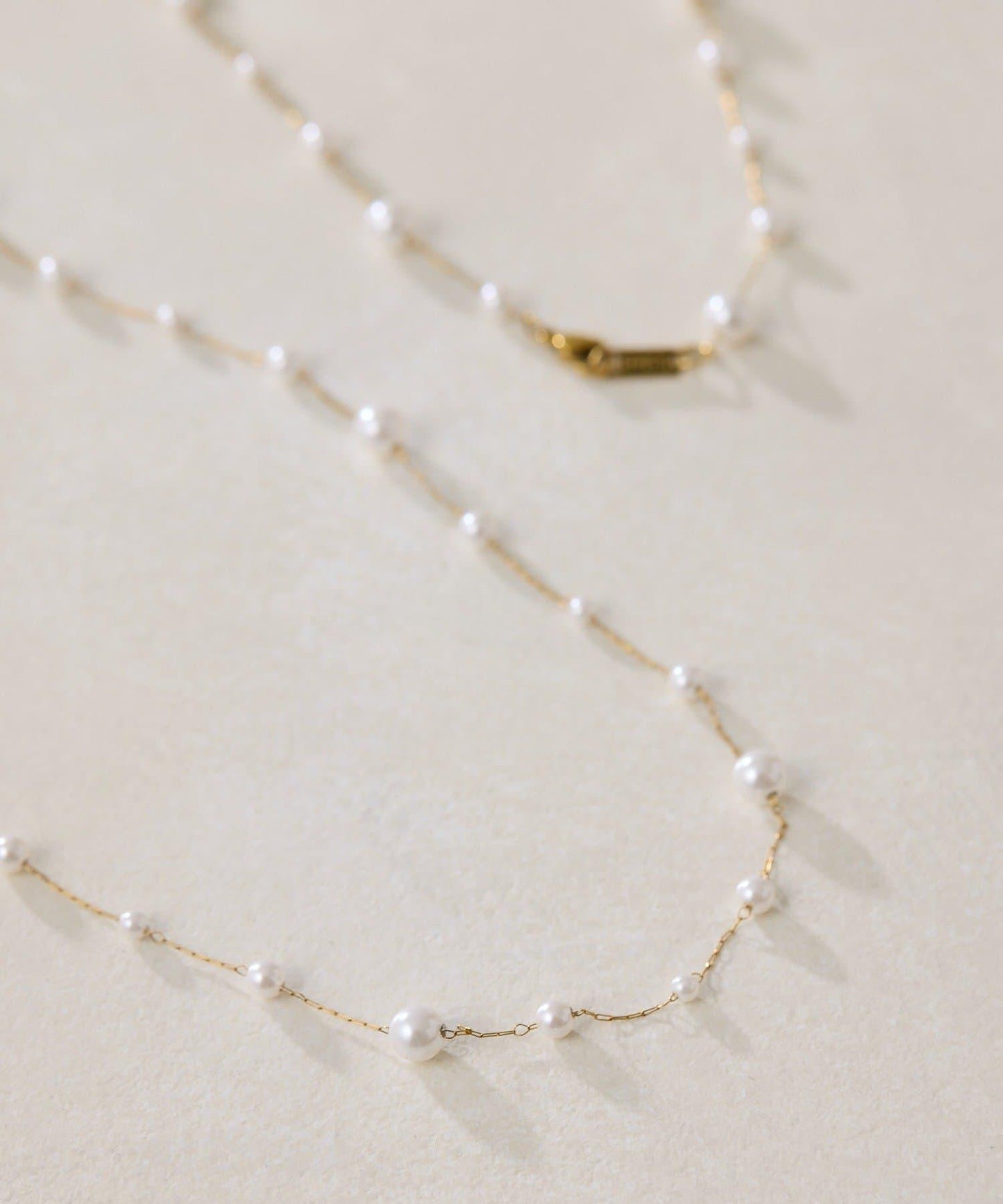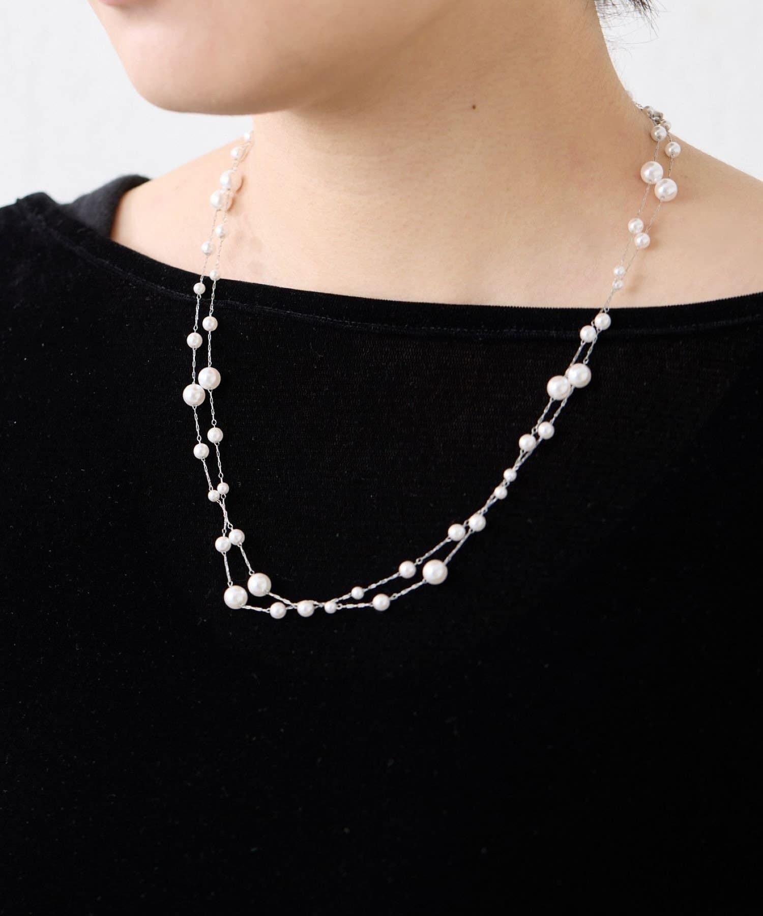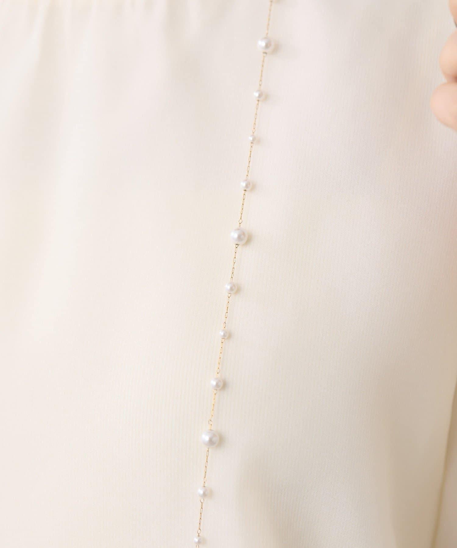 長頸珍珠項鍊,珍珠均勻分佈在精緻的超細不鏽鋼鏈條上。