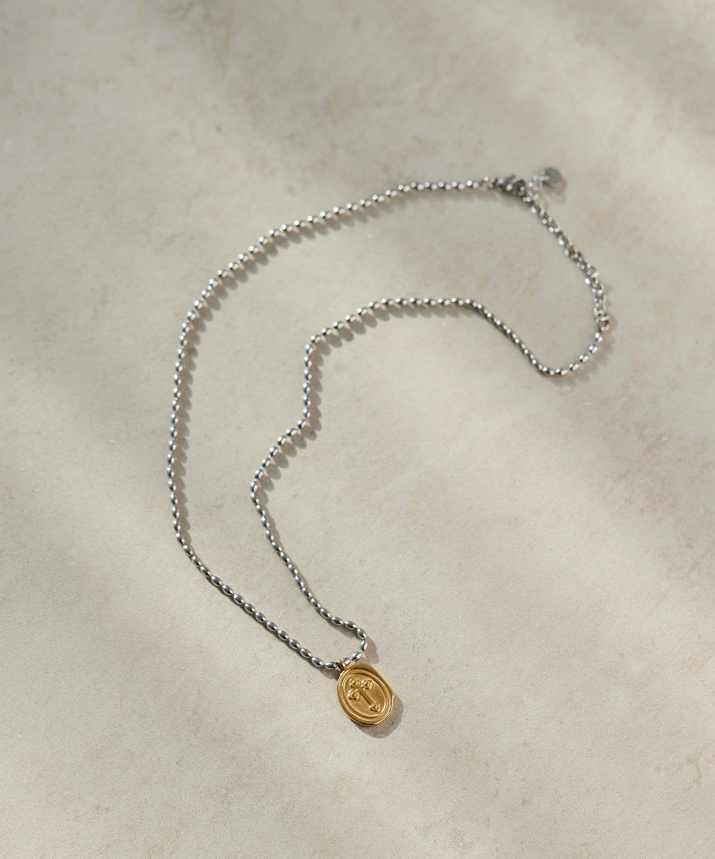 這條雙色項鍊上的十字圖案硬幣令人印象深刻。