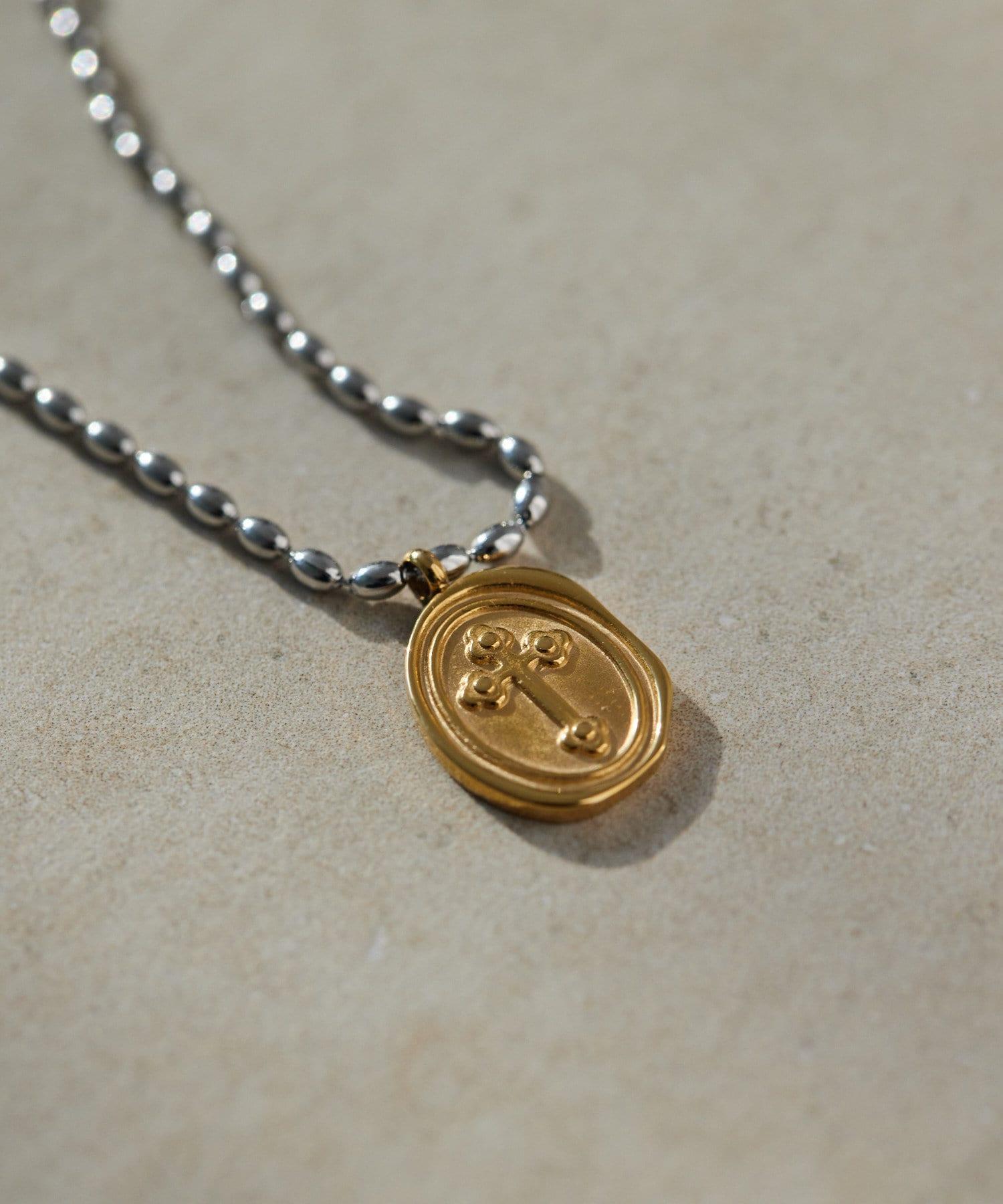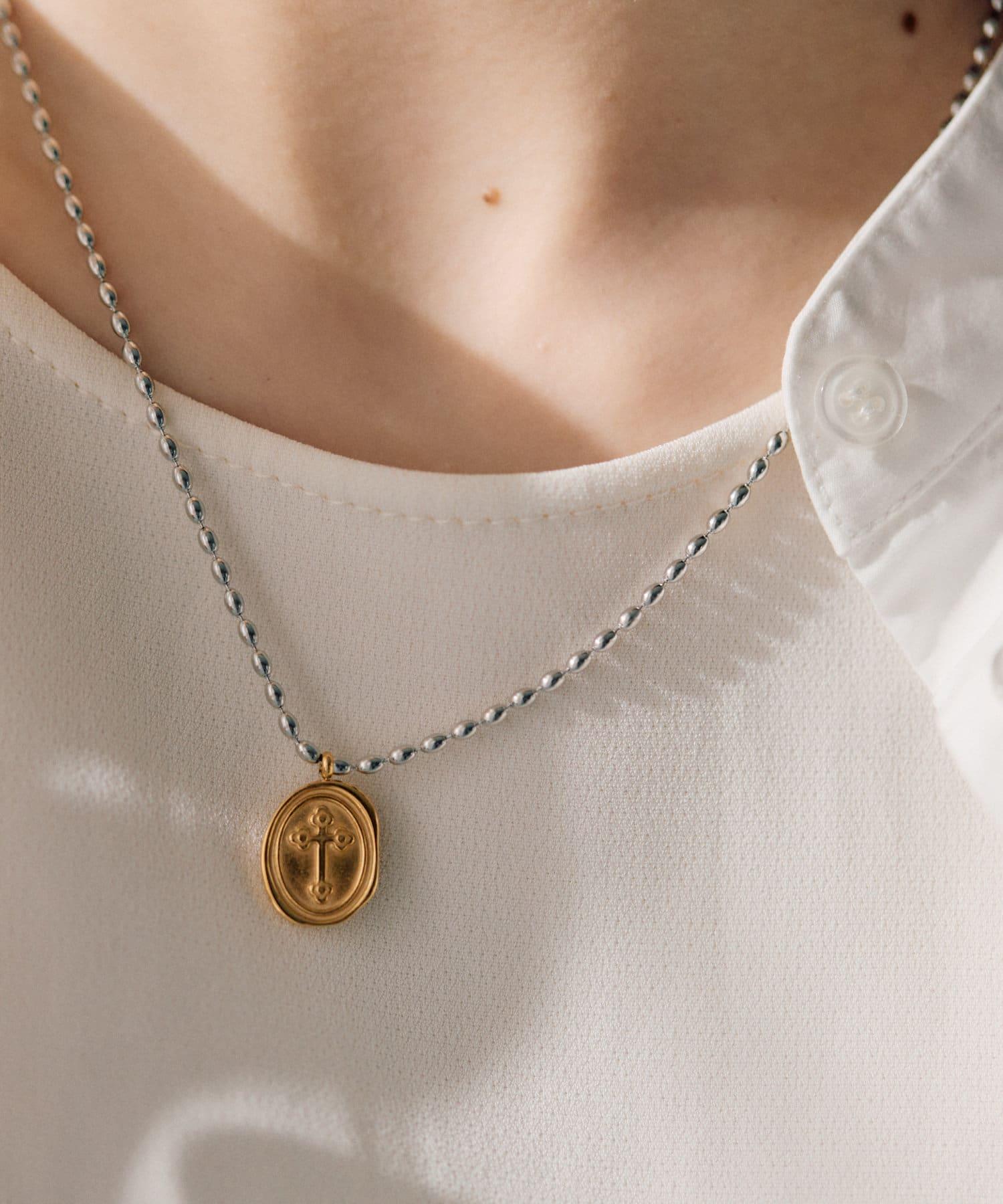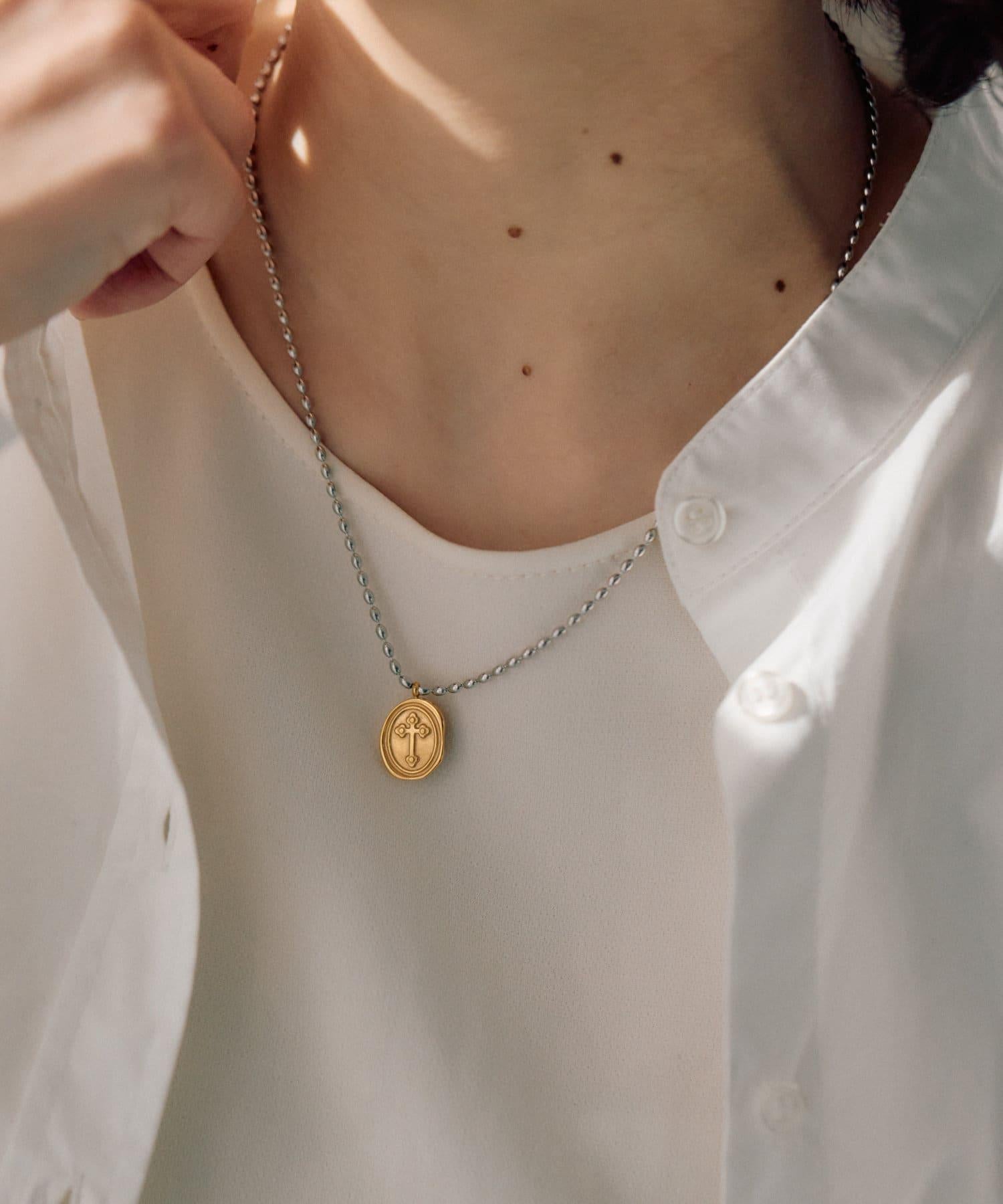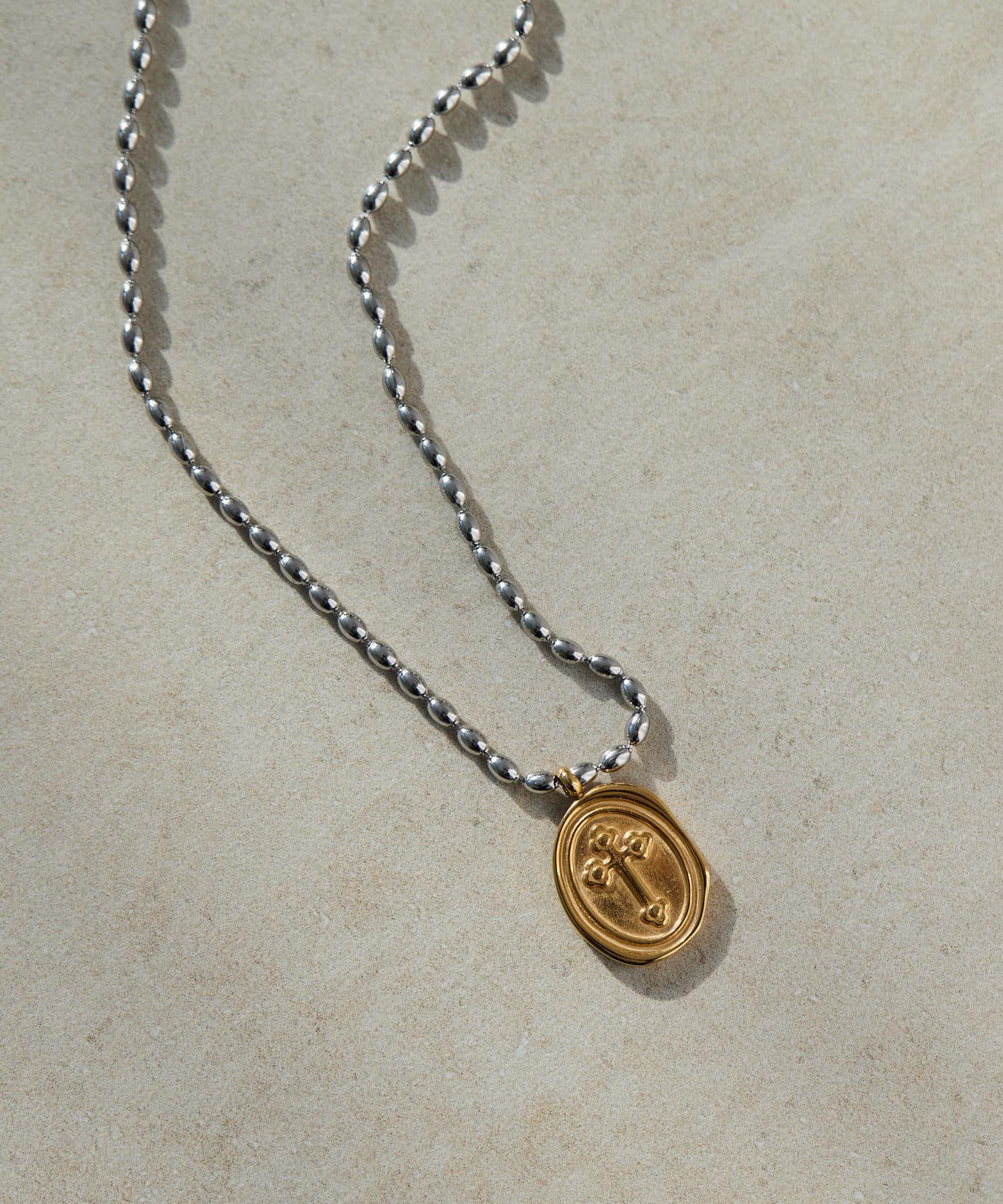 以十字架為主題的雙色硬幣項鍊引人注目。