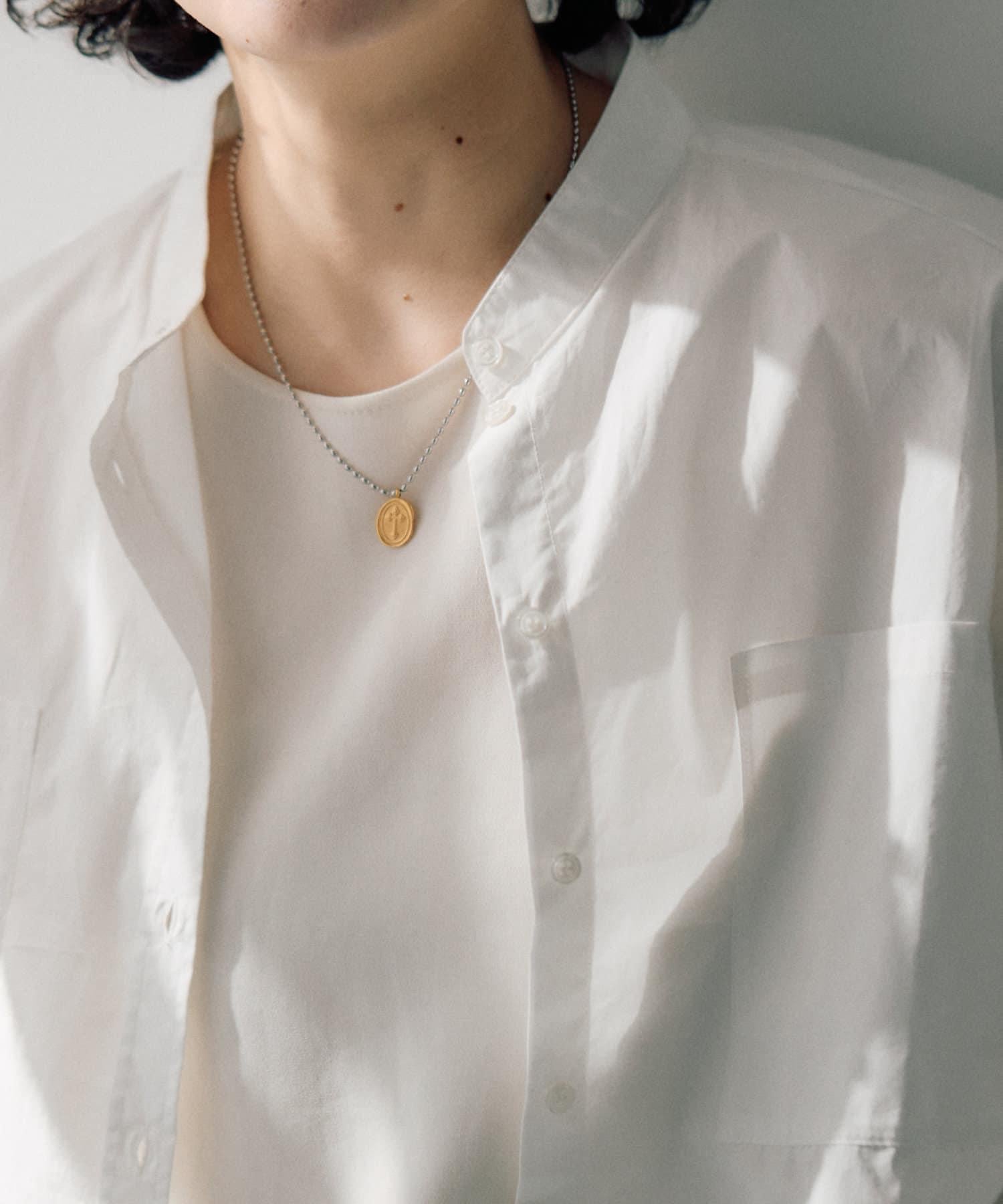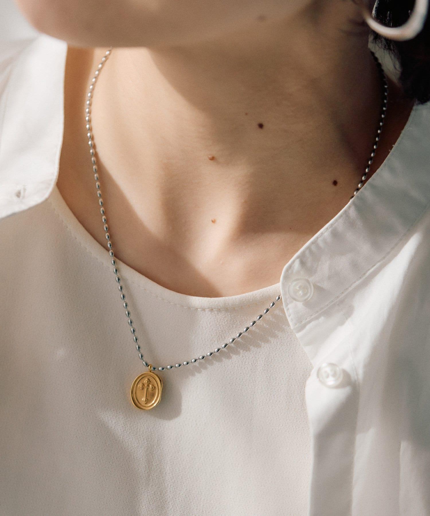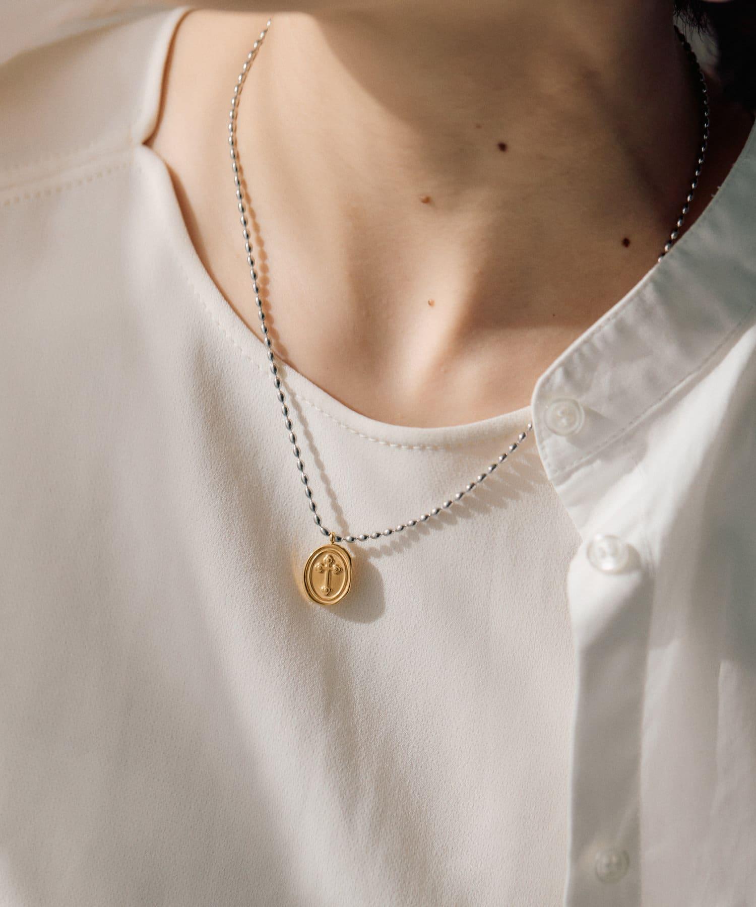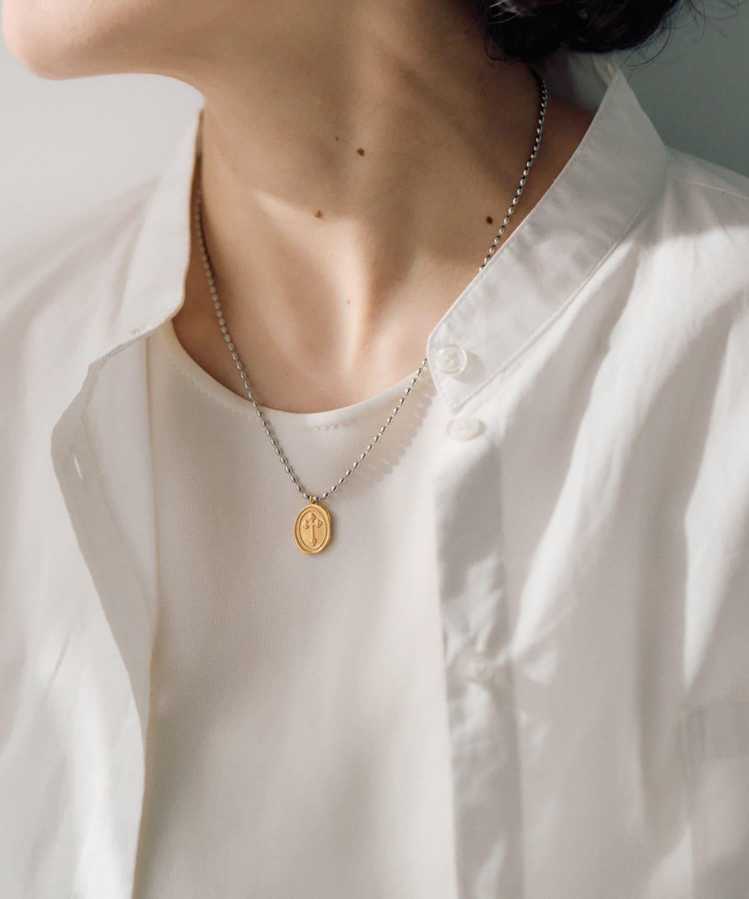 以十字架為主題的雙色硬幣項鍊引人注目。