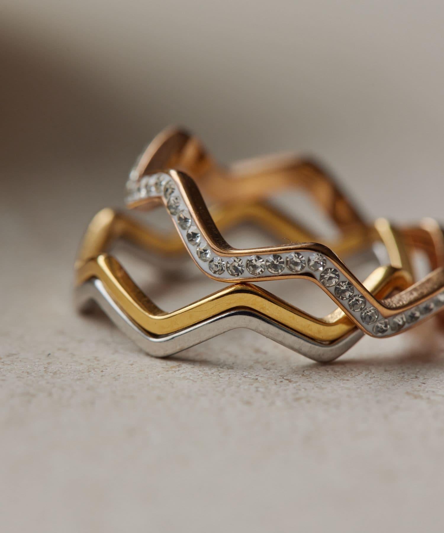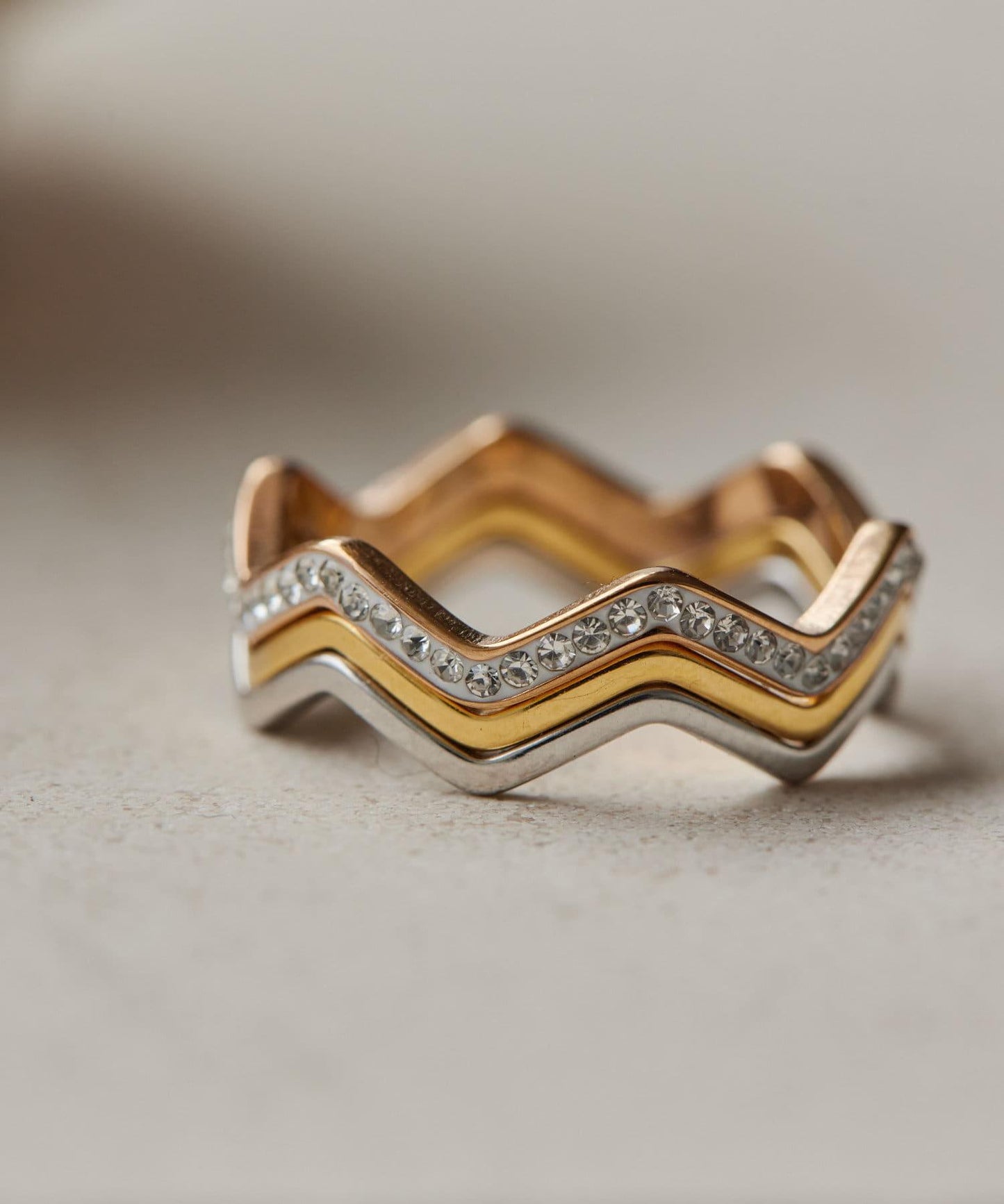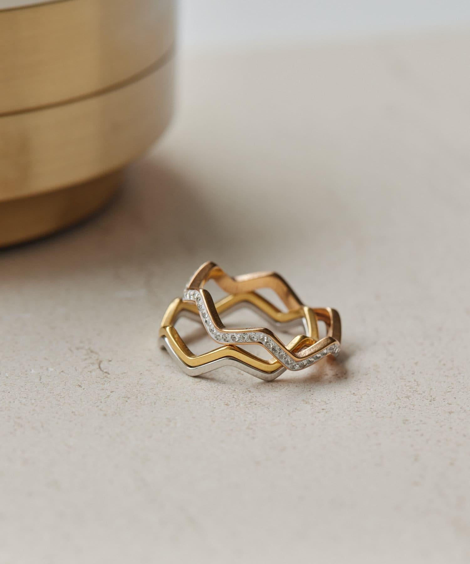 金、銀、玫瑰金三色混搭的不鏽鋼三層戒指。