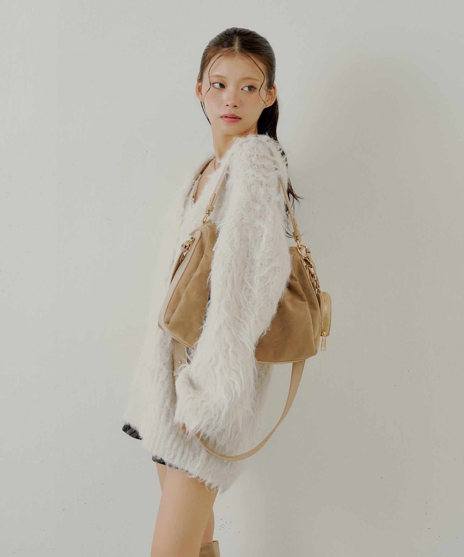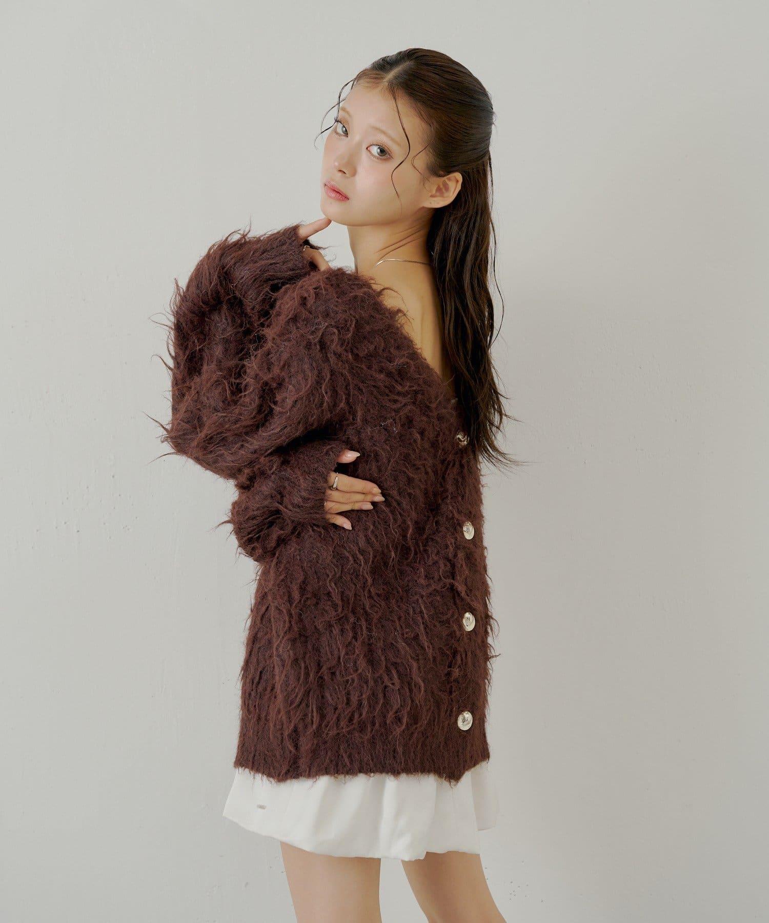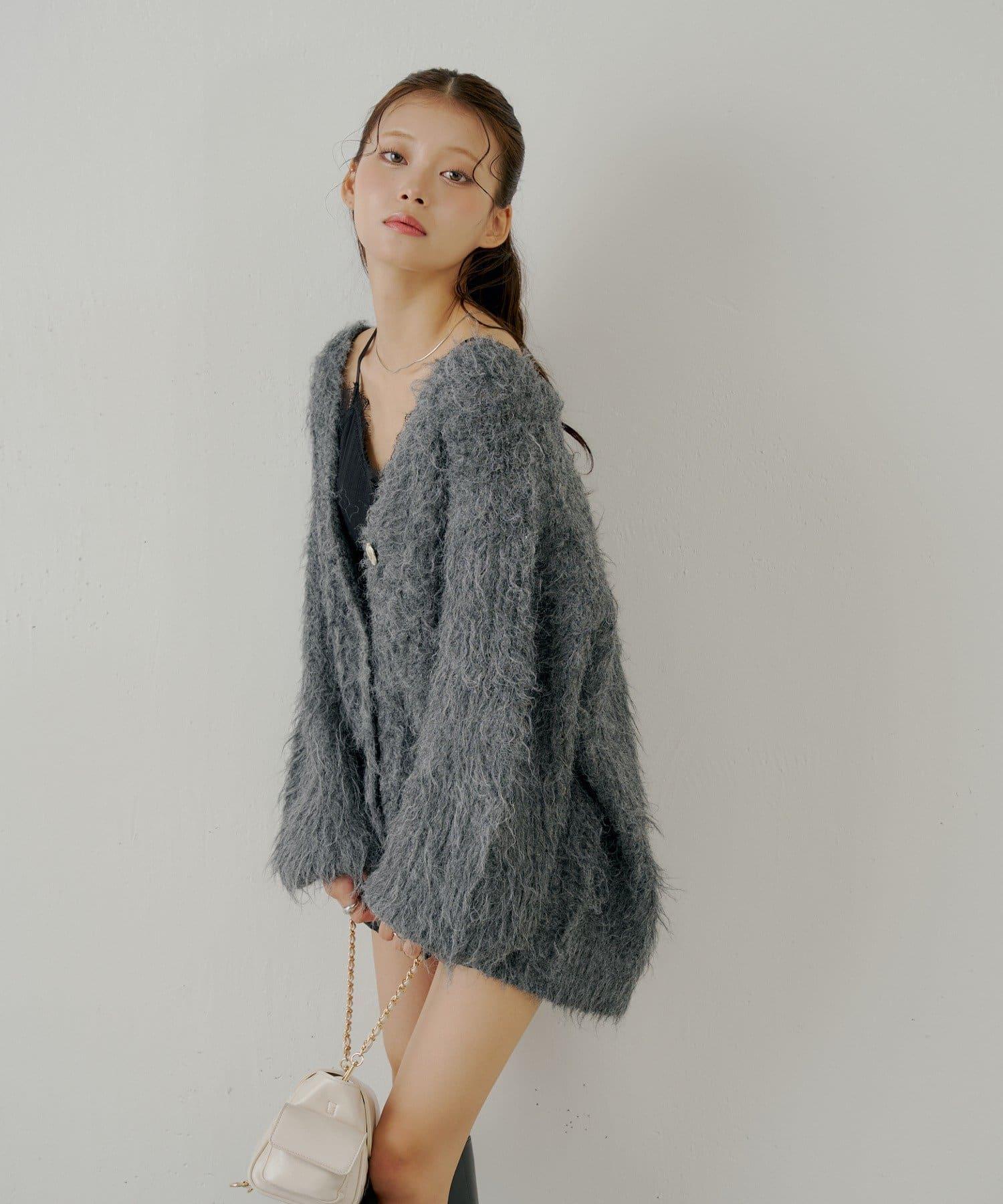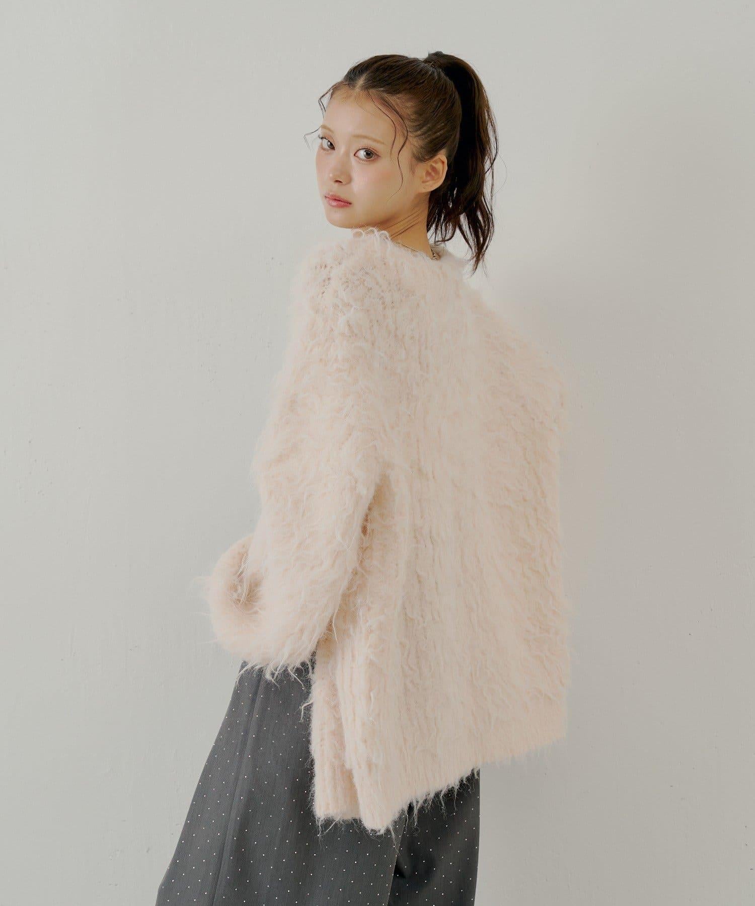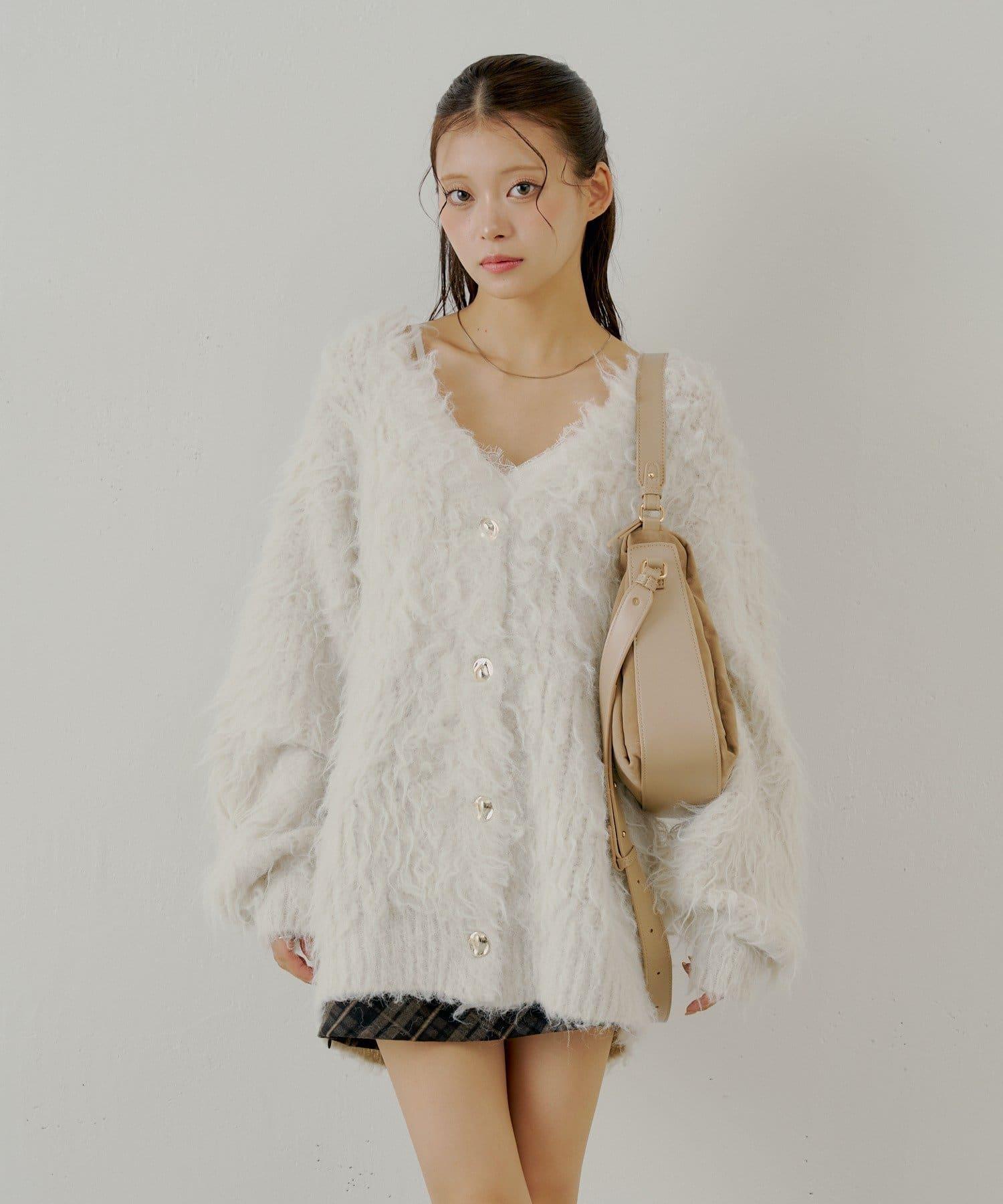 寬鬆開衫,採用蓬鬆絨毛面料。