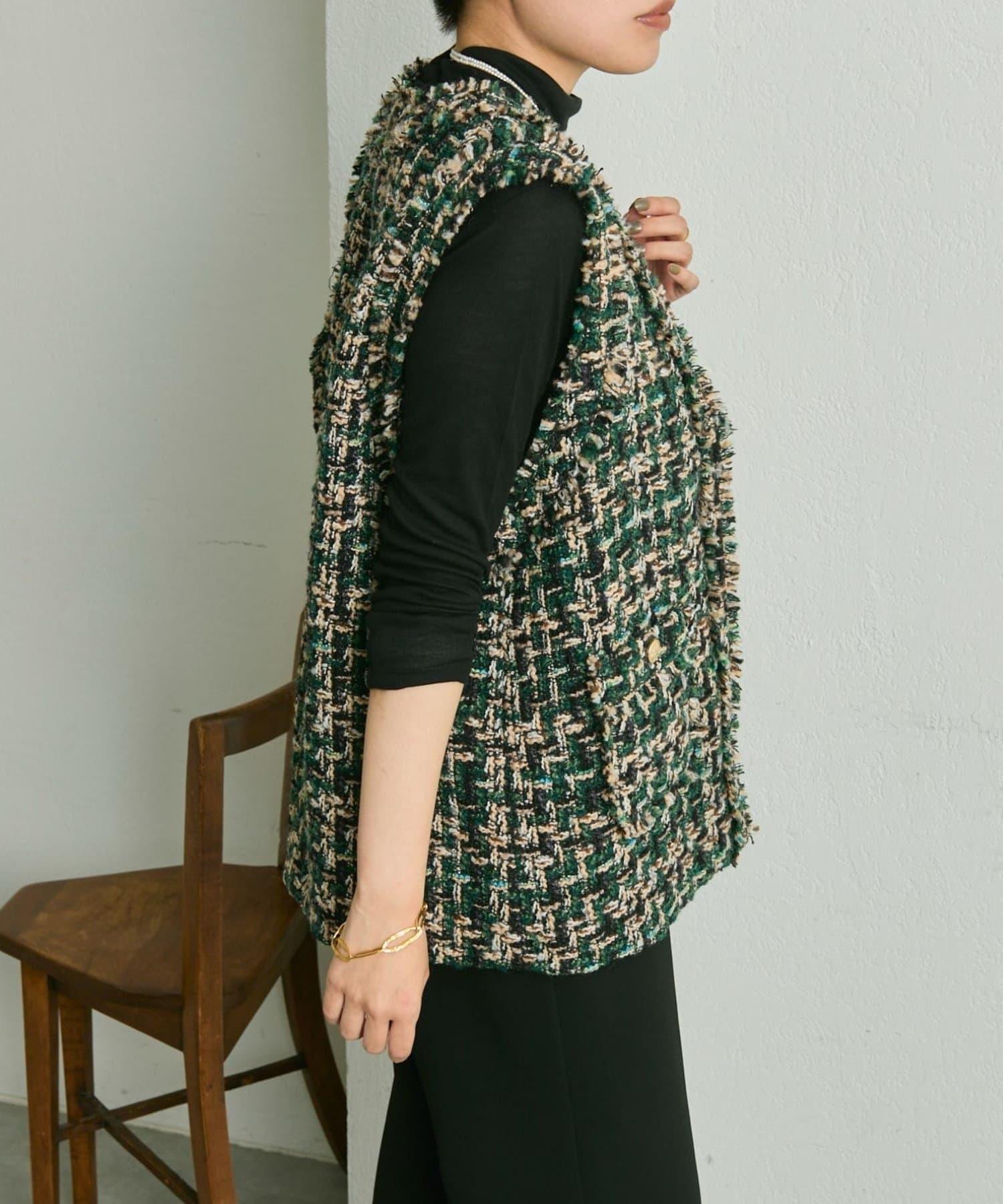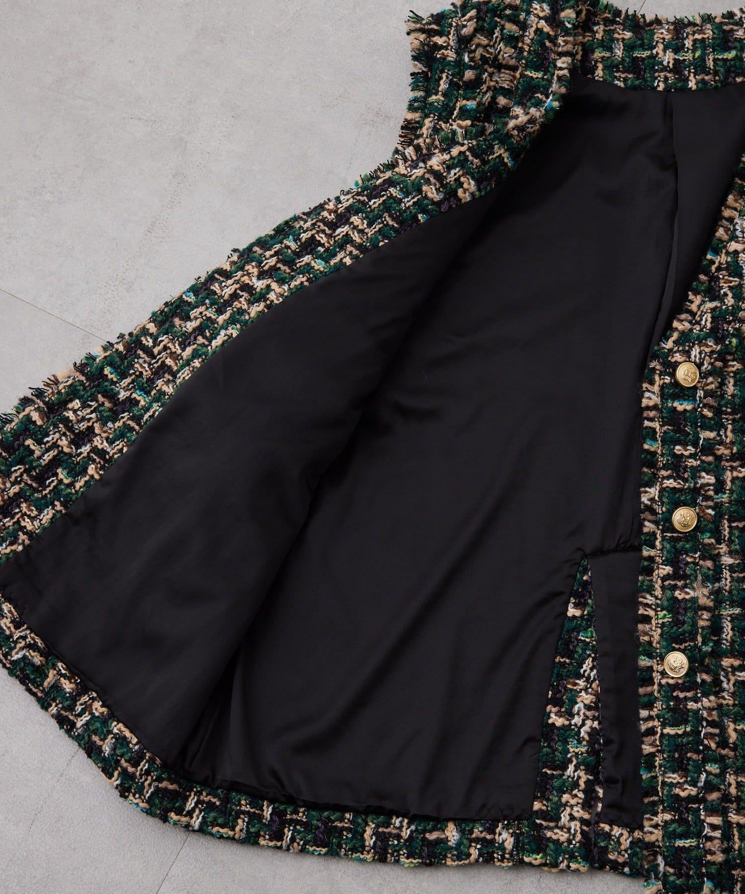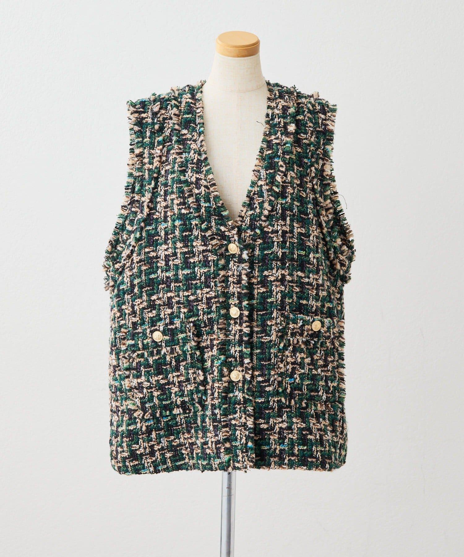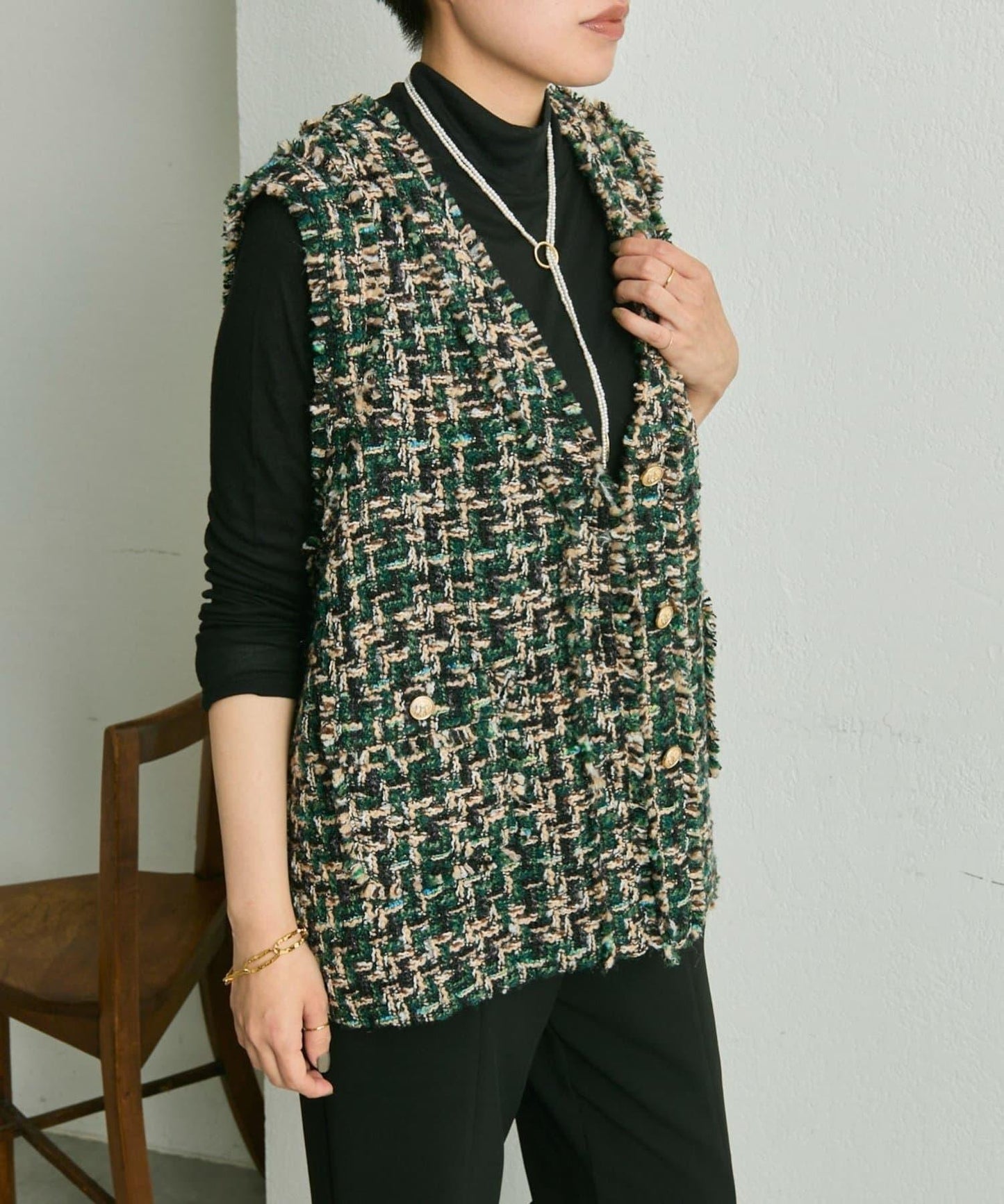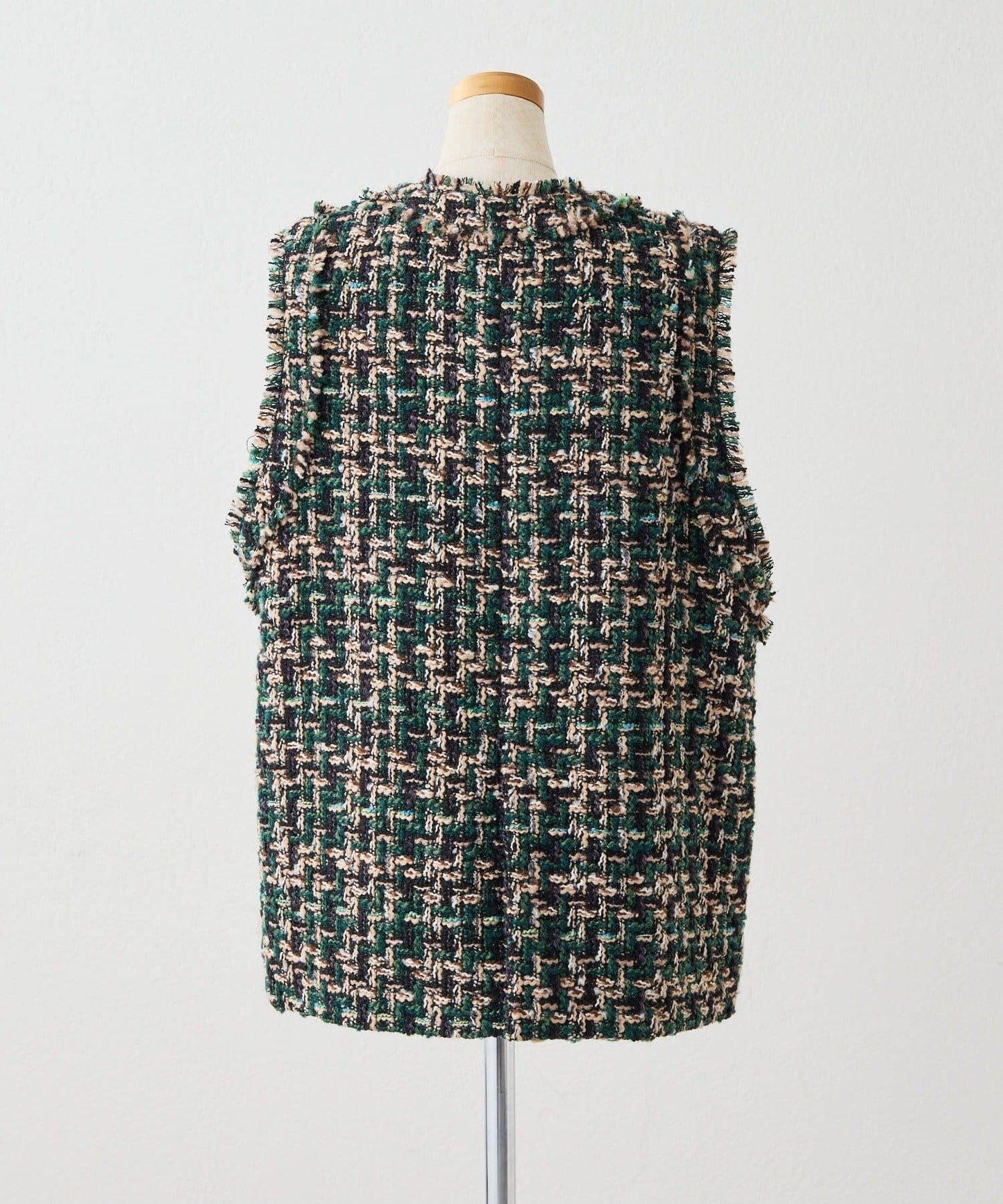 這款粗花呢馬甲以綠色為基調,由包括紗線在內的多種紗線組合而成。