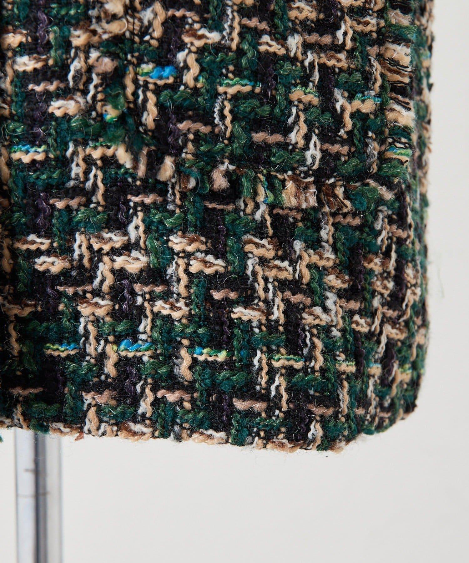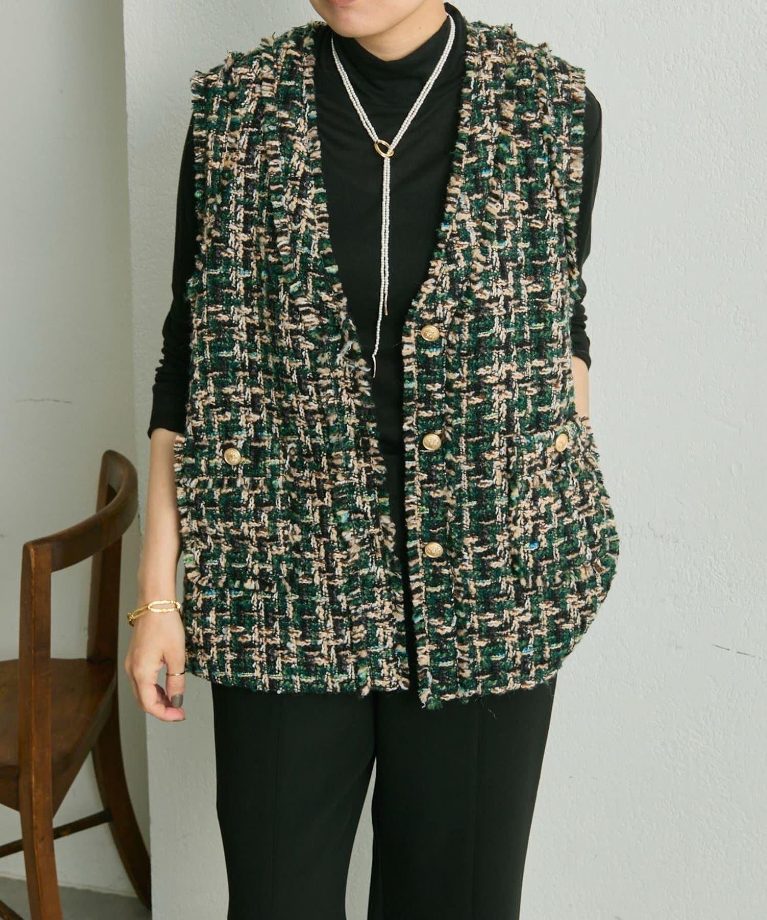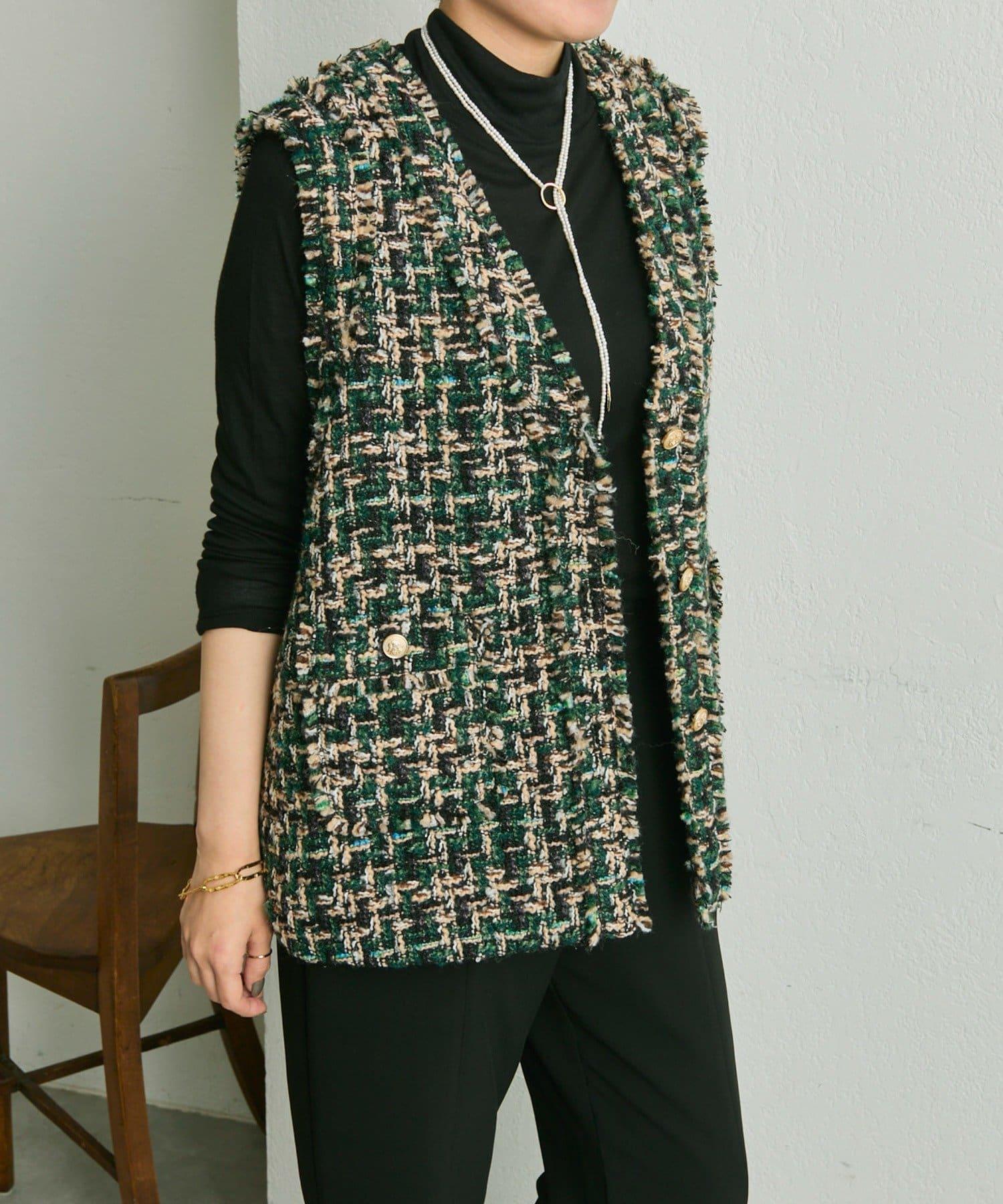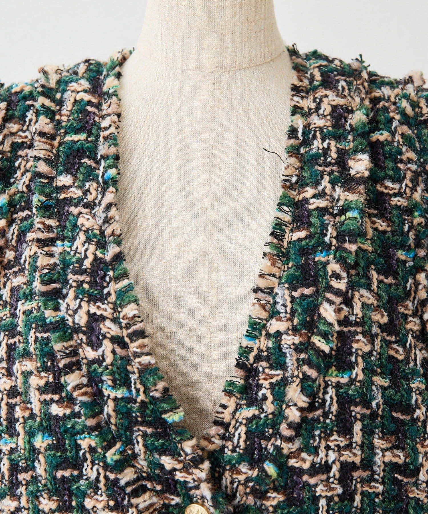 這款粗花呢馬甲以綠色為基調,由包括紗線在內的多種紗線組合而成。