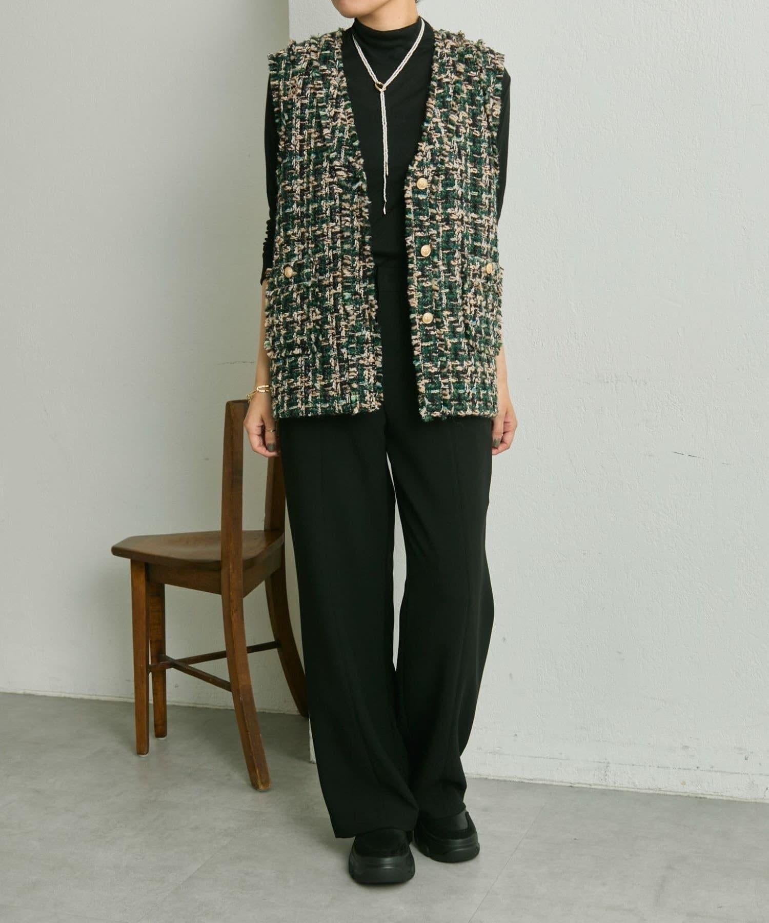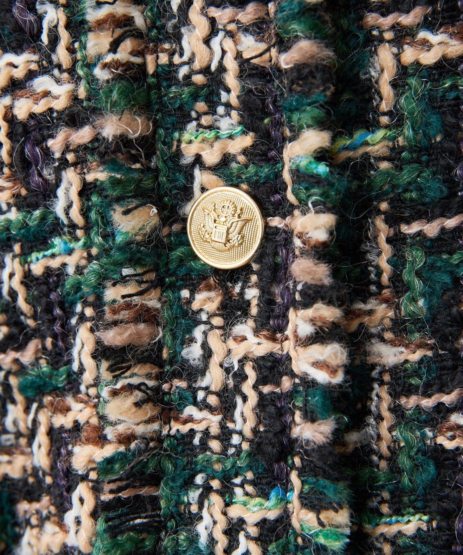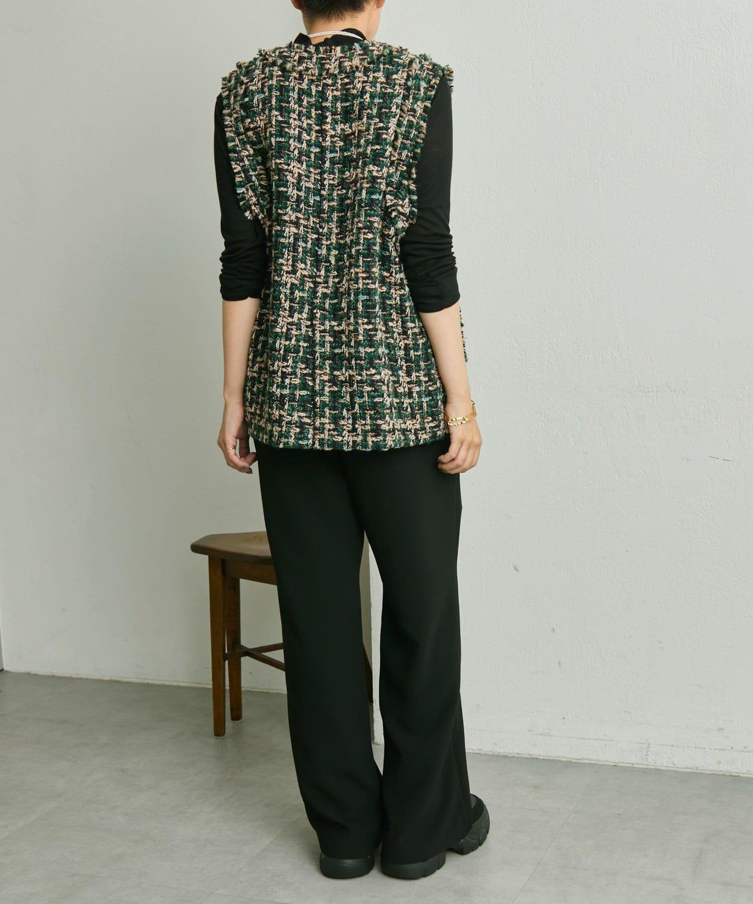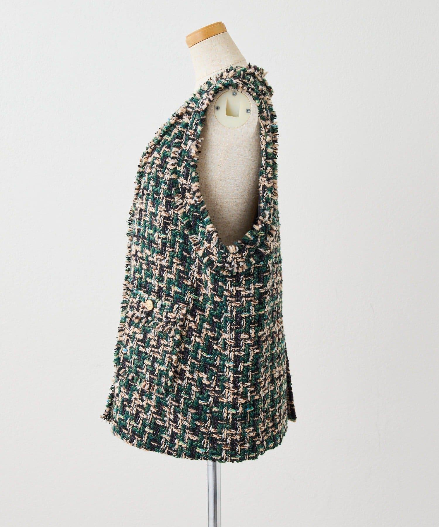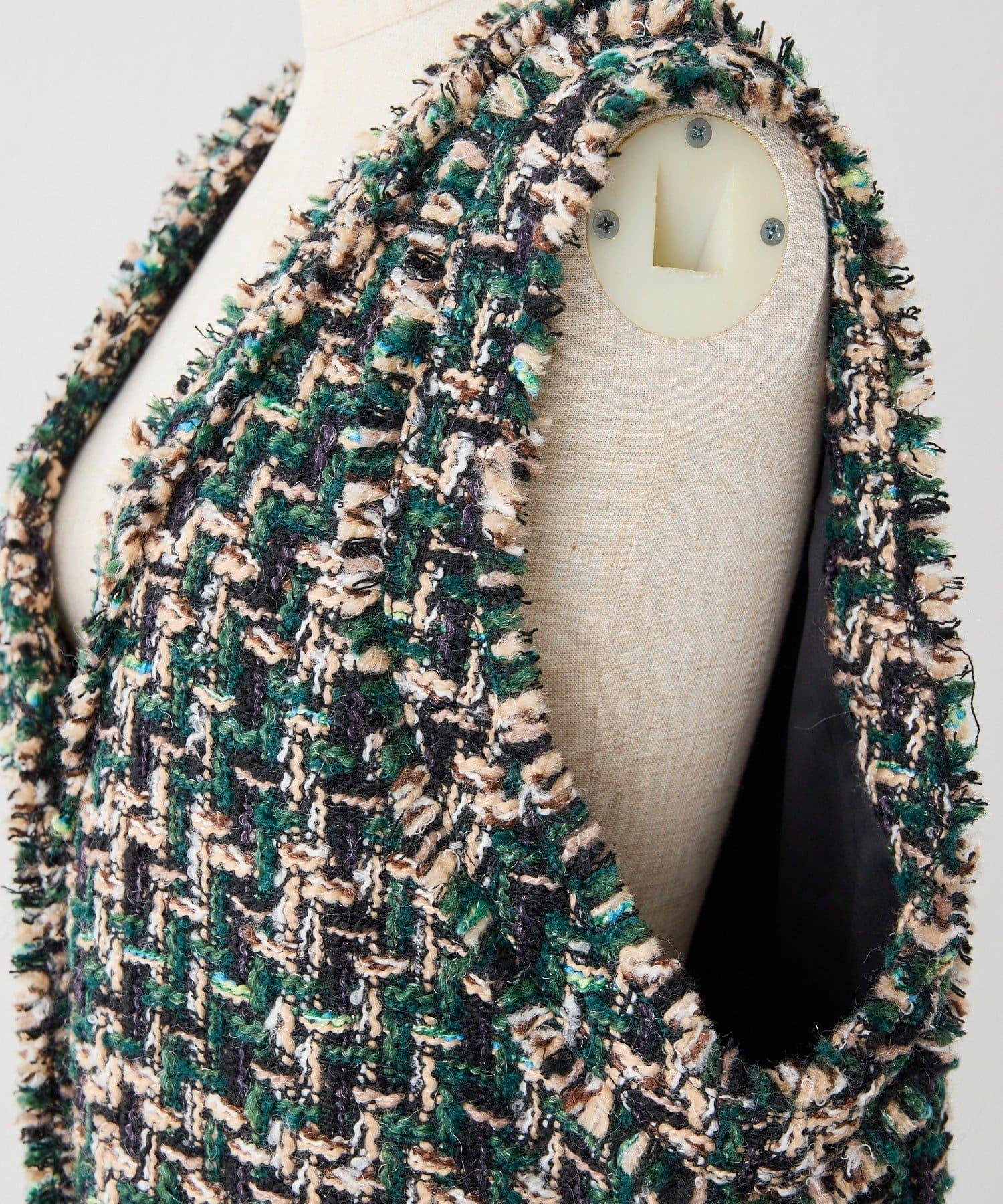 這款粗花呢馬甲以綠色為基調,由包括紗線在內的多種紗線組合而成。