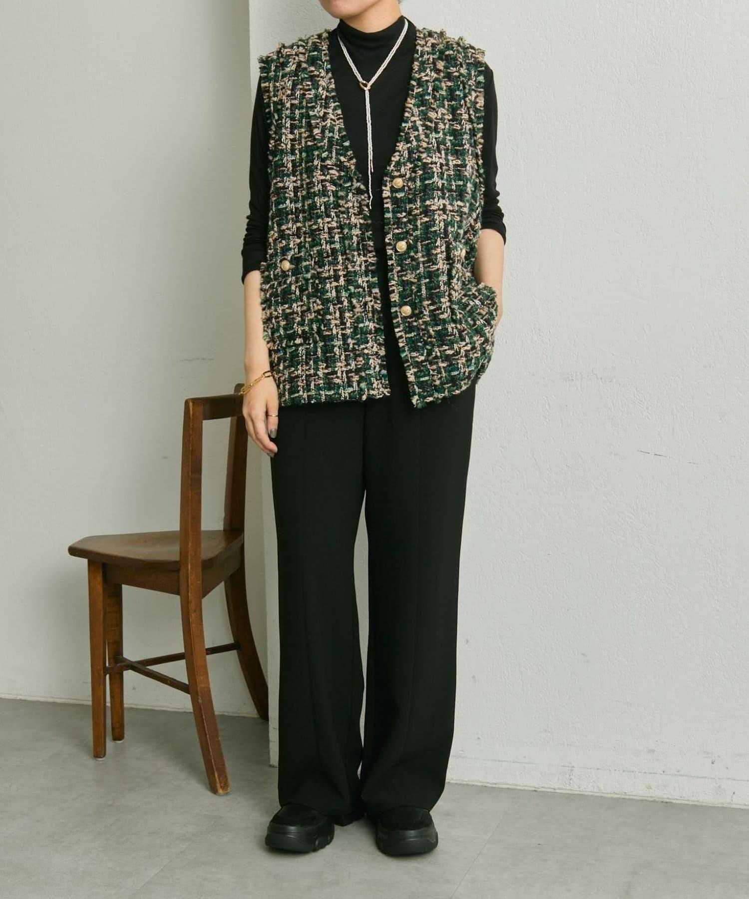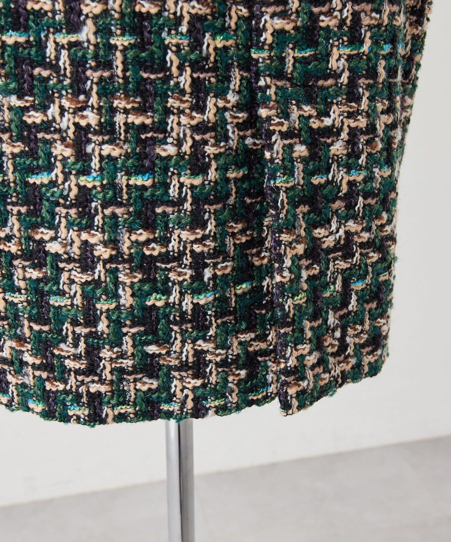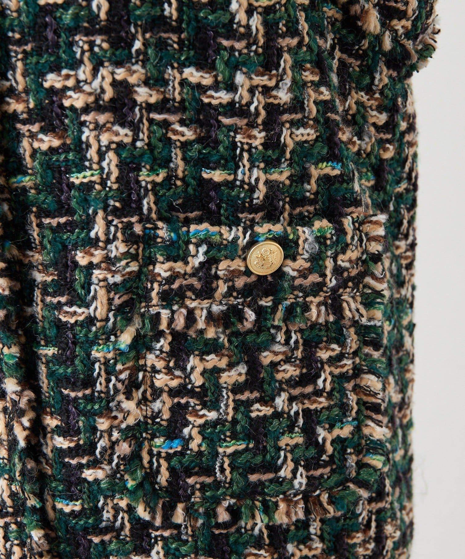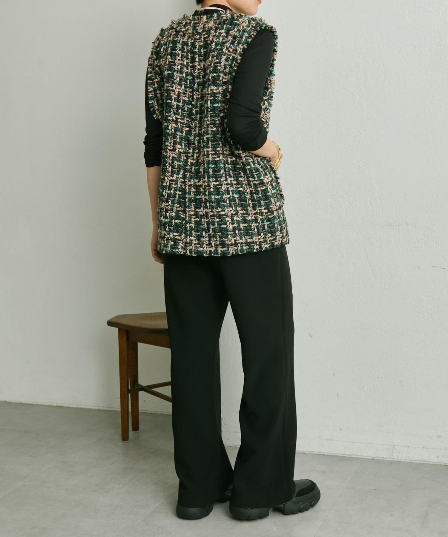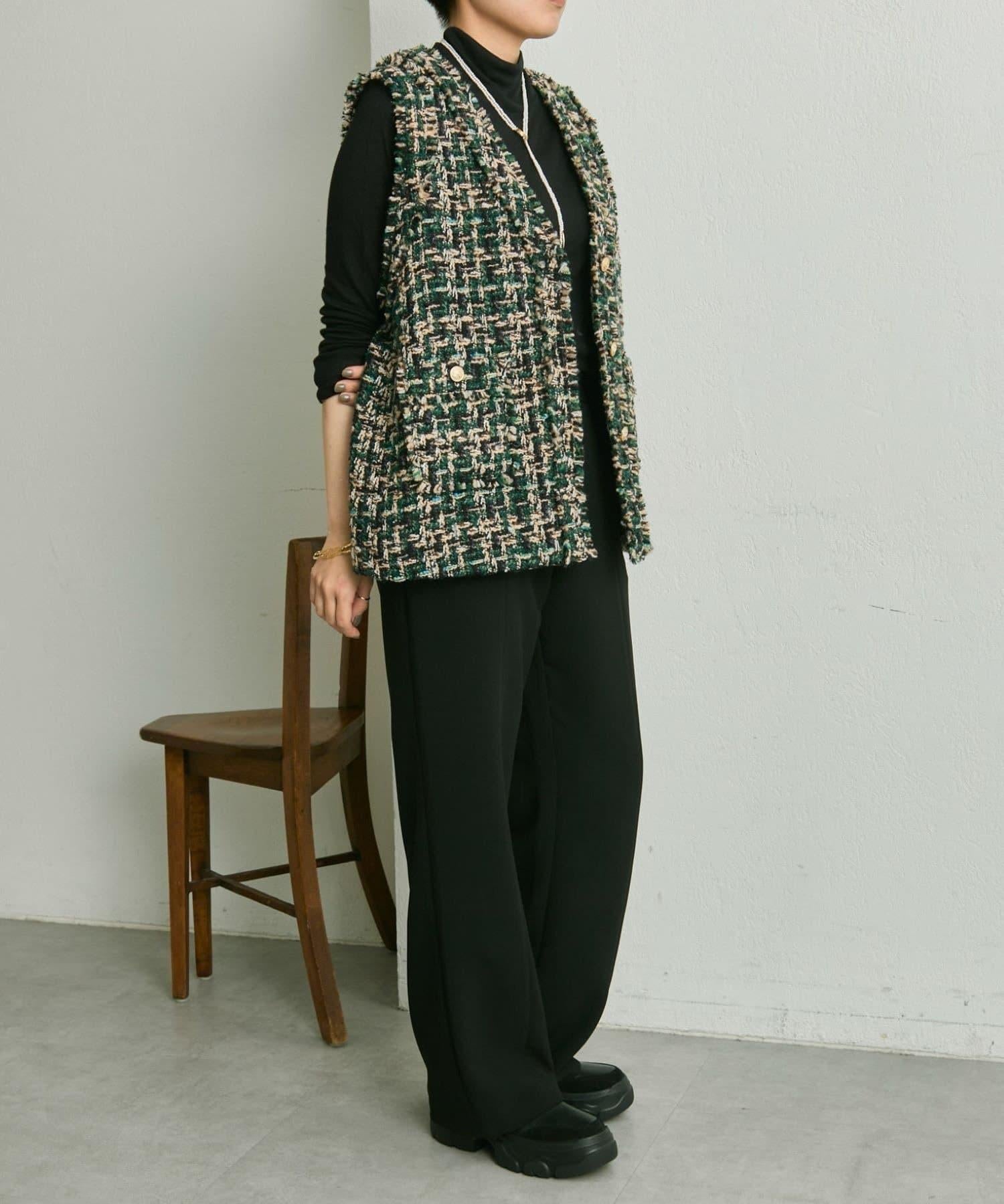 這款粗花呢馬甲以綠色為基調,由包括紗線在內的多種紗線組合而成。