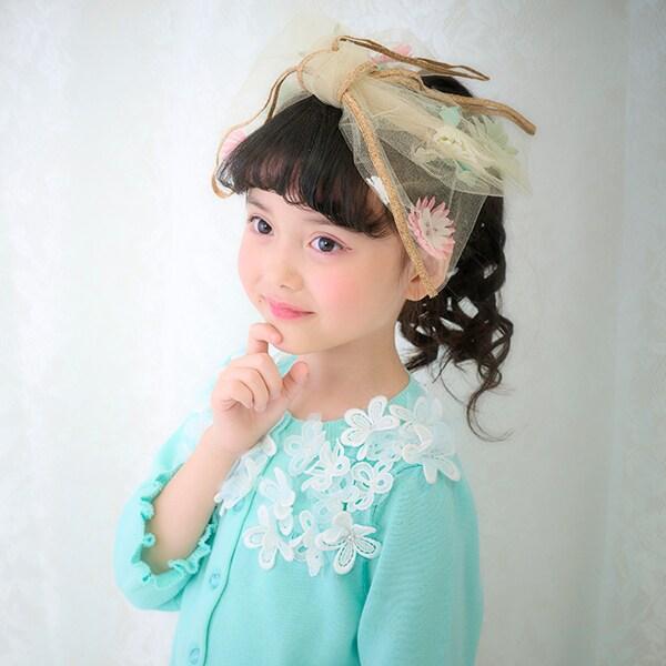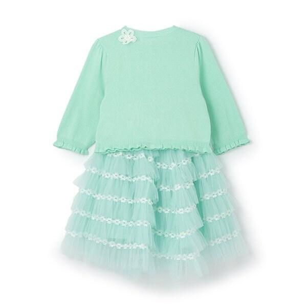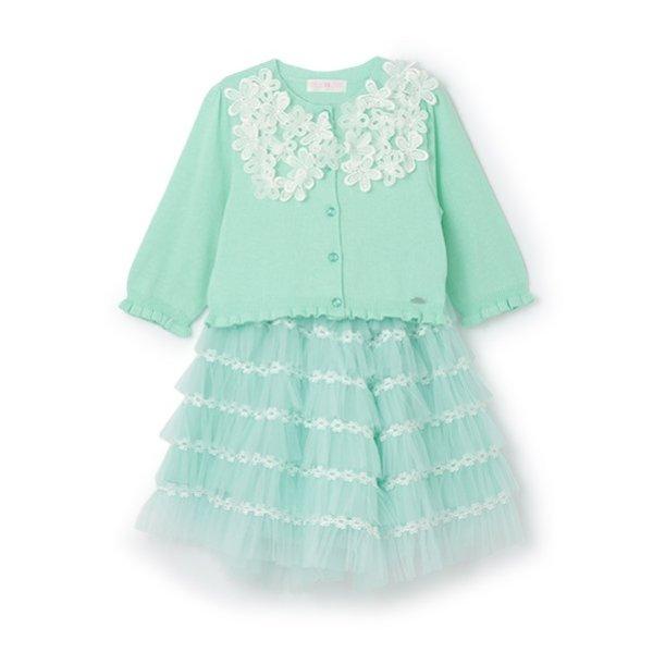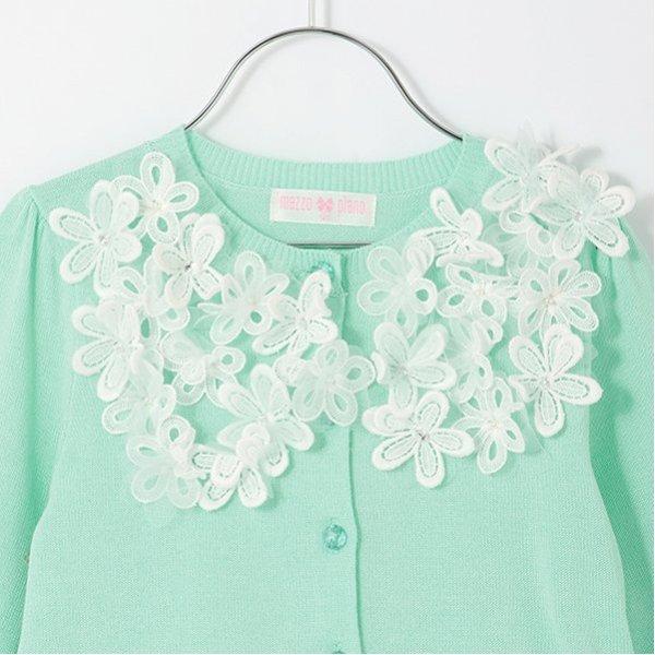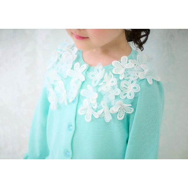 手工製作的開襟羊毛衫,領口處飾有兩種雛菊圖案的化學蕾絲疊加薄紗花朵造型的立體圖案。