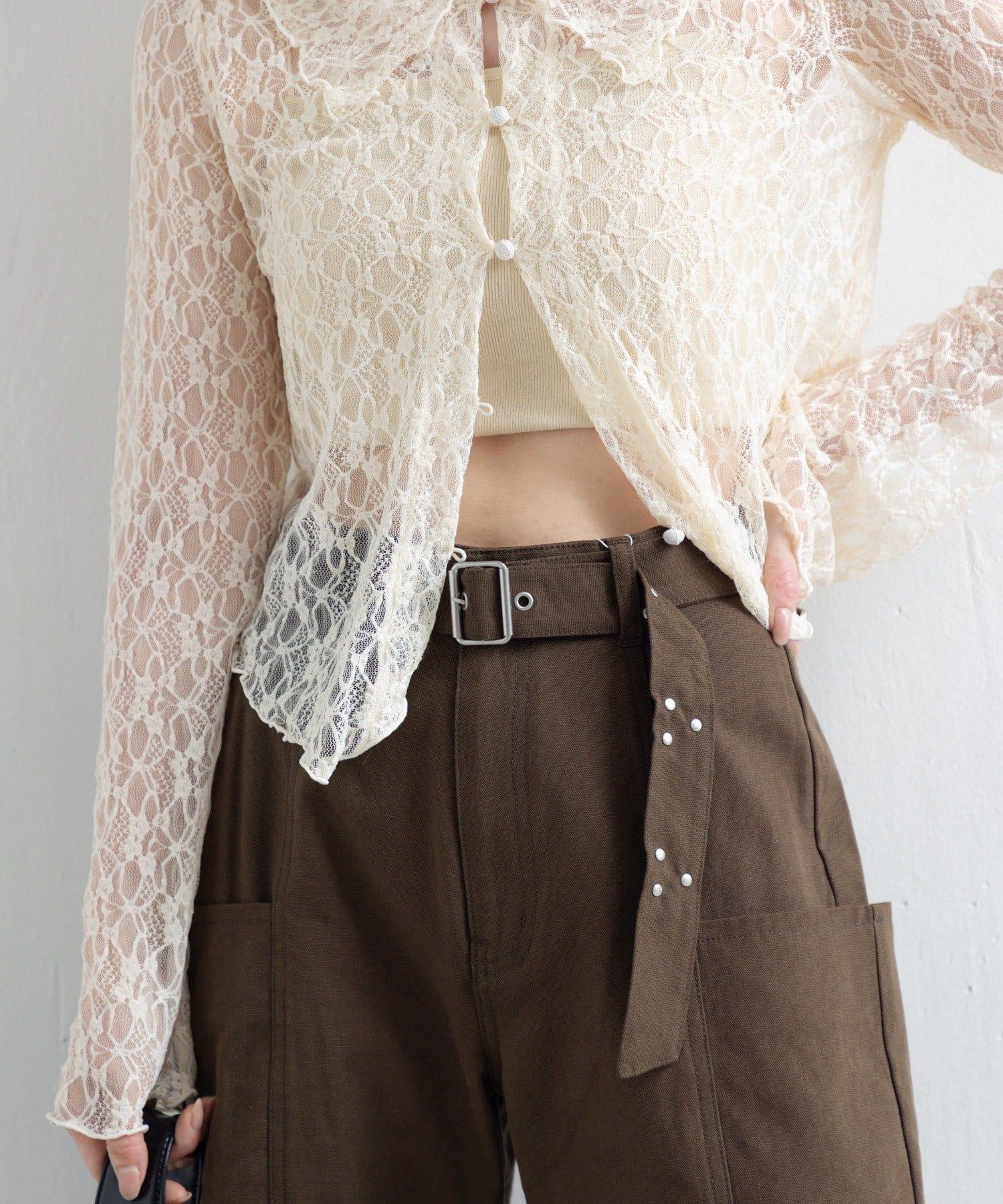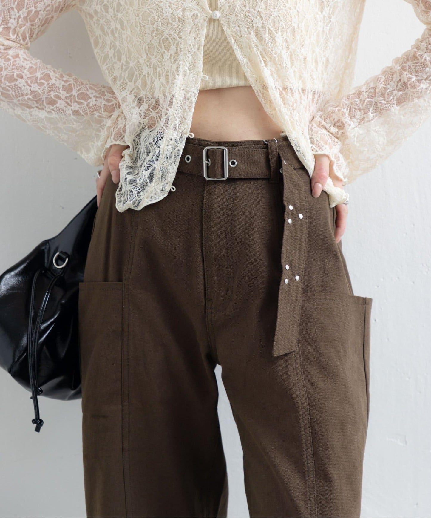 腰帶上的鉚釘為簡潔的剪裁增添了時尚氣息。