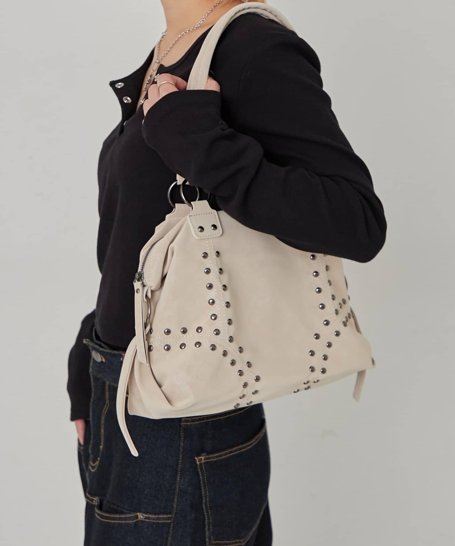 鉚釘為這款包增添了亮點,使其成為簡約搭配的參照物。