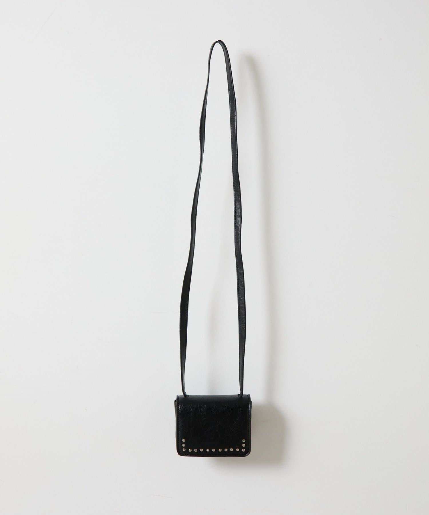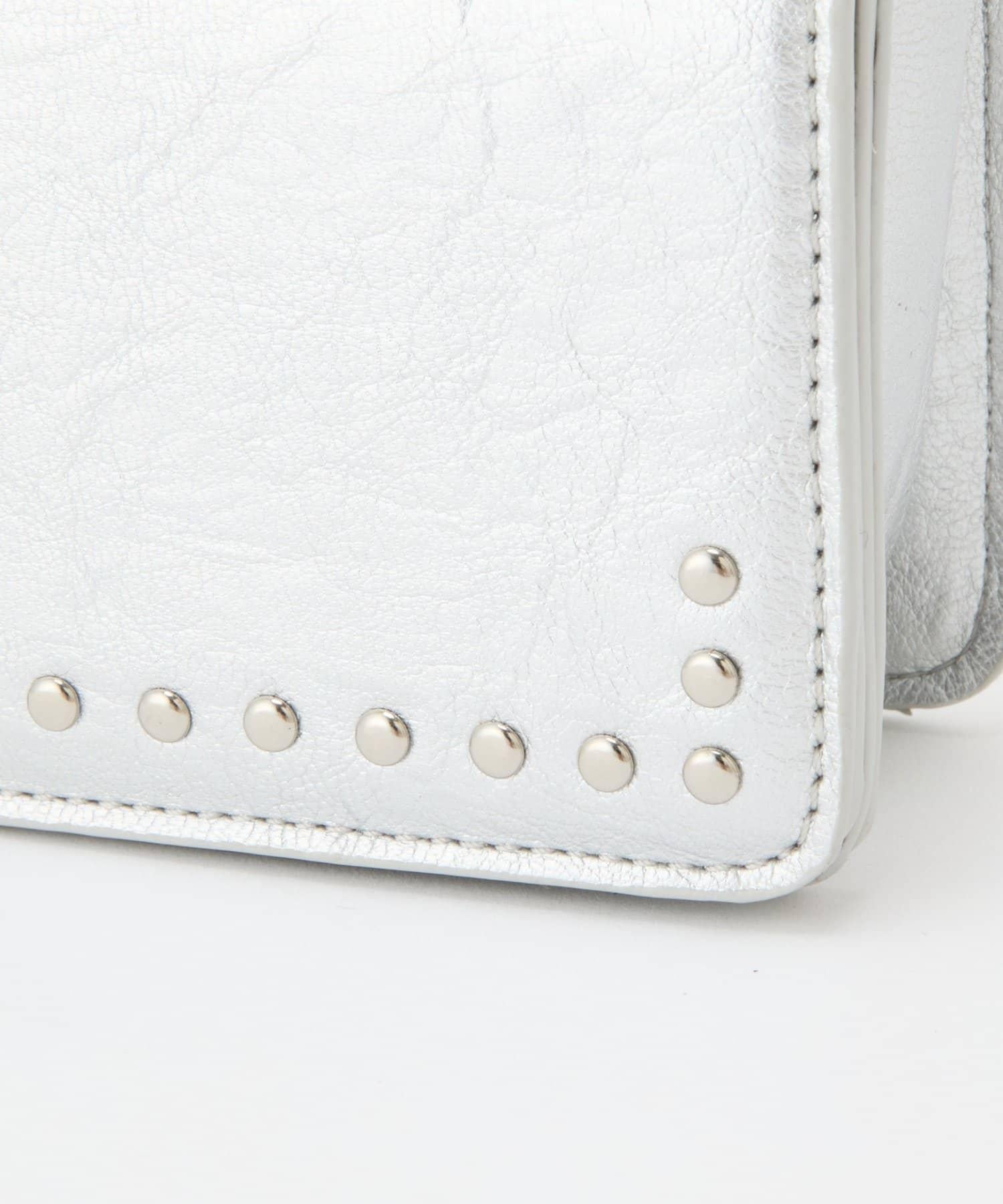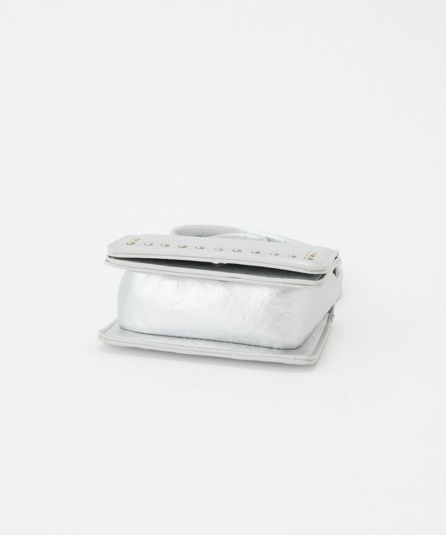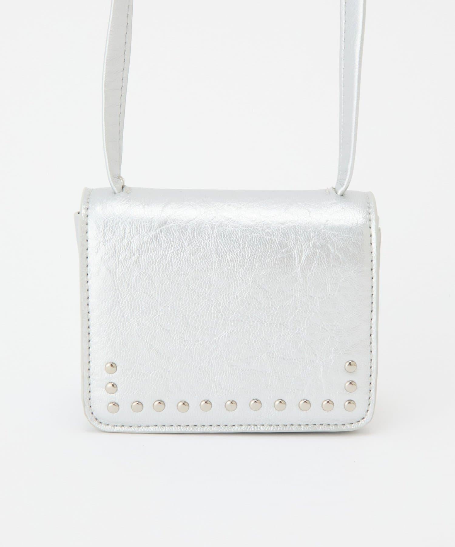 這款迷你單肩包體積小巧,飾有銀色鉚釘。