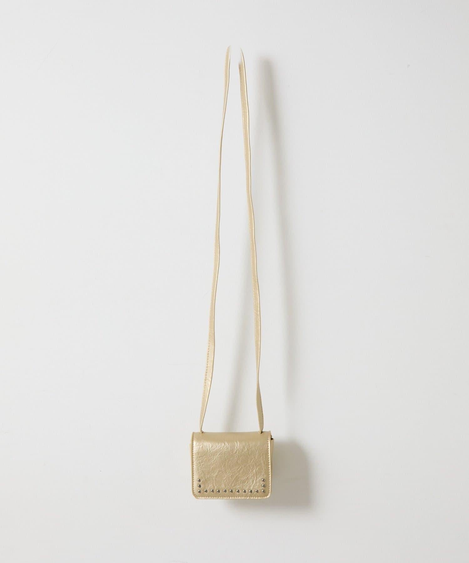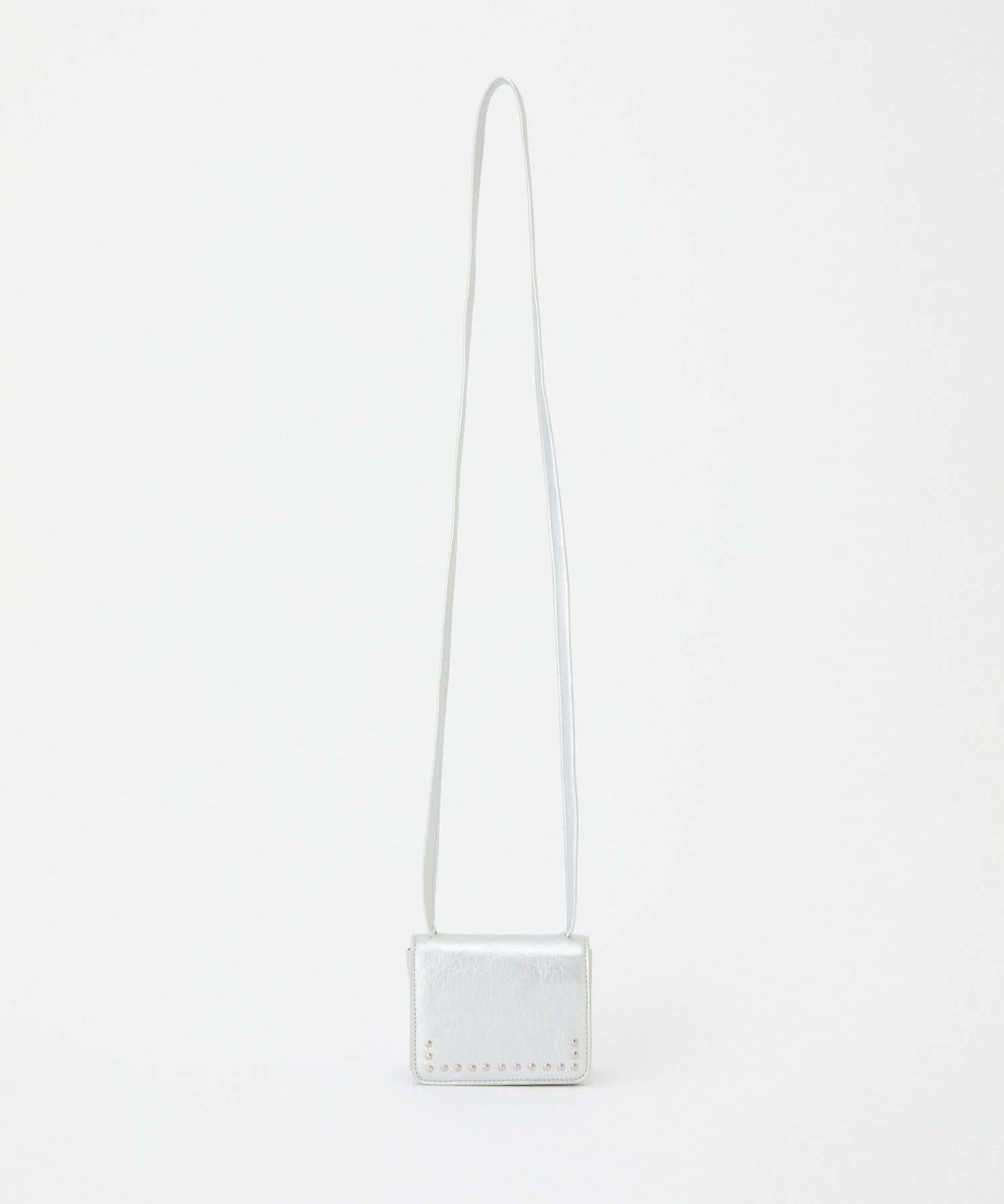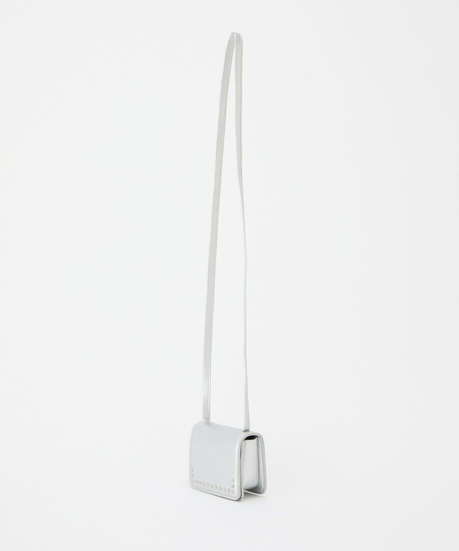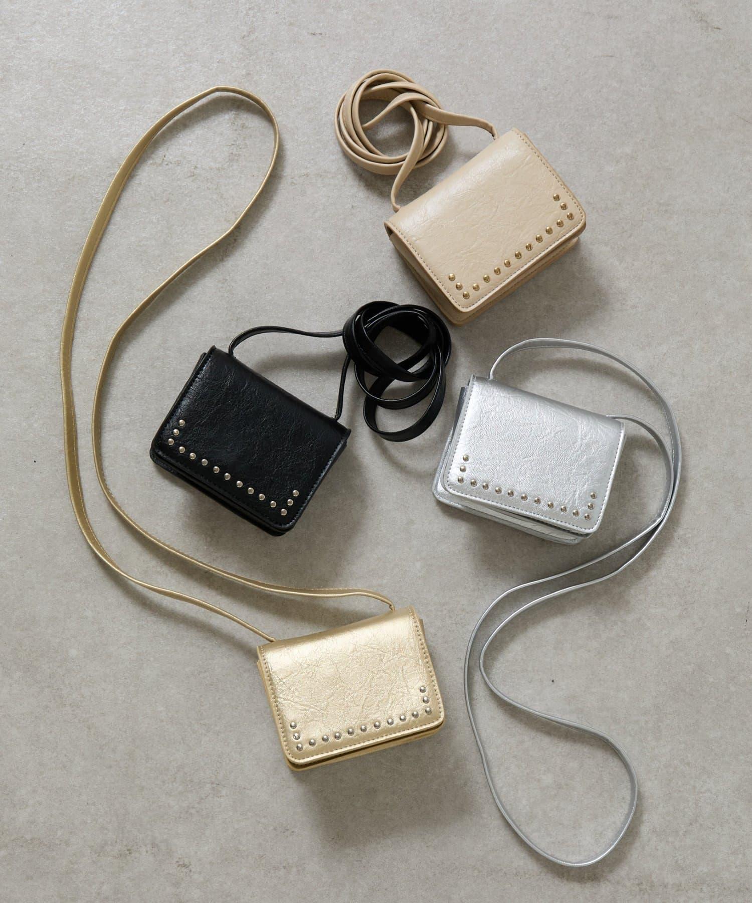 這款迷你單肩包體積小巧,飾有銀色鉚釘。