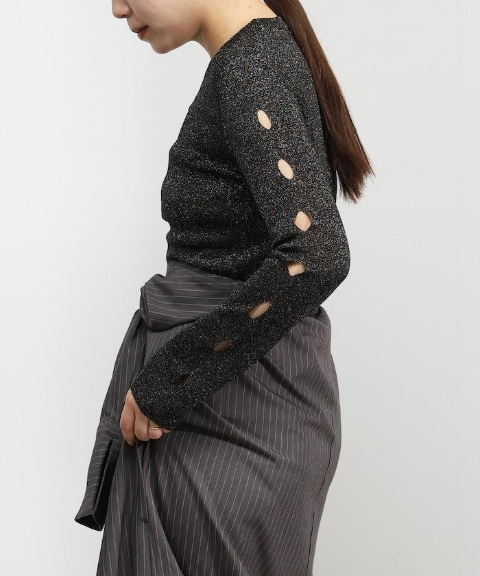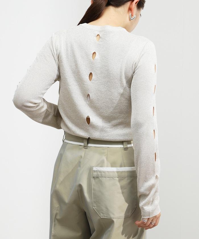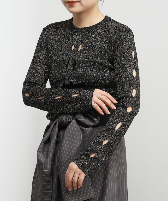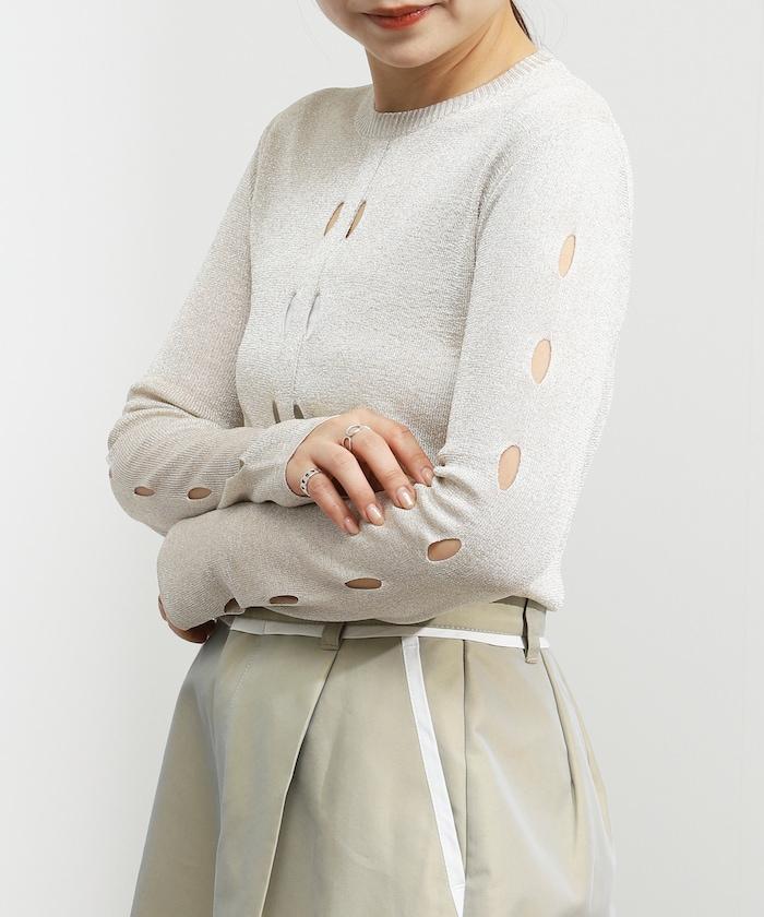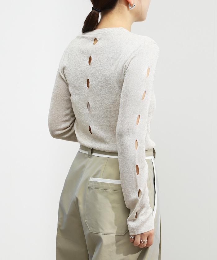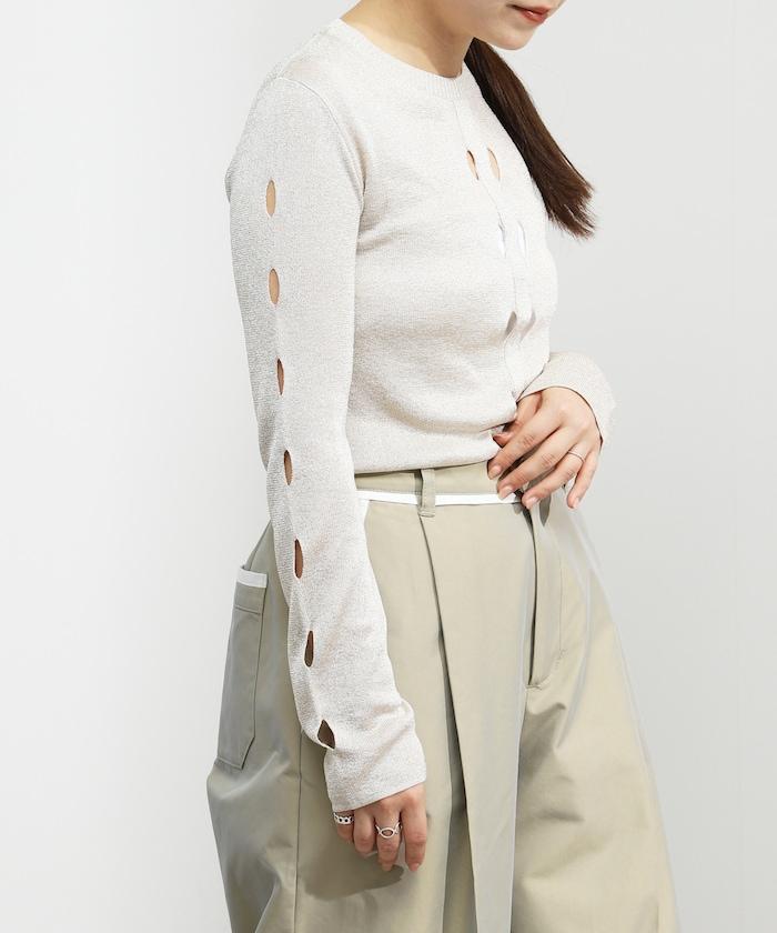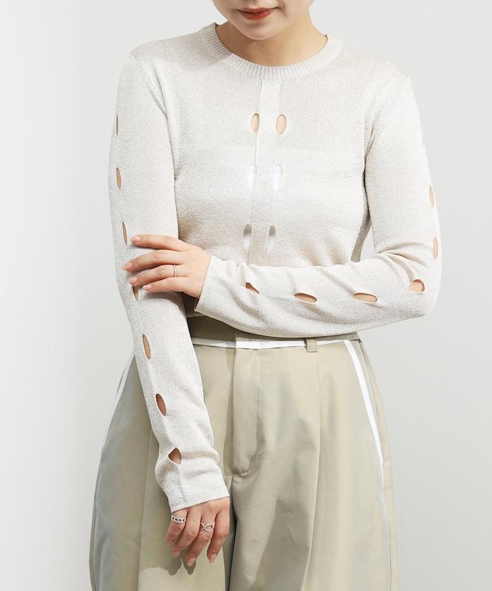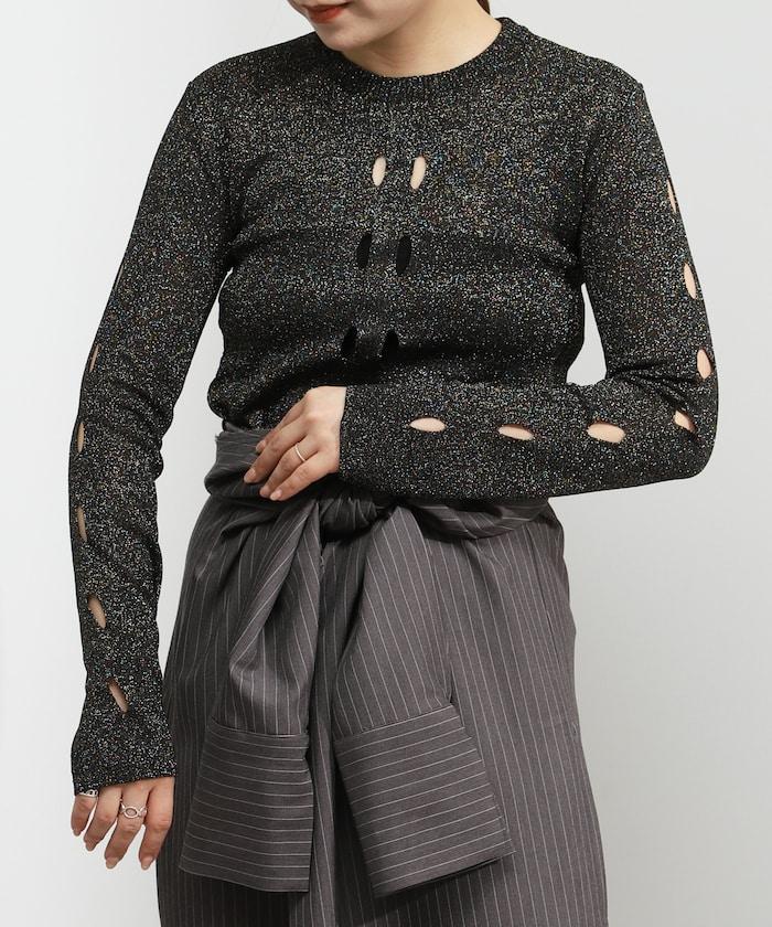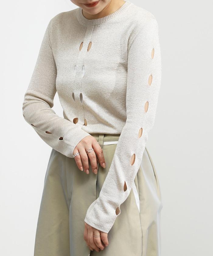 設計感十足的薄紗針織上衣,開衩呈線條狀。