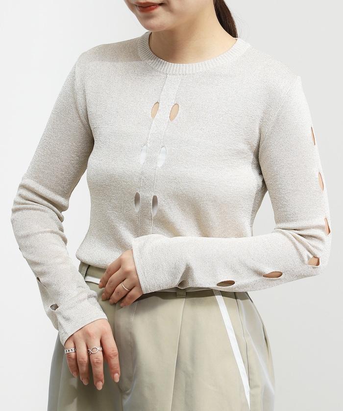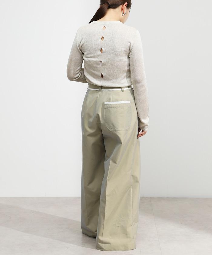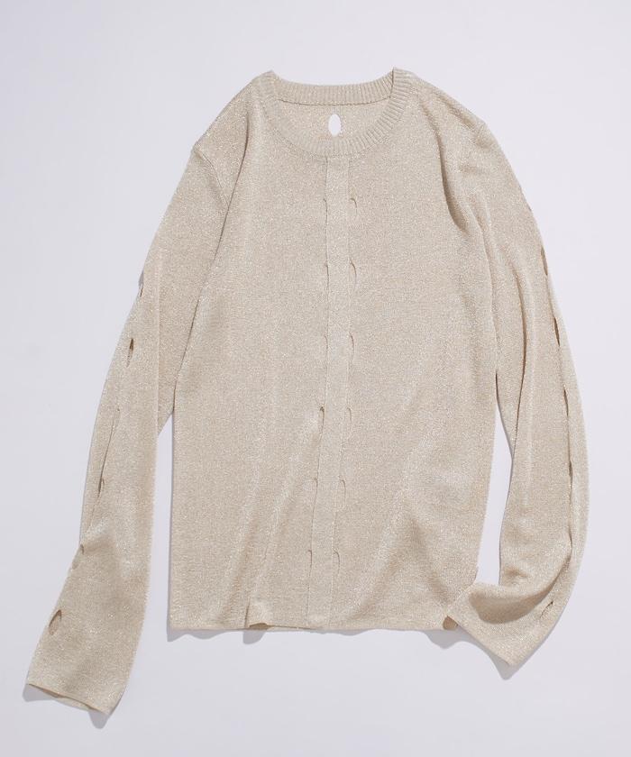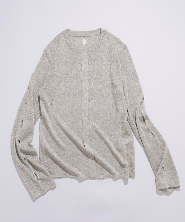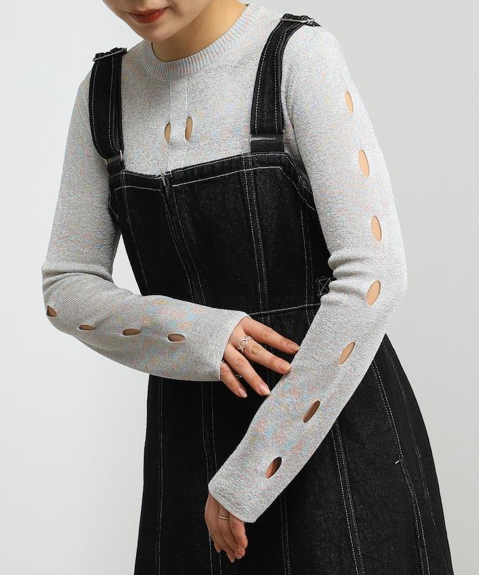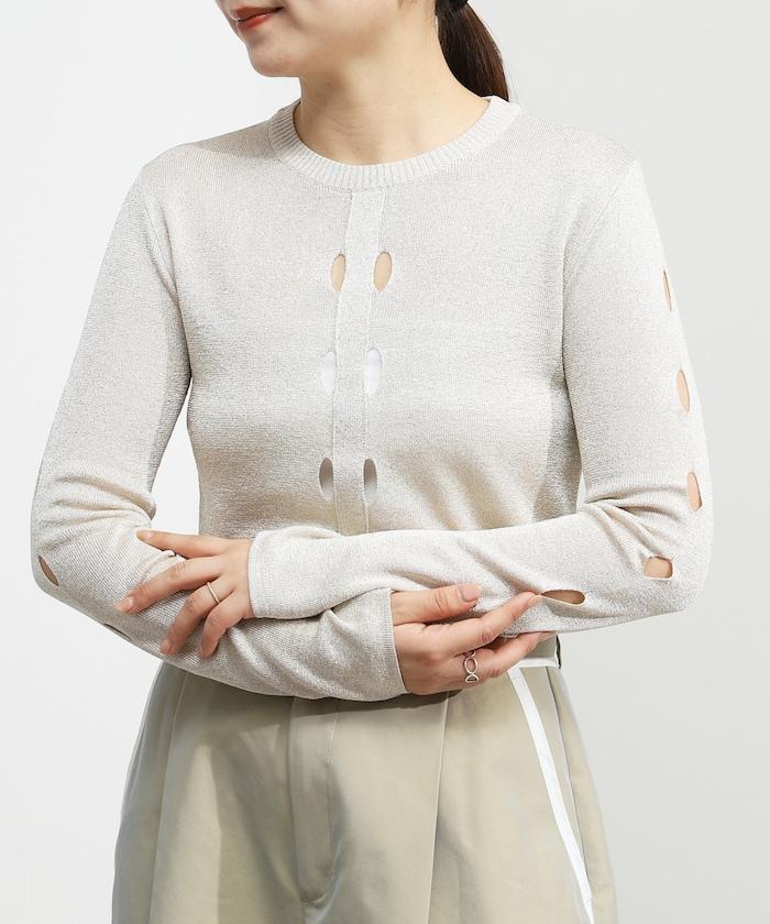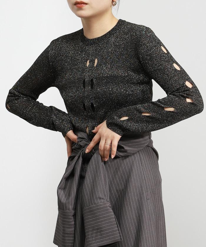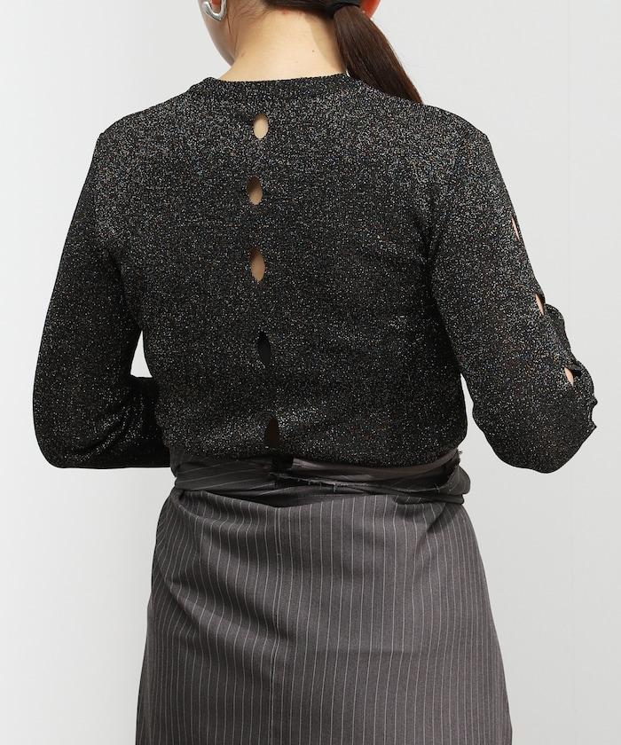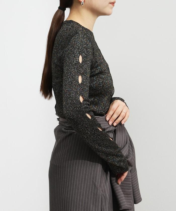 設計感十足的薄紗針織上衣,開衩呈線條狀。