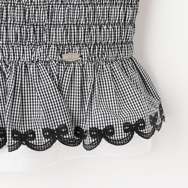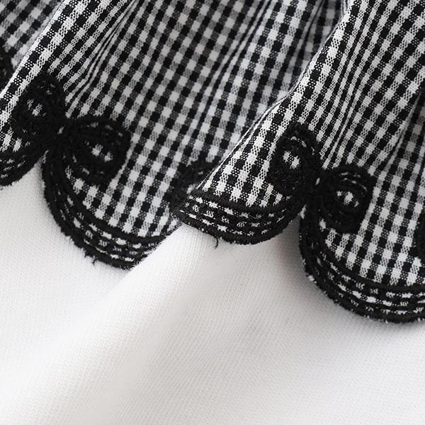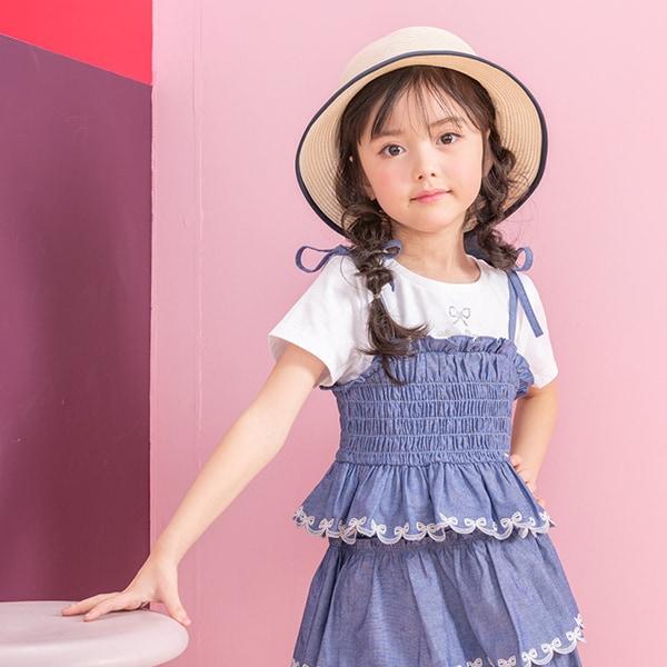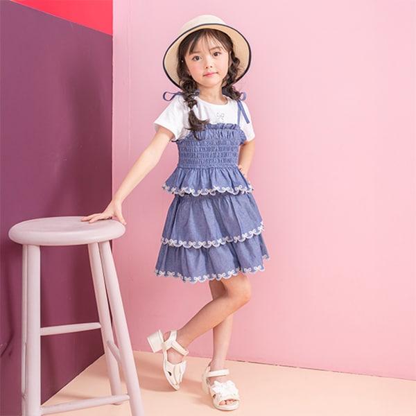 吊帶長衫和短袖 T 恤套裝,帶有可愛的絲帶圖案蕾絲靈感鏤空刺繡。