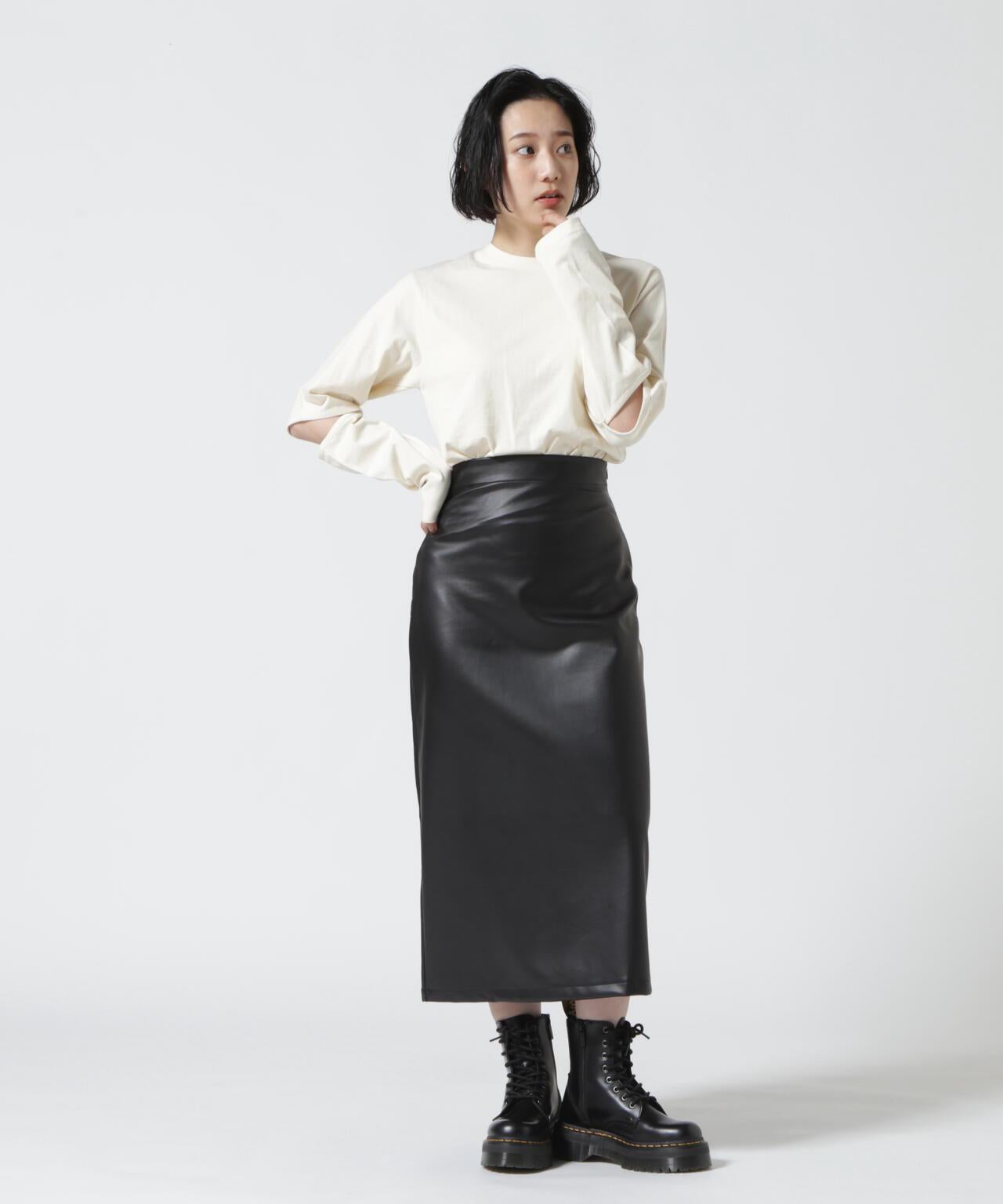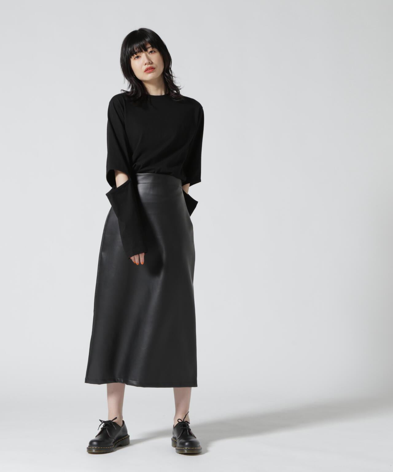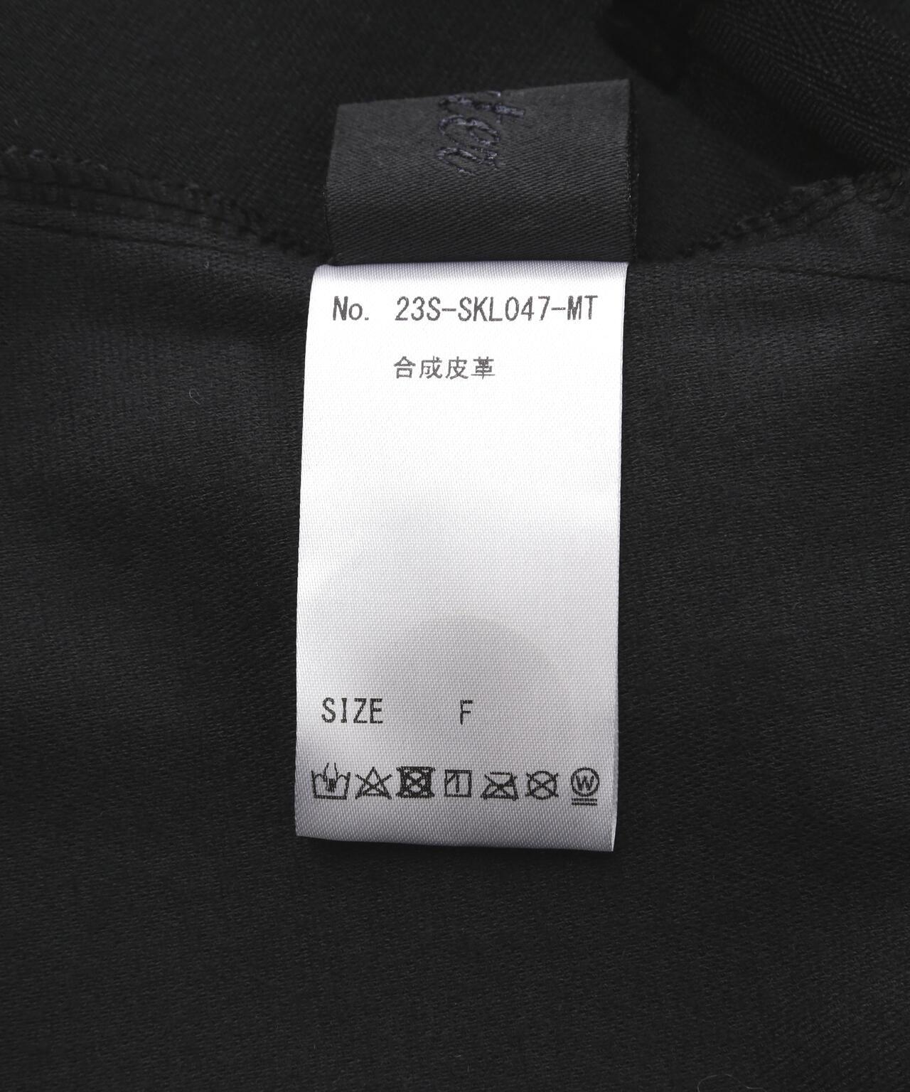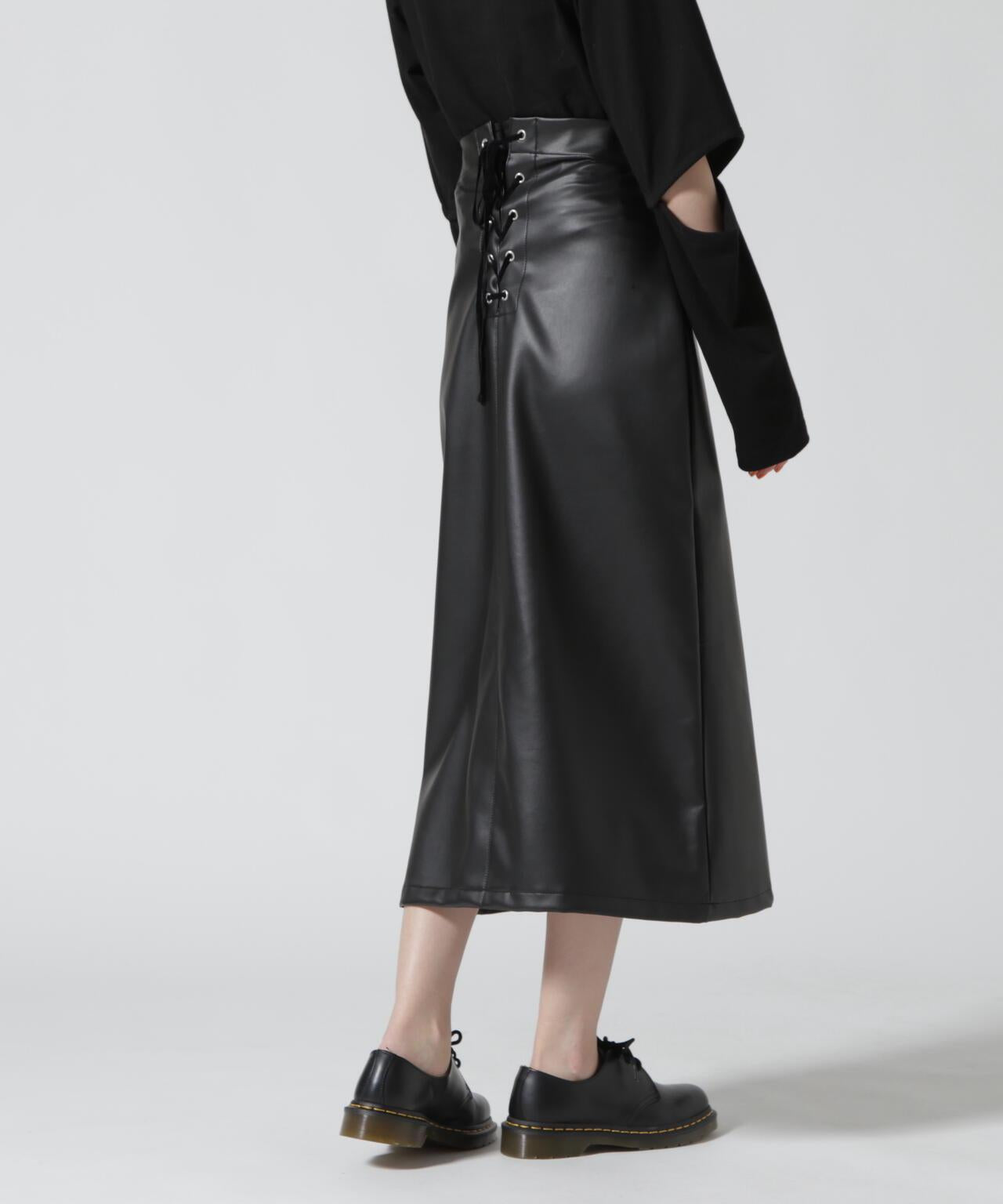 長裙,後部有繫帶裝飾。採用質地堅韌、富有彈性的 PU 皮革製成,穿著極為舒適。質地簡單,可搭配襯衫、剪裁和縫紉等各種上衣。muter......是一個新造的詞,由材料、多面性(multifaceted)等詞組合而成。當多方面的元素結合在一起時,個性也就完成了。創立該品牌的目的是希望成為穿著者 "個性/材料的一部分",而不受形式的束縛。