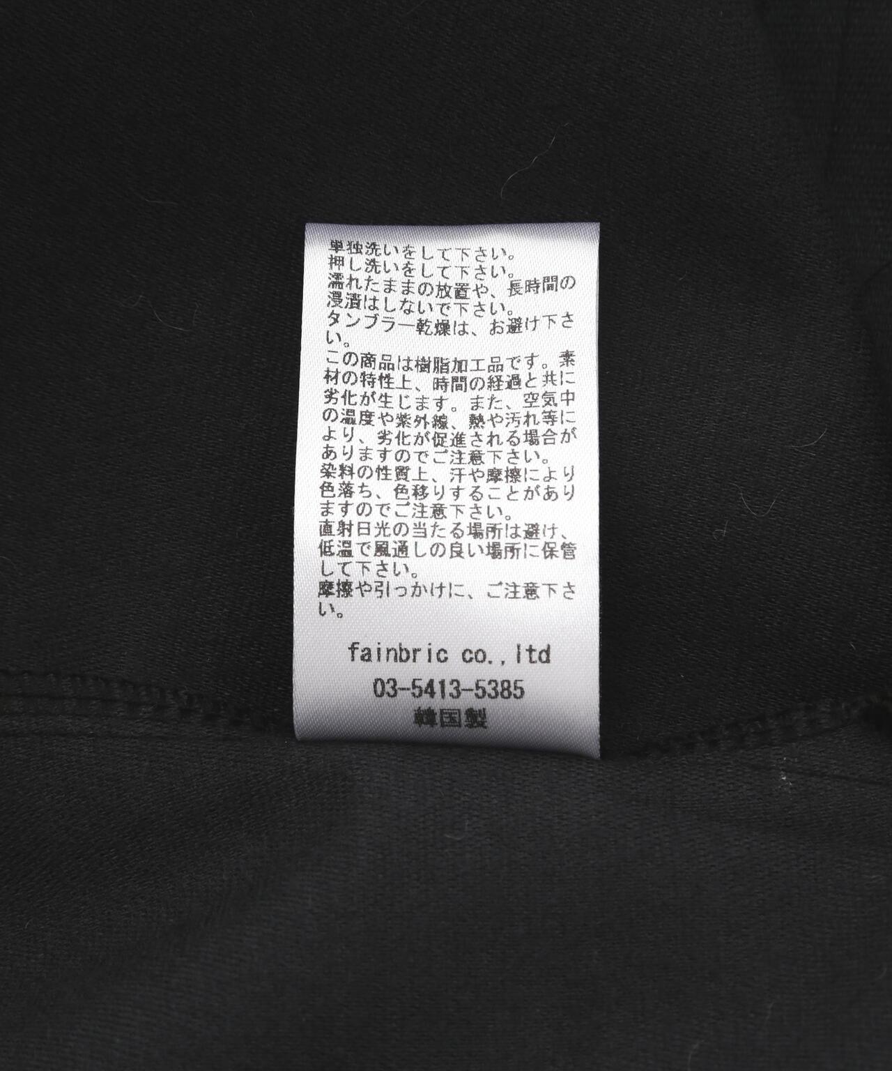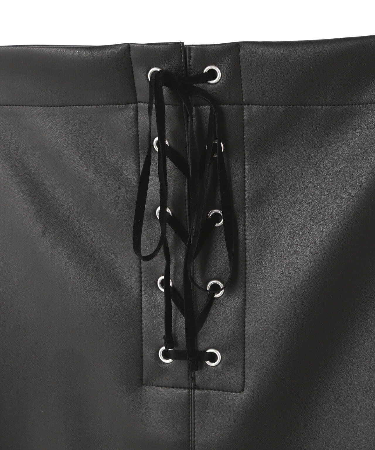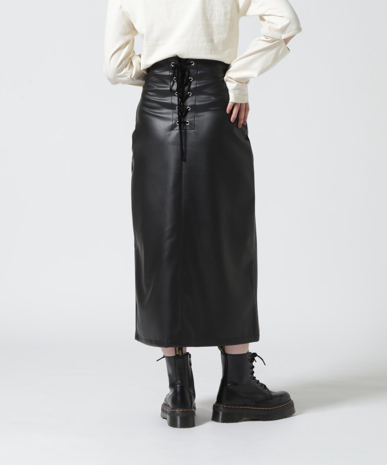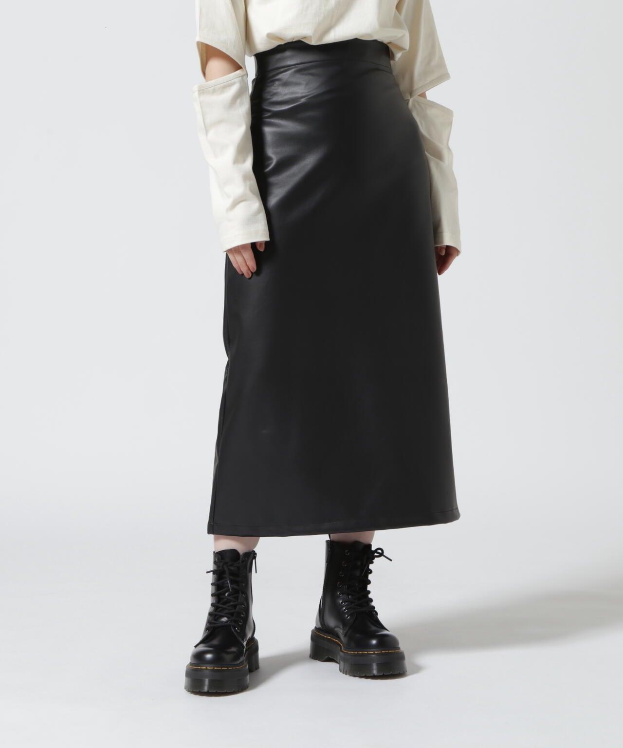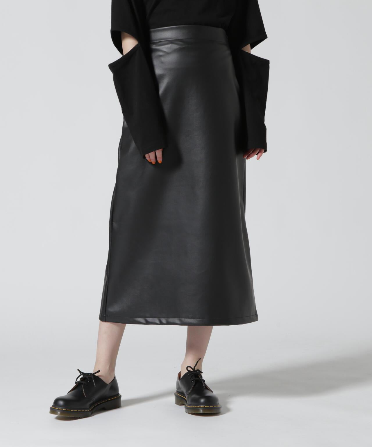 長裙,後部有繫帶裝飾。採用質地堅韌、富有彈性的 PU 皮革製成,穿著極為舒適。質地簡單,可搭配襯衫、剪裁和縫紉等各種上衣。muter......是一個新造的詞,由材料、多面性(multifaceted)等詞組合而成。當多方面的元素結合在一起時,個性也就完成了。創立該品牌的目的是希望成為穿著者 "個性/材料的一部分",而不受形式的束縛。