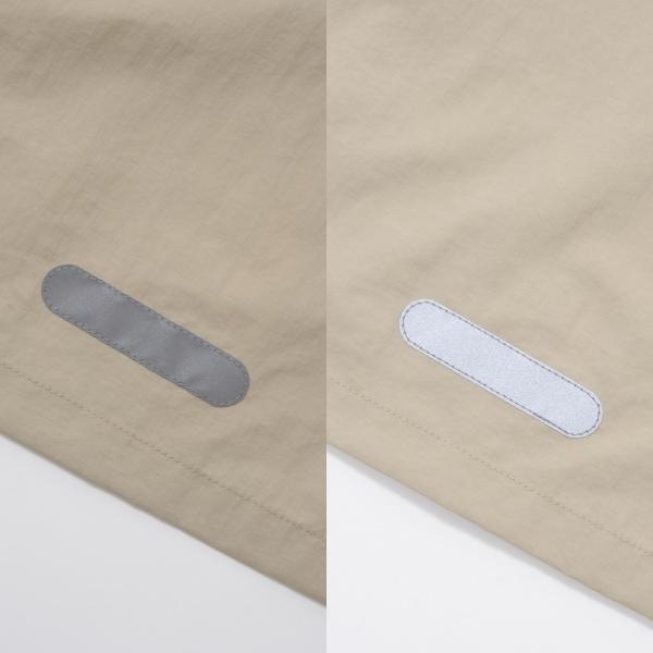 前下襬有一個編織名稱,後下擺有一個反光板,可在黑暗中反射光線。