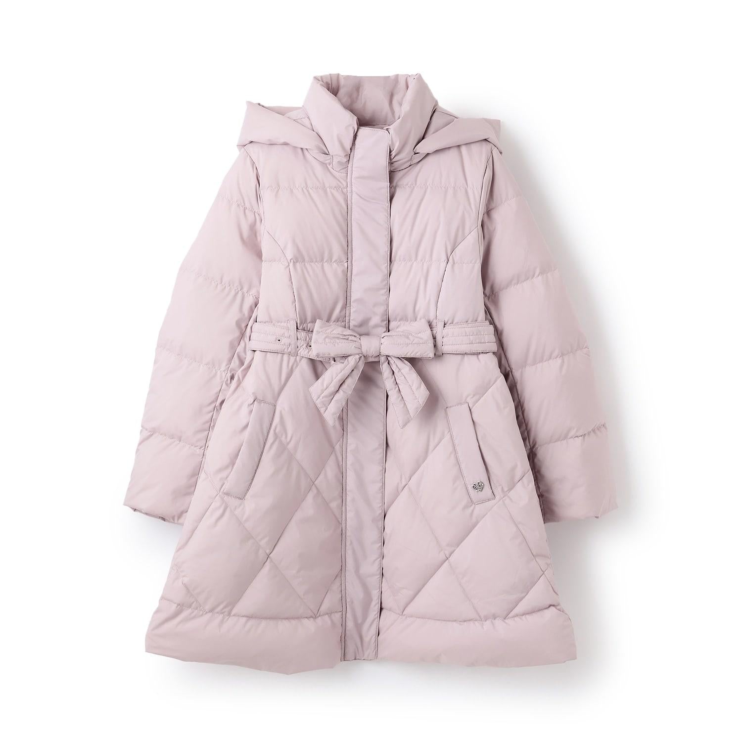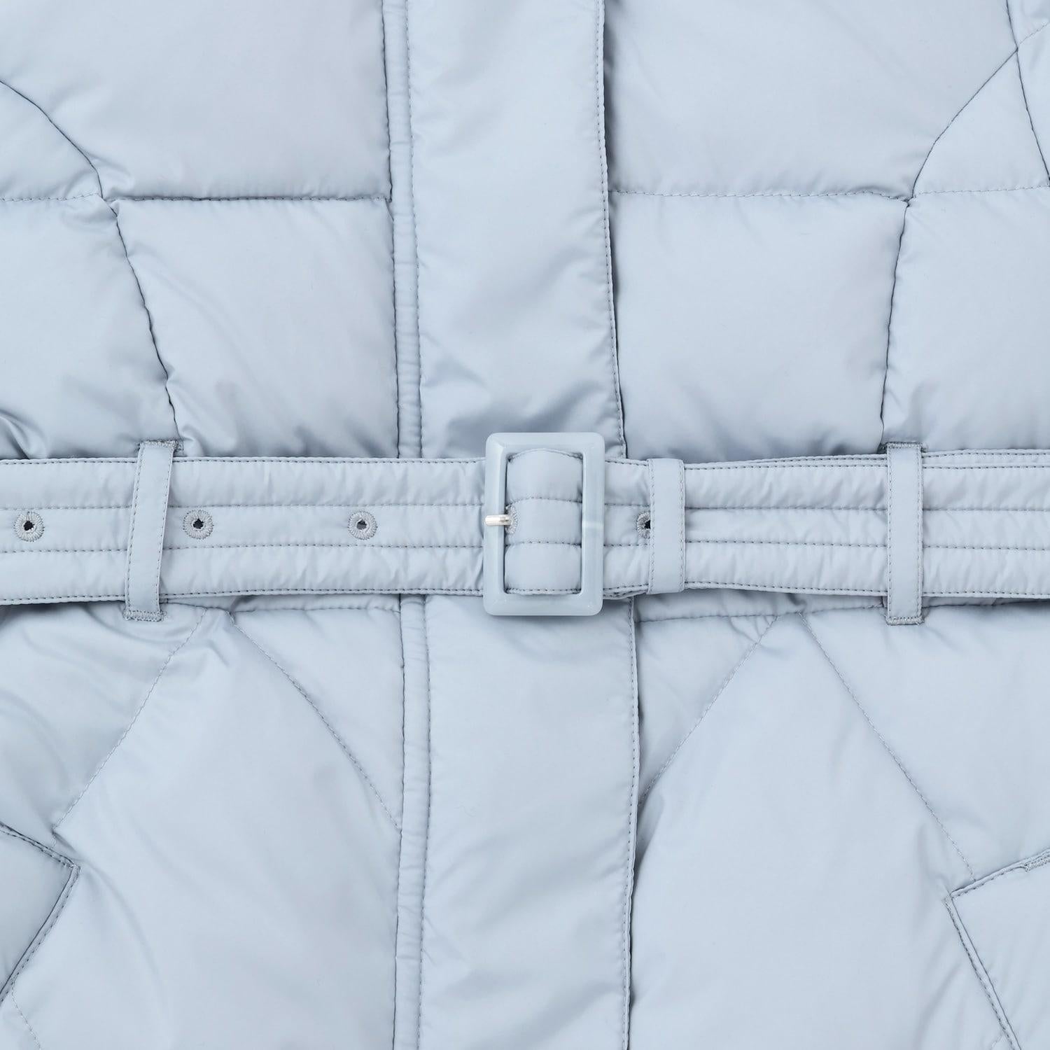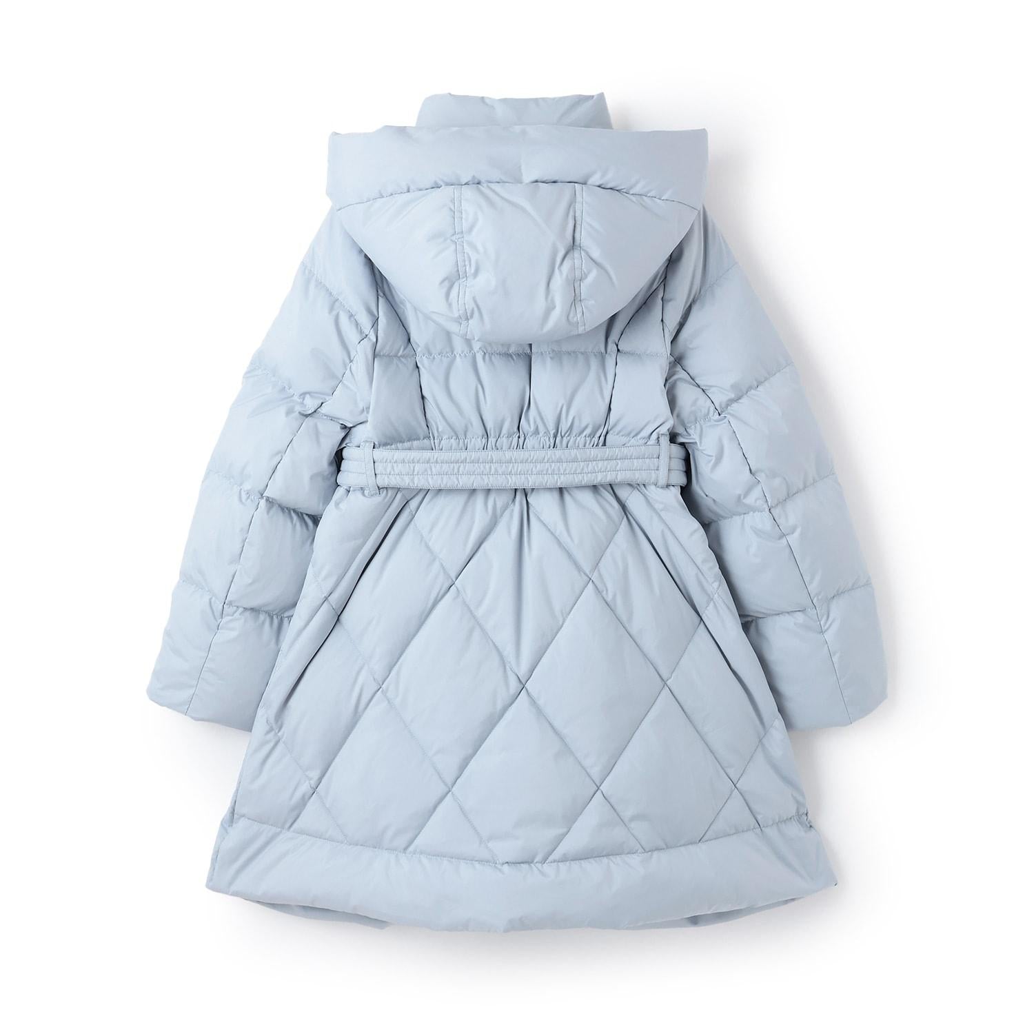 這款長款羽絨服輪廓優美,配有優雅的絲帶。
