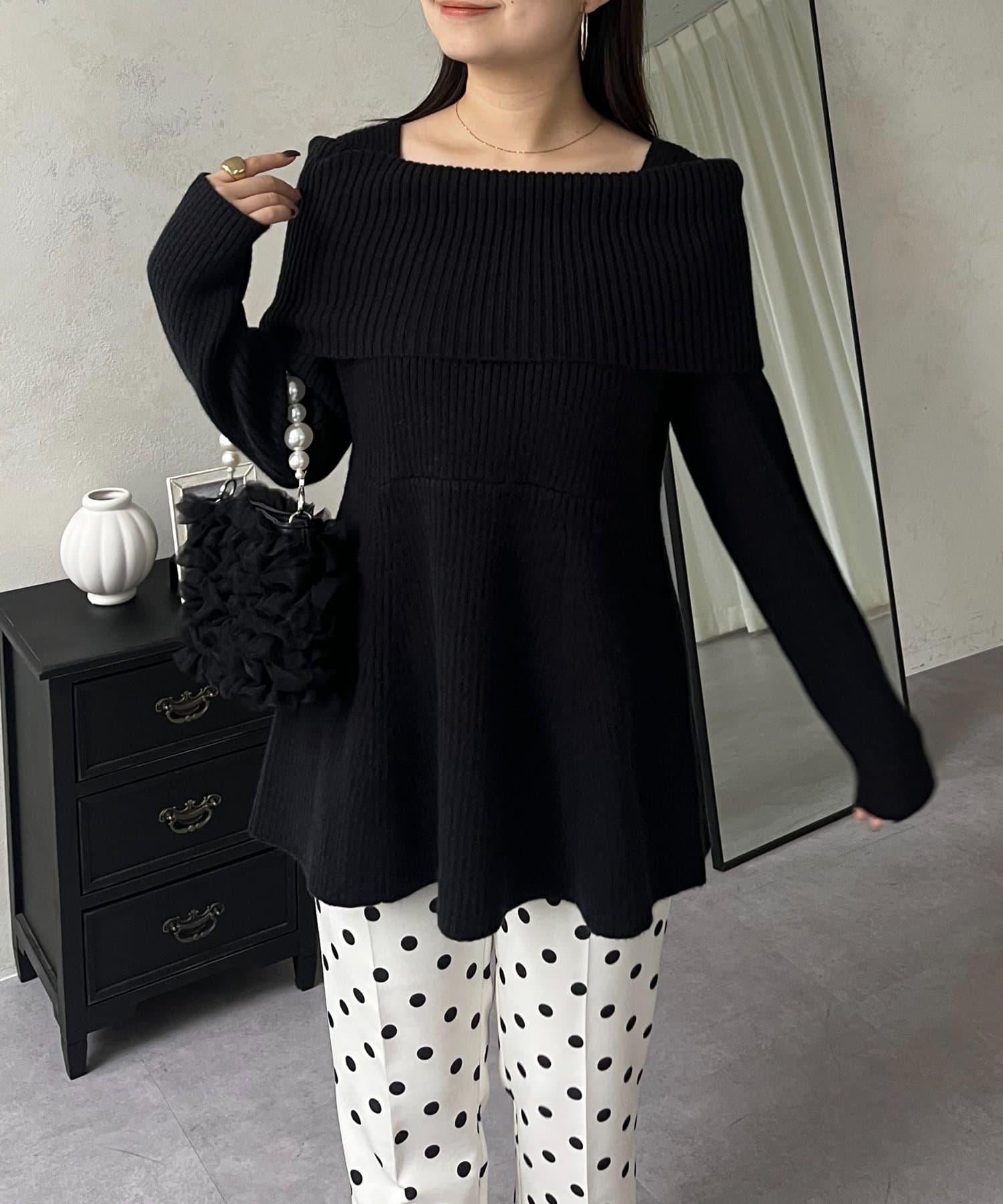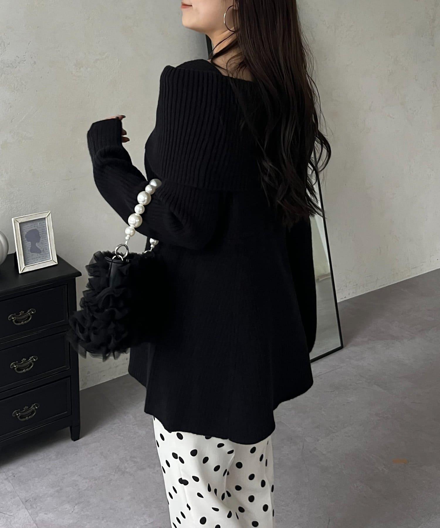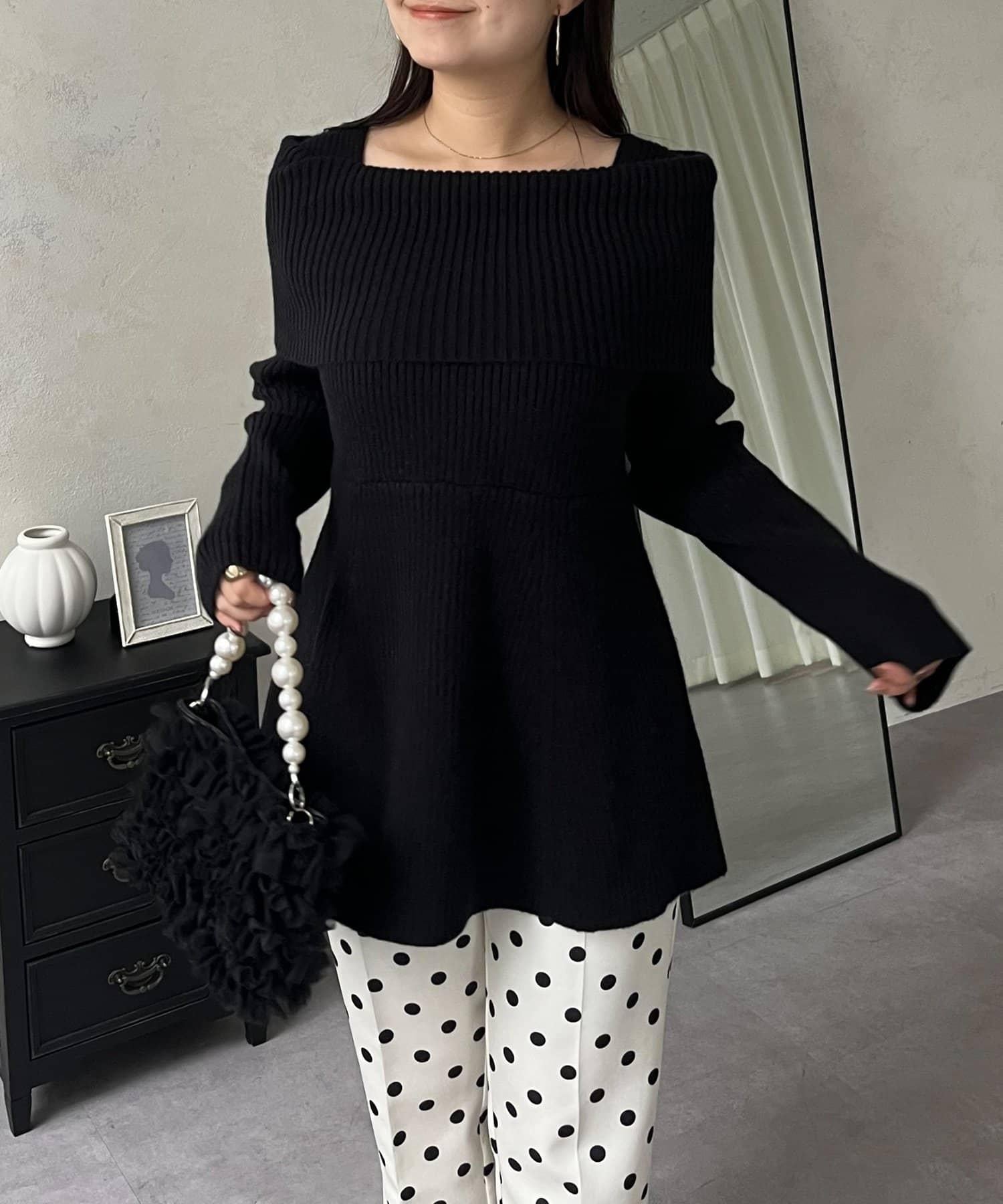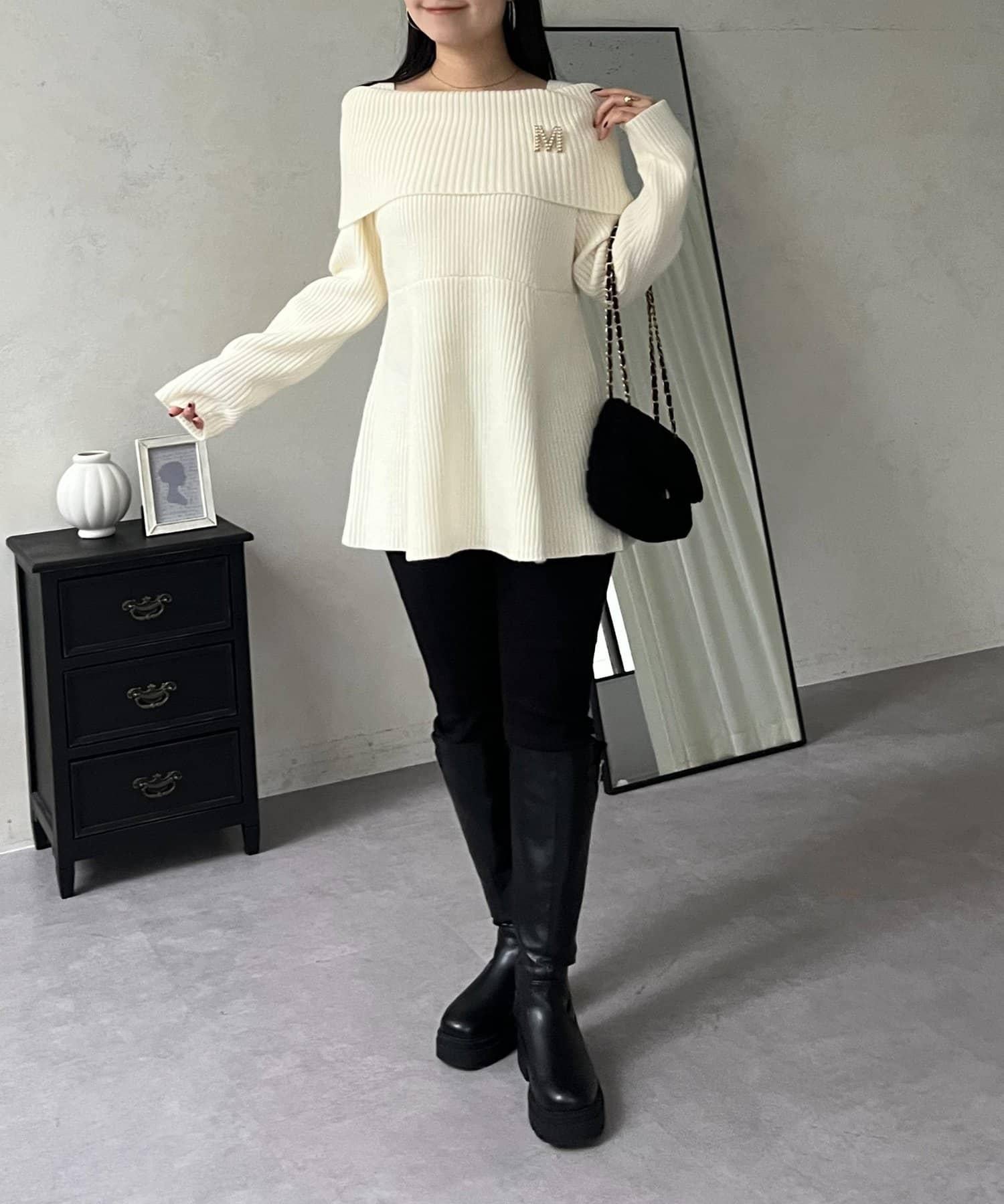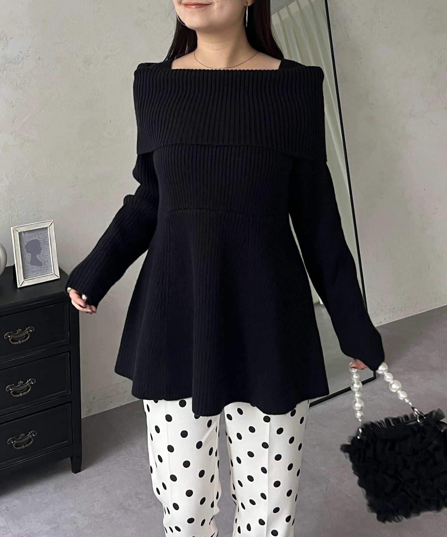 預約商品【防靜電】一字肩荷葉邊針織衫